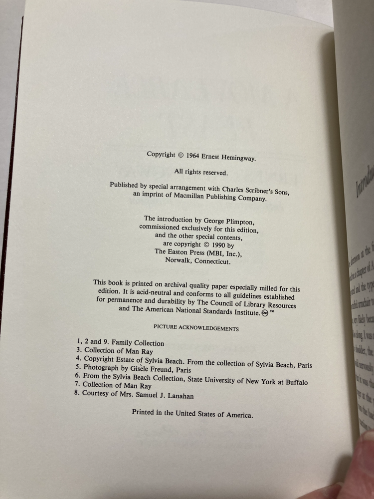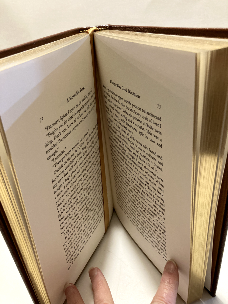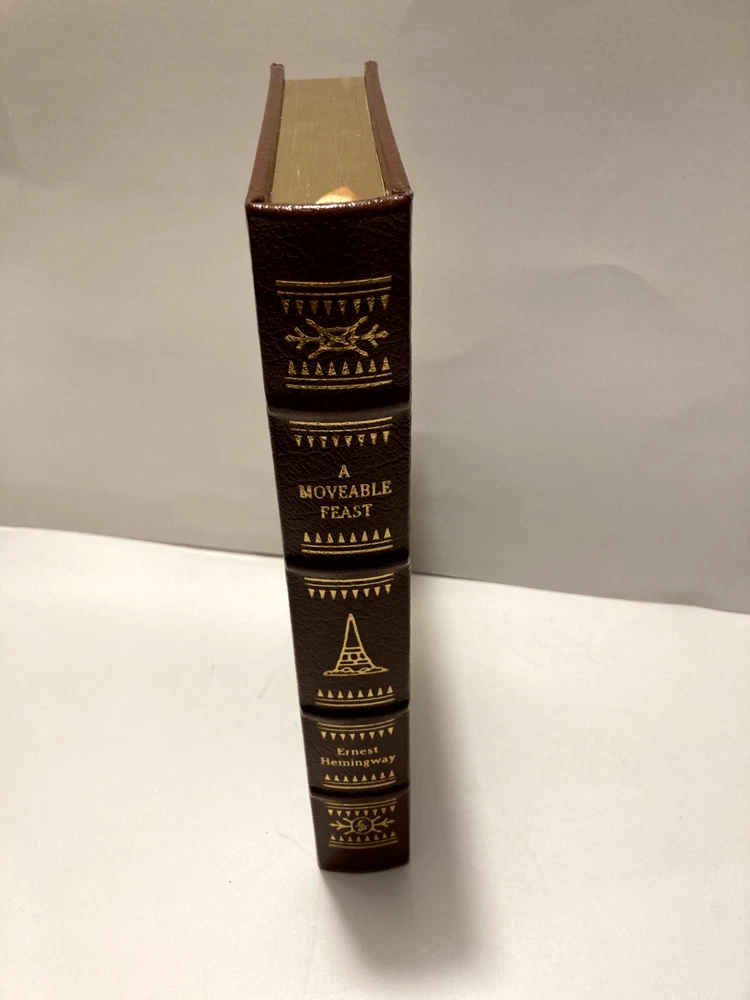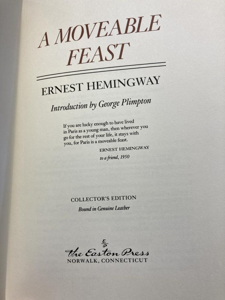 Hardcover. Collectors' Edition. Leather binding; 22kt gold accents deeply inlaid on the "hubbed" spine; gilt illustration on the front board; text block is gilt edged; satin moire endsheets; silk ribbon bookmark. Printed on acid-neutral paper that lasts for generations. A Moveable Feast is a 1964 memoir by American author Ernest Hemingway about his years as a struggling expatriate journalist and writer in Paris during the 1920s. It was published posthumously. The introduction of this 1990 collectible edition by Easton Press was written by George Plimpton.