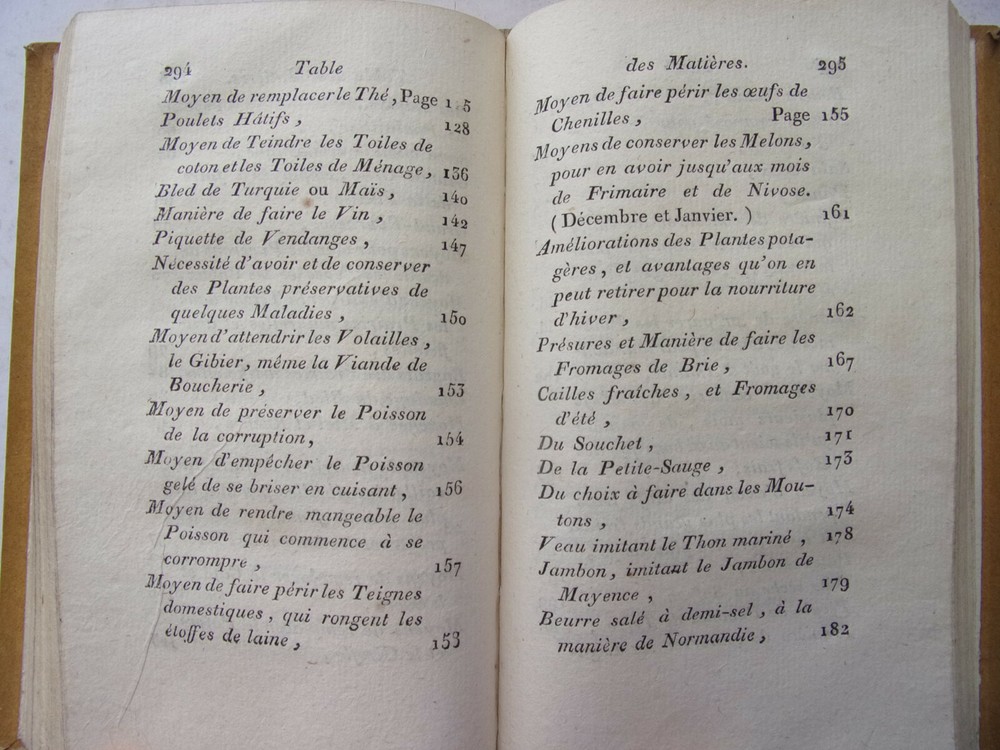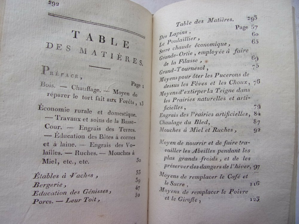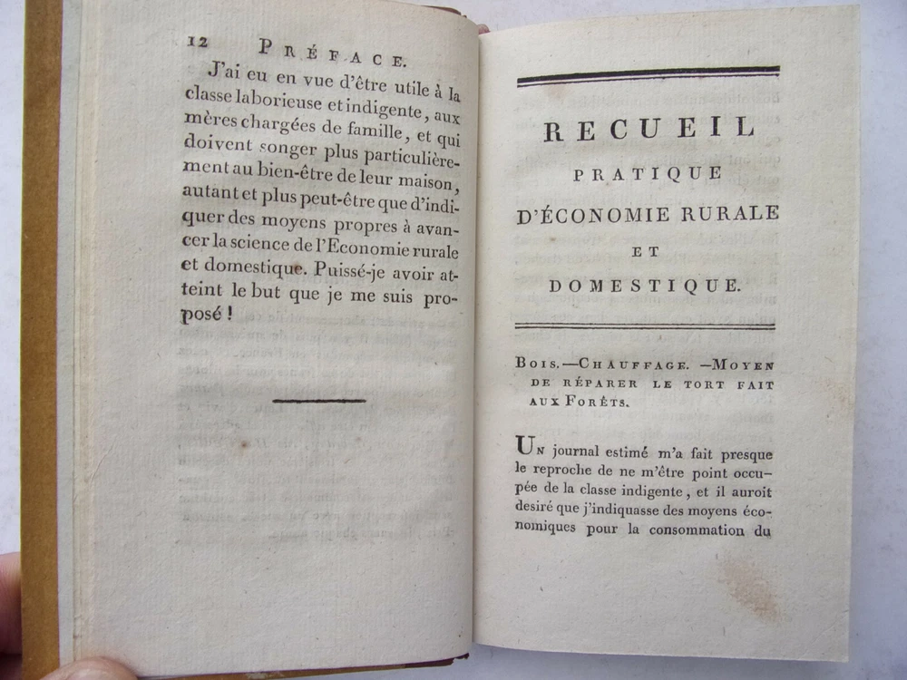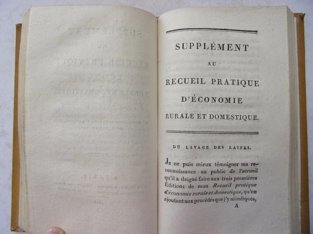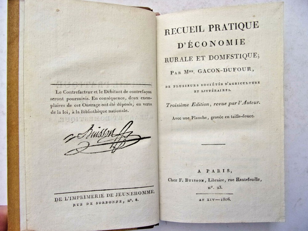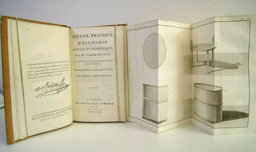 Mrs. Gacon-Dufour. Practical Collection of Rural and Domestic Economy (Rare) The description of this item has been automatically translated. If you have any questions, please feel free to contact us. Practical collection of rural and domestic economics Ms. Gacon-Dufour containing all the simplest and most effective recipes on the rural and domestic economy for use in town and country; firewood, dried pasta, choosing your sheep, honey flies, preserving vegetables, planting hedges... In her preface, the author declares: "I do not think that any of the processes that I indicate in this Work are found in any Author. It was not in books that I learned them; and I haven't read them anywhere. I get them from the experience and the transmission that was given to me. [...] those which concern the manufacture of Liqueurs, the making of dry Pastes, Fruit Pastes, Jams, the preservation of Vegetables, or Fruits in nature and dried, were communicated to me by the Ladies of Convent of Monfort-l'Amaury, where I was raised [...]. As for the processes which relate to the education of cattle and poultry, to the cultivation of wheat and other plants, to the formation and maintenance of meadows, etc., I wrote them under the dictation of the experience that I accumulated in Normandy, where I lived for a long time, and used land. [...] As for the rules that I prescribe for the food of Bees, for hatching Chickens in winter, keeping Eggs fresh, replacing Tea, Coffee, Wine, and several other foodstuffs, I owe them to "happy coincidences which led me to make several experiments, or to my own ideas, also confirmed by multiplied experiences" with an intaglio folding board volume in-8, 17x11, half smooth calfskin, very good interior condition, 280pp + supplements 128pp Paris, Chez Buisson, year XIV ref/189 In her preface, the author declares: "I do not think that any of the processes that I indicate in this Work are found in any Author. It was not in books that I learned them; and I haven't read them anywhere. I get them from the experience and the transmission that was given to me. [...] those which concern the manufacture of Liqueurs, the making of dry Pastes, Fruit Pastes, Jams, the preservation of Vegetables, or Fruits in nature and dried, were communicated to me by the Ladies of Convent of Monfort-l'Amaury, where I was raised [...]. As for the processes which relate to the education of cattle and poultry, to the cultivation of wheat and other plants, to the formation and maintenance of meadows, etc., I wrote them under the dictation of the experience that I accumulated in Normandy, wher Caractéristiques spéciales Édition originale Date de publication 1806 Reliure Cuir Langue Français Époque XVIIIème Nom Droit Sujet Ouvrages de référence