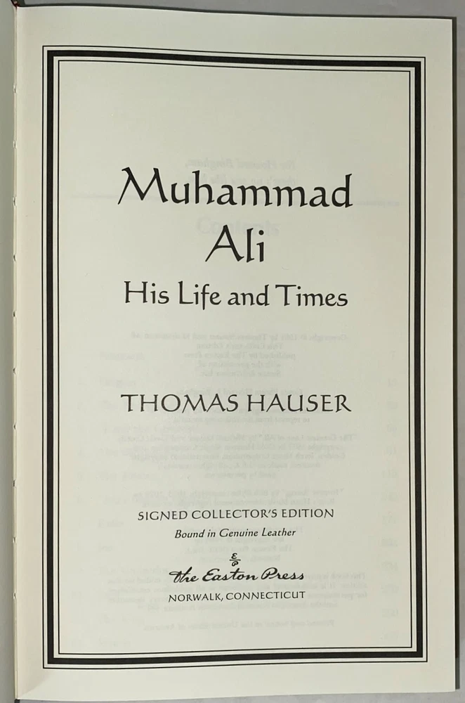 Muhammad Ali His Life and Times by Thomas Hauser - Signed by Muhammad Ali and Thomas Hauser! Number 1556 of 3500 Part of the Signed Collector's Edition collection of The Easton Press, Norwalk, Connecticut, 1996. This book is in excellent, unread condition. The Easton Press books are bound in genuine leather binding, with 22kt gold accents and hubbed spines, gilded page ends, acid-neutral paper, Moire fabric endsheets, and evocative illustrations and decorations. We will be happy to combine shipping, wherever possible. Some items cannot be combined because of their size, weight or because they are fragile. Please ask if you have any questions. Your order will ship by the next business day after receiving payment. All items are from a smoke-free environment. Thank you, and Happy Reading!