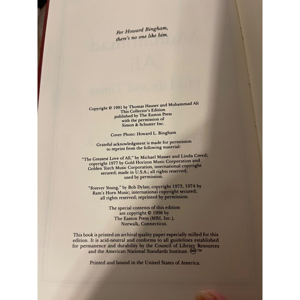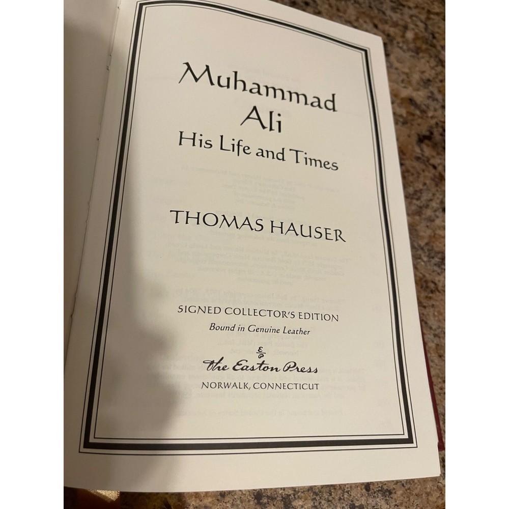 Muhammad Ali His Life and Times by Thomas Hauser - Signed by Muhammad Ali and Thomas Hauser! Number 188 of 3500 Part of the Signed Collector's Edition collection of The Easton Press, Norwalk, Connecticut, 1996. This book is in very good, unread condition. There is minor wear to the front cover. The Easton Press books are bound in genuine leather binding, with 22kt gold accents and hubbed spines, gilded page ends, acid-neutral paper, Moire fabric endsheets, and evocative illustrations and decorations. Features: • Mid Eastern Size: Unisex 543 pages Condition: Pre-Owned Good Good condition