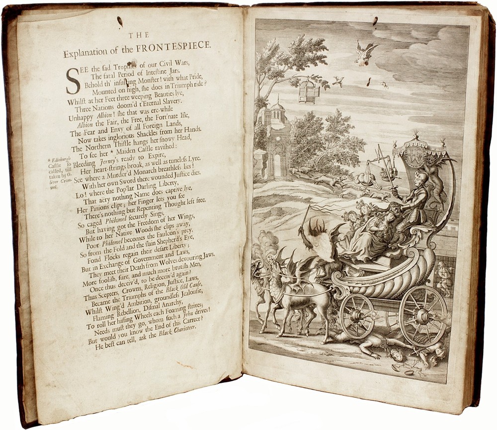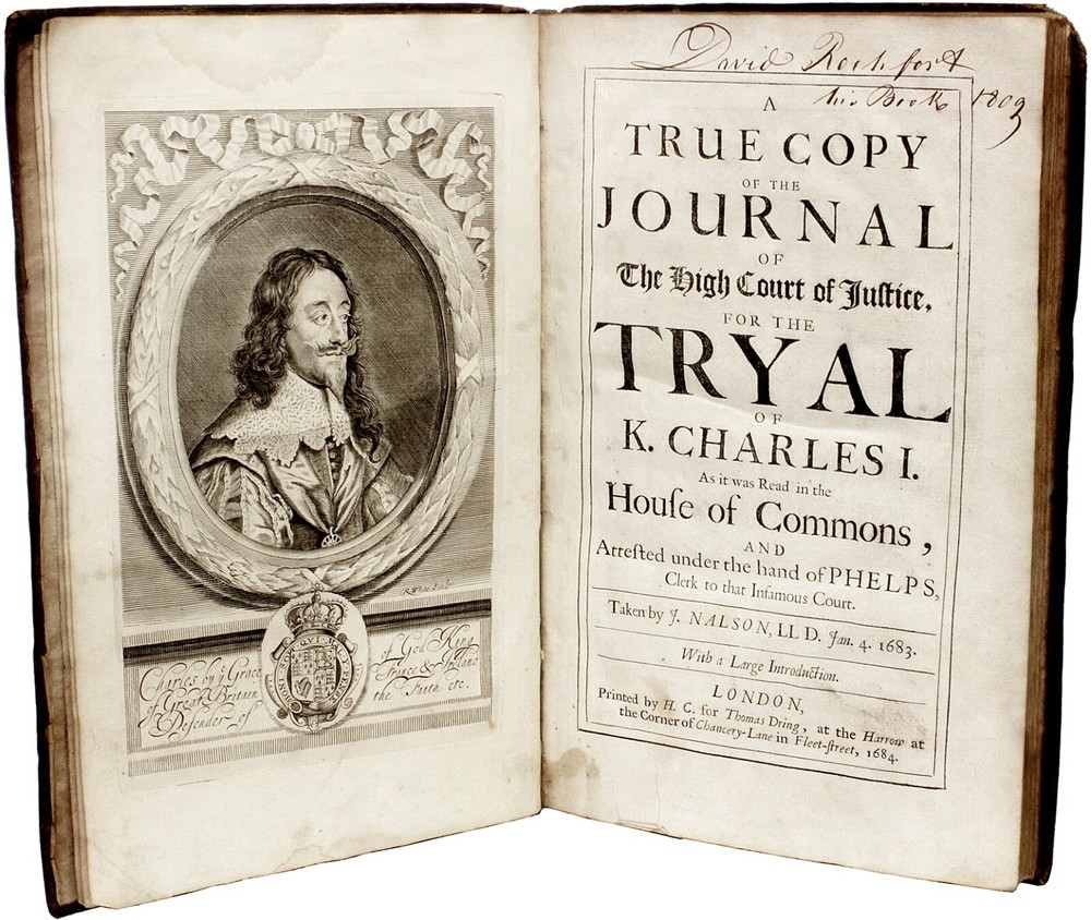 NALSON, John. A True Copy Of The Journal Of The High Court of Justice, For The Tryal of K. Charles I. As it was Read in the House of Commons, And Attested under the hand of Phelps, Clerk to that Infamous Court. London: by H. C. for Thomas Dring, 1684. FIRST EDITION. 1 vol., folio, 12-3/4" x 8-1/8", [vii](lxx)[ii]129pp.[iv], complete with the additional full page plate after page LXX, bound in fine contemporary full speckled calf over cords, head and foot of spine rubbed with some minor loss, upper and lower hinges just starting otherwise hinges fine, internally clean and bright, two early engraved bookplates to front pastedow, original front blank endpaper partially adhered to the gutter of the front pastedown, overall A GOOD+ copy. Who we are - D&D Galleries was founded in 1985. We are members of the Antiquarian Booksellers Association of America (ABAA), the International League of Antiquarian Booksellers (ILAB), and the Provincial Bookfair Association of Great Britain (PBFA). So bid and buy with confidence. Our inventory (largely English language only) is slightly eclectic and ranges from the 16th through the 20th centuries with sub-specialties in S.T.C. and Wing books, Lewis Carroll, Charles Dickens, presentation and association material as well as 17th and 18th C. British history, sets and bindings. Terms - Any item(s) may be returned with 7 days for a full refund if found to be not authentic or substantially at odds with our description or pictures. Items returned must be received in the same condition and completeness as sent.