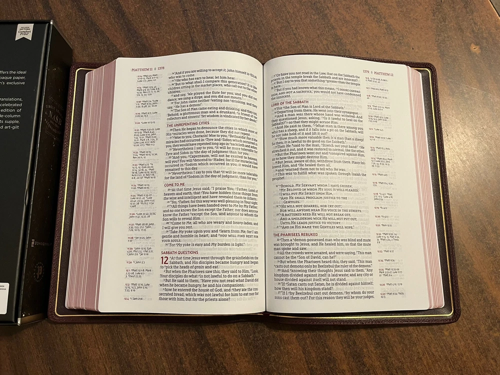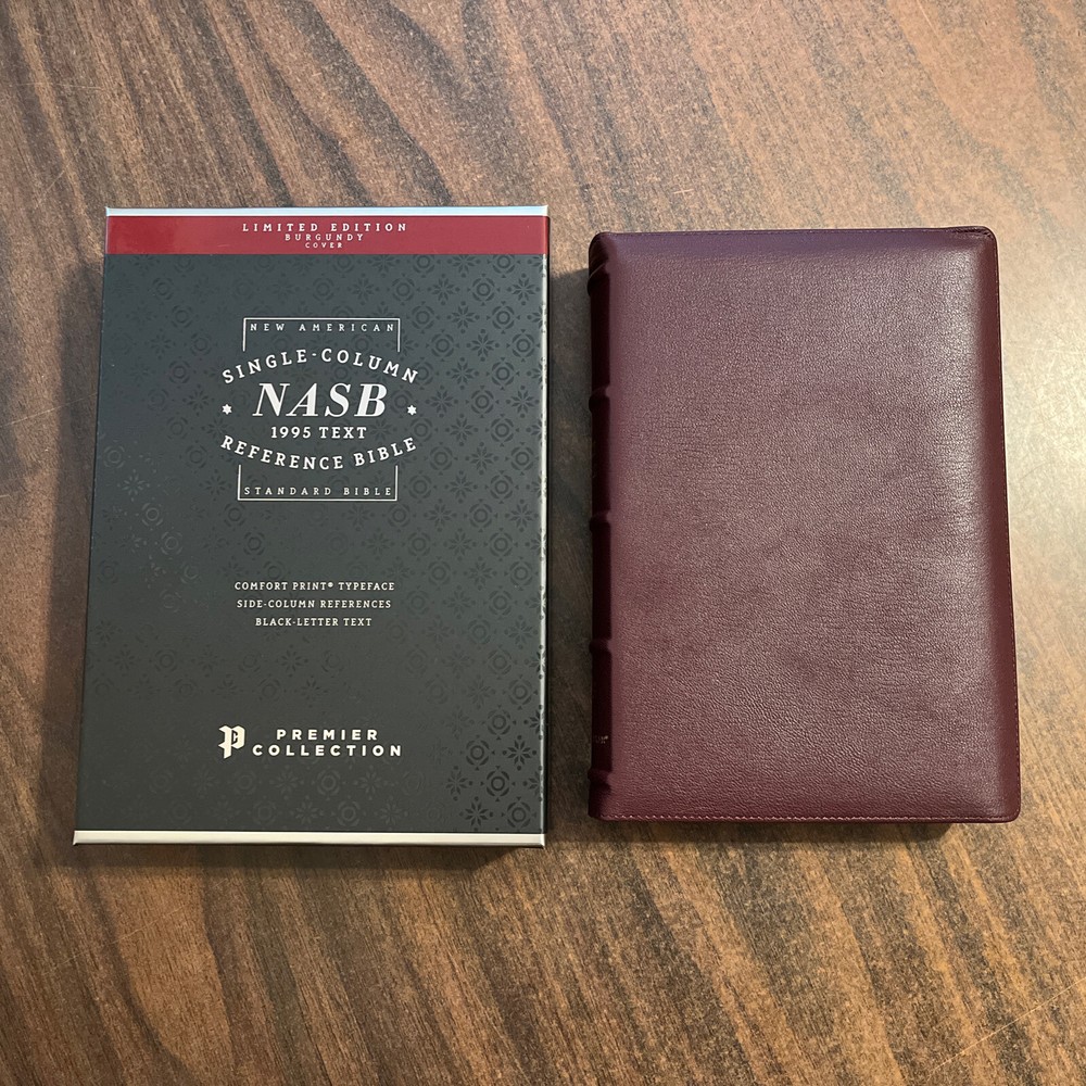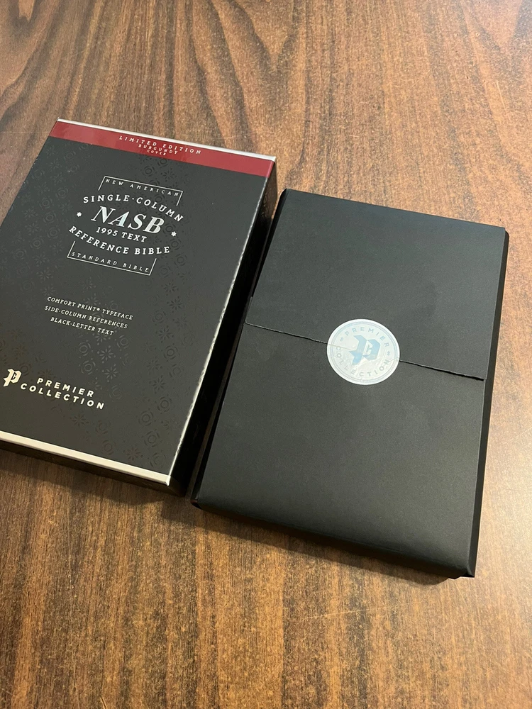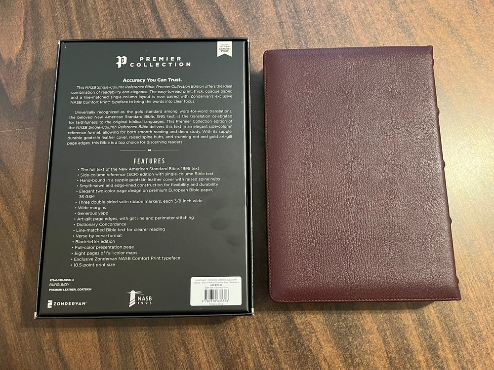 The Bible arrived in it's original box and wrapping. Opened it up to find a beautiful Burgundy Goatskin Bible. The Comfort Print makes it easy to read and the format of the verses and references is great. Look forward to using this as one on my regular Bible resources.