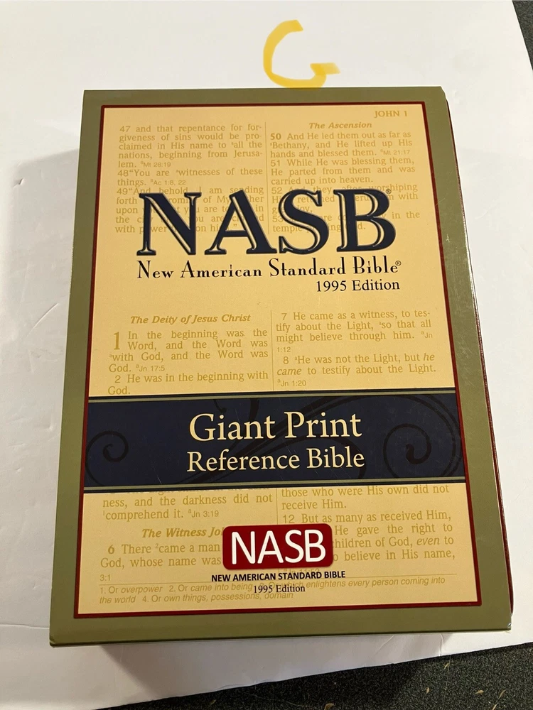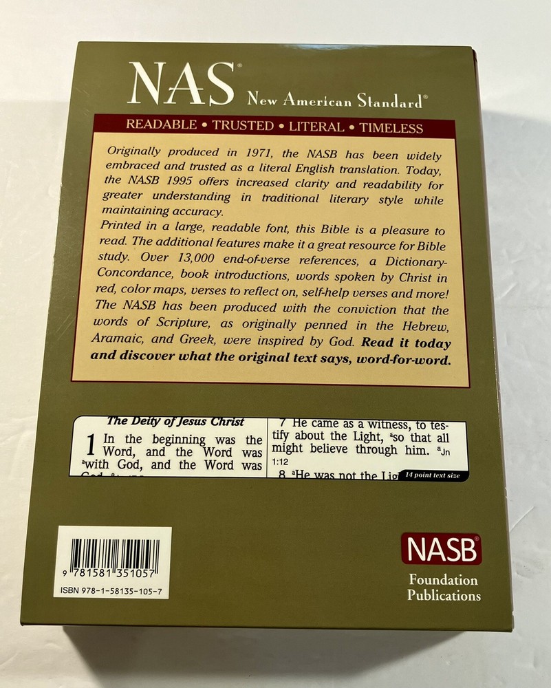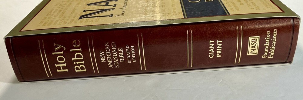 Good+ Condition. No Writing, Nice Copy. This NASB Giant Print Reference Bible is a beautifully crafted hardcover book that is perfect for anyone looking for a reliable and high-quality Bible. With its leather bound cover, this book is not only stylish but also durable, ensuring that it will last for years to come. The book is updated and includes the original languages of Arc, Gre, and Heb, making it a valuable addition to any library. The book is published by the Lockman Foundation and T.H.E. publishers, and it is authored by the Lockman Foundation Staff. This Bible is categorized under Books & Magazines and Books, and it is a must-have for anyone who is looking for a reliable and high-quality Bible. The book comes with a slipcase and features a number of important aspects, including the publication year, type, language, book title, author, publisher, genre, and original language.