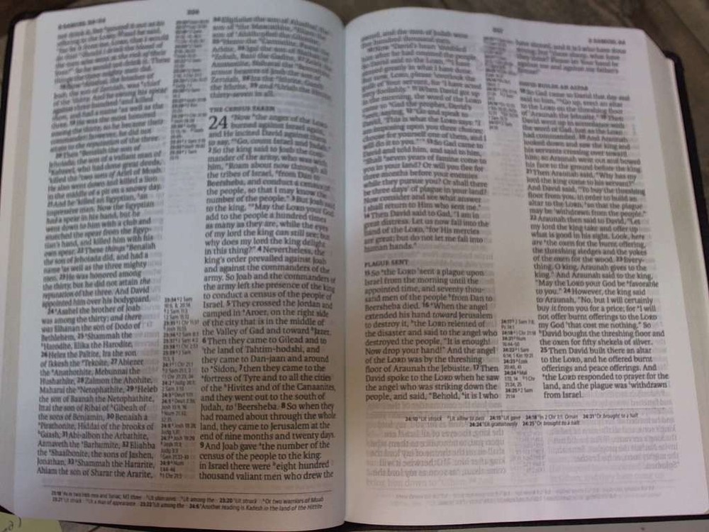 This item was listed as "very good" condition but it should have been listed as "like new" condition. I was very pleased to find the Bible had no writing in it, had a very clean leather cover and in fact looked like it had never been opened. The box was even in great shape on an item from 2013. The packaging could have gotten it to China and back without a scratch. It was shipped the same day as purchase. I love it and am very pleased with this seller.