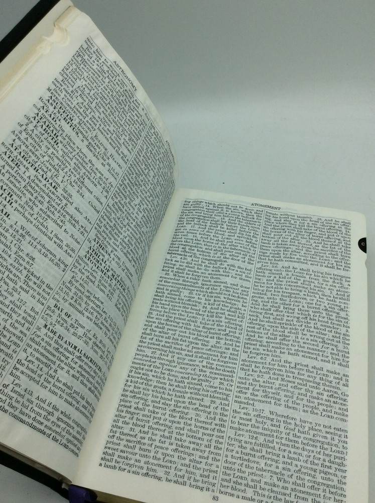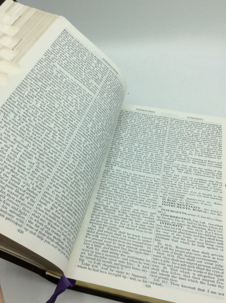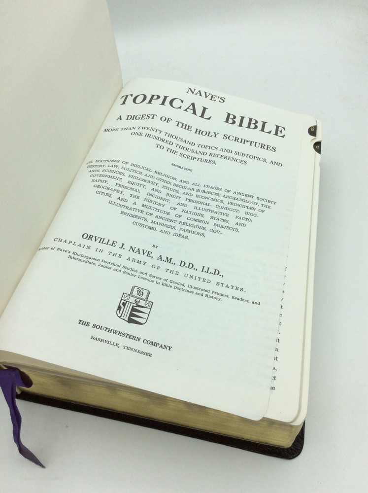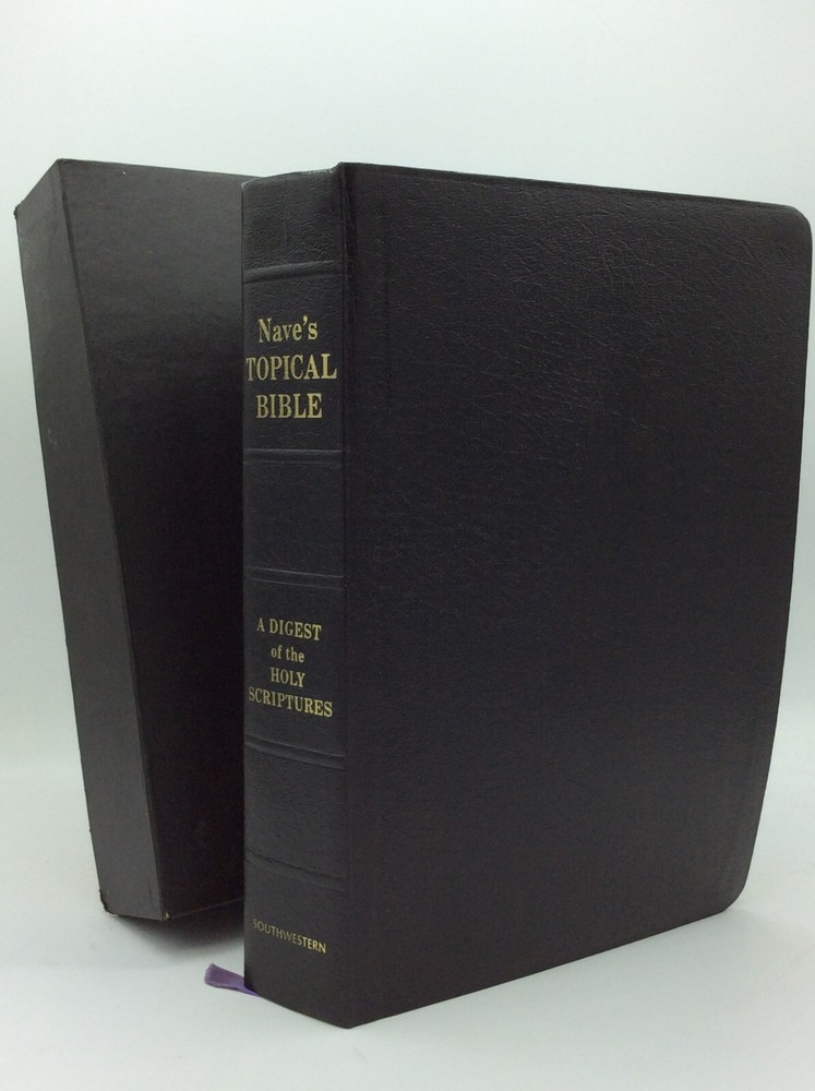 Orville J. Nave NAVE'S TOPICAL BIBLE: A Digest of the Holy Scriptures Nashville: The Southwestern Company, 1962. Leather. 1615p. A flexible hardcover book bound in black leather with gilt edges and an attached ribbon bookmark. Near-fine condition; faint crease in front cover, but otherwise clean and tight. Comes in a plain box with lid. Item #194467 Thumb-indexed reference manual of Bible passages arranged by topic.
