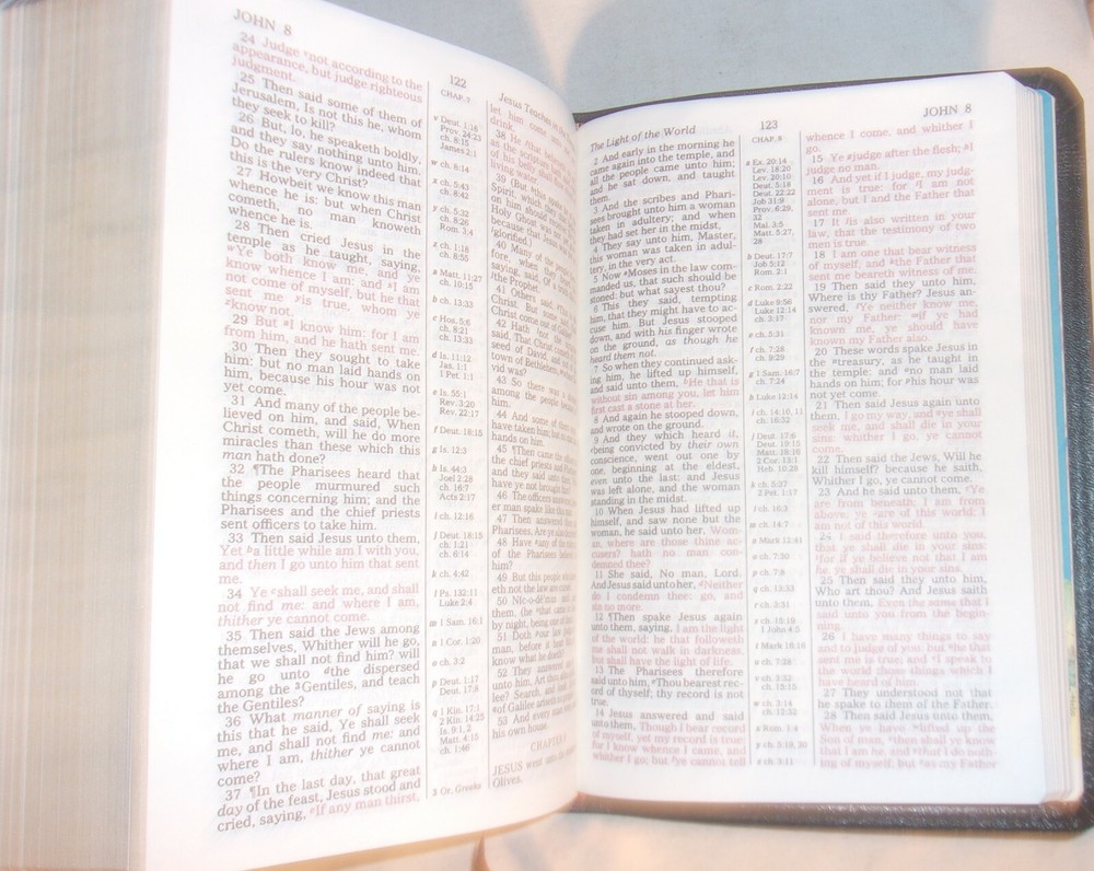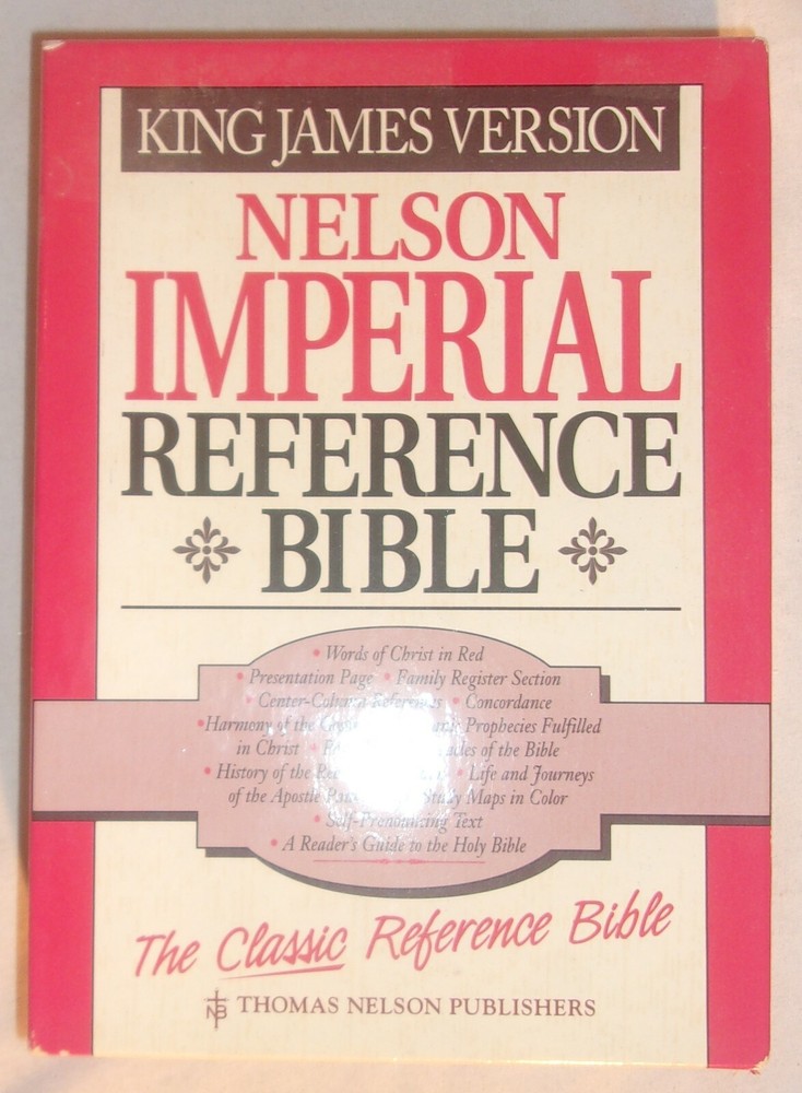 "Nelson Imperial Reference Bible" with black bonded leather cover and gold page edges.This book is self pronouncing and has center column references.The pages look nice inside, the condition is described above.A good Bible to read. Pay-pal is the only accepted form of payment. Items are sold as is, so please read the item description for the condition of the item.Payment is expected within 3 days of auction end. Please allow USPS shipping rules for item to reach you.Usually within 7-10 days for parcel post or quicker for priority mail.Please e-mail me with any questions.Thank you. On Jul-25-14 at 14:26:07 PDT, seller added the following information: Track Page Views With Auctiva's FREE Counter