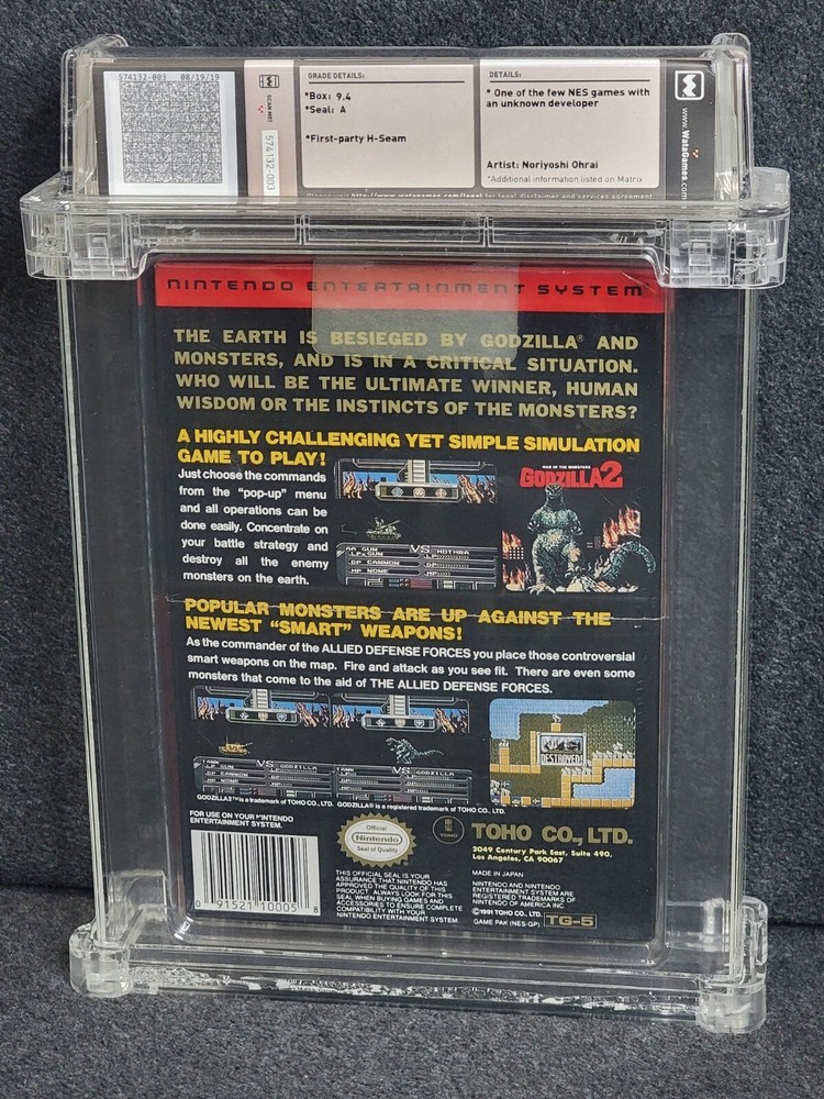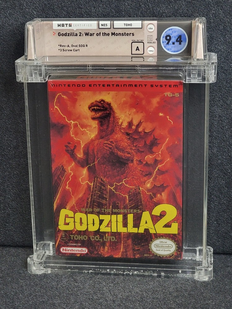Item Description Godzilla 2, a NES collecting grail and nearly impossible to find sealed! Beautiful condition as a Wata 9.4 box with A seal! Only one higher grade in Wata pop, incredible grade on a must-own NES title! Shipping and Return Policies Shipping is FREE! to anywhere in the United States, which includes a tracking number via USPS Delivery Confirmation. International shipping available via the Global Shipping Program. You will be permitted to return the item within 30 days of receiving it to be issued a refund, less shipping fees. Buyer is responsible for return shipping. The product must be returned in the condition it was received . This means that the game cannot be damaged, scuffed, drawn on, etc. Check out my Other Auctions here!! Questions? Please feel free to ask questions. During the week (minus holidays), I will usually respond within an hour or two. Even on the weekends, I should get back to you within a matter of hours. Feedback Please check my 100% positive feedback so you can bid with confidence! I am a dedicated seller committed to keeping you happy! Please be sure to leave 5-star feedback to help me maintain my high level of service. Feedback will be returned as soon as it is received!