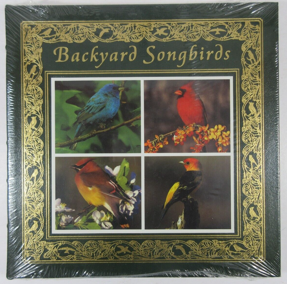 For sale is a New condition, Sealed leather-bound hardcover copy of Backyard Songbirds by Marcus Schneck. Collector's Edition, published by Easton Press in Norwalk, CT. Features green leather binding, gold foil lettering and decoration, banded spine, gilt pages, and a gold satin placeholder ribbon. In New condition, still sealed in original plastic with minimal shelf wear. Please see photos for condition detail. shelf reference #L-1175