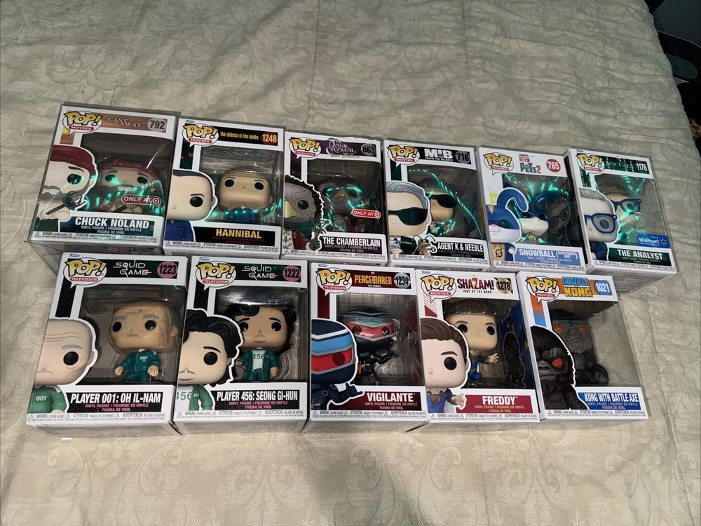 Some boxes have minor damage (refer to pictures). All flaws shown. NEXT DAY SHIPPING. Vigilante has sticker marks on box, can be removed by dabbing goo-gone on it (won’t damage it) Funkos will be protected with bubble wrap and packaging paper. Get your hands on this amazing Funko Pop Movie Lot consisting of 11 vinyl figures from popular movies such as Cast Away, Squid Game, MIB, Godzilla, Matrix, and more. Each figure stands at 4 inches tall and features a unique design with multicolor detailing, making them a great addition to any collection. These Funko Pop figures are made of high-quality vinyl material and come in their original unopened packaging, ensuring they are in pristine condition. Perfect for fans of the movies and Funko collectors alike, this lot includes 11 figures featuring characters such as Chuck Noland, Agent K and Neeble, and Kong, among others. Don't miss out on this exclusive opportunity to own these beloved characters as collectible vinyl figures. Some boxes have minor damage!! (Refer to pictures) Disclaimer!!! Cast Away Funko does not come with Funko protector.