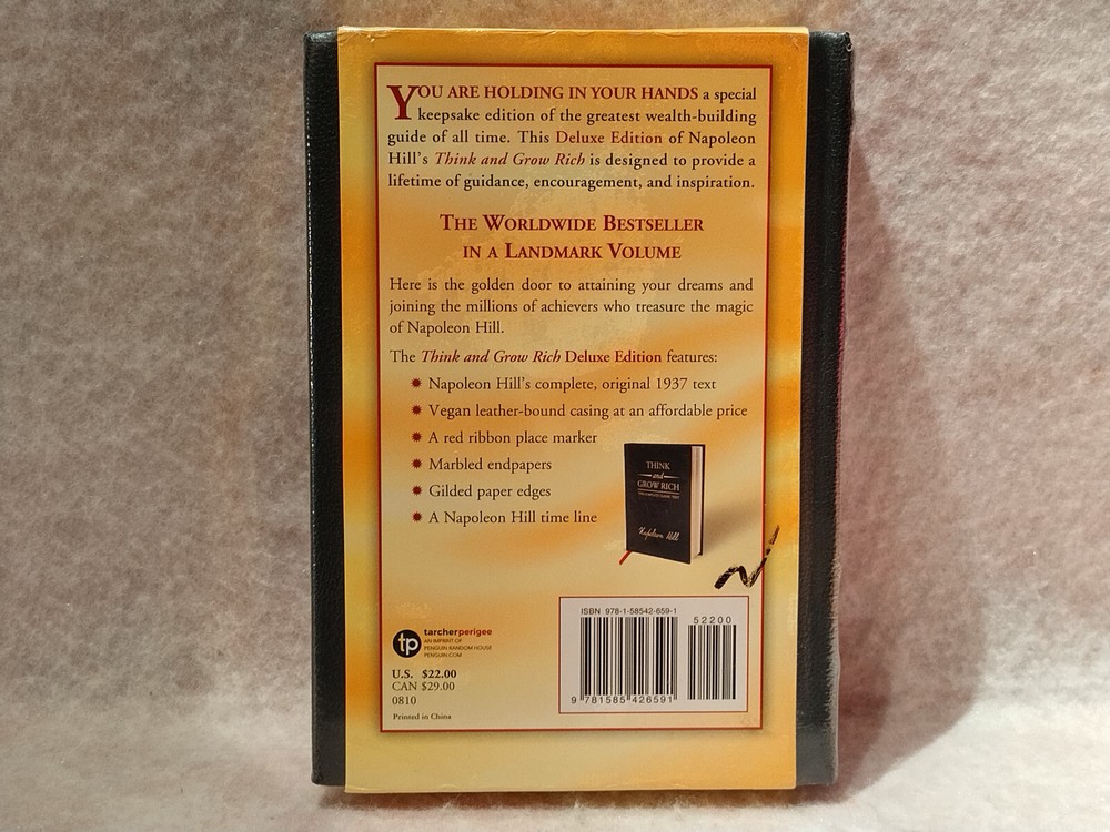 The book is a special keepsake edition of the greatest wealth-building guide of all time. This Deluxe Edition of Napoleon Hill's Think and Grow Rich is designed to provide a lifetime of guidance, encouragement, and inspiration. Here is the golden door to attaining your dreams and joining the millions of achievers who treasure the magic of Napoleon Hill. The bestselling success book of all time is updated and revised with contemporary ideas and examples. Think and Grow Rich has been called the "Granddaddy of All Motivational Literature." It was the first book to boldly ask, "What makes a winner?" The man who asked and listened for the answer, Napoleon Hill, is now counted in the top ranks of the world's winners himself. The most famous of all teachers of success spent "a fortune and the better part of a lifetime of effort" to produce the "Law of Success" philosophy that forms the basis of his books and that is so powerfully summarized in this one. Now, this landmark bestseller receives perhaps its most beautiful publication ever with this special deluxe edition, featuring: • Napoleon Hill's complete, original 1937 text • Leather-bound hardcover • A red ribbon place marker • Marbled endpapers • Gilded paper edges • A Napoleon Hill time line It will arrive carefully packed and shipped in a sturdy box to ensure safe delivery. The pictures are the actual item up for bid with the exception of the last three, which are stock images. Merchandise is from a pet/smoke free home. Shipping within the Continental U.S. is $4.85. If you have any questions, don't hesitate to ask.