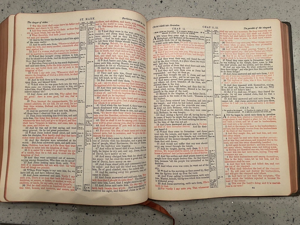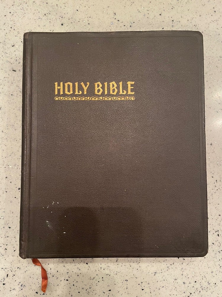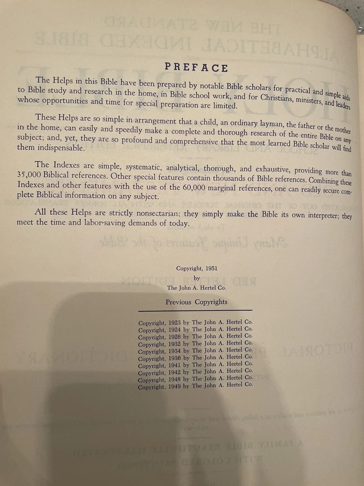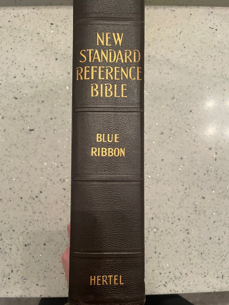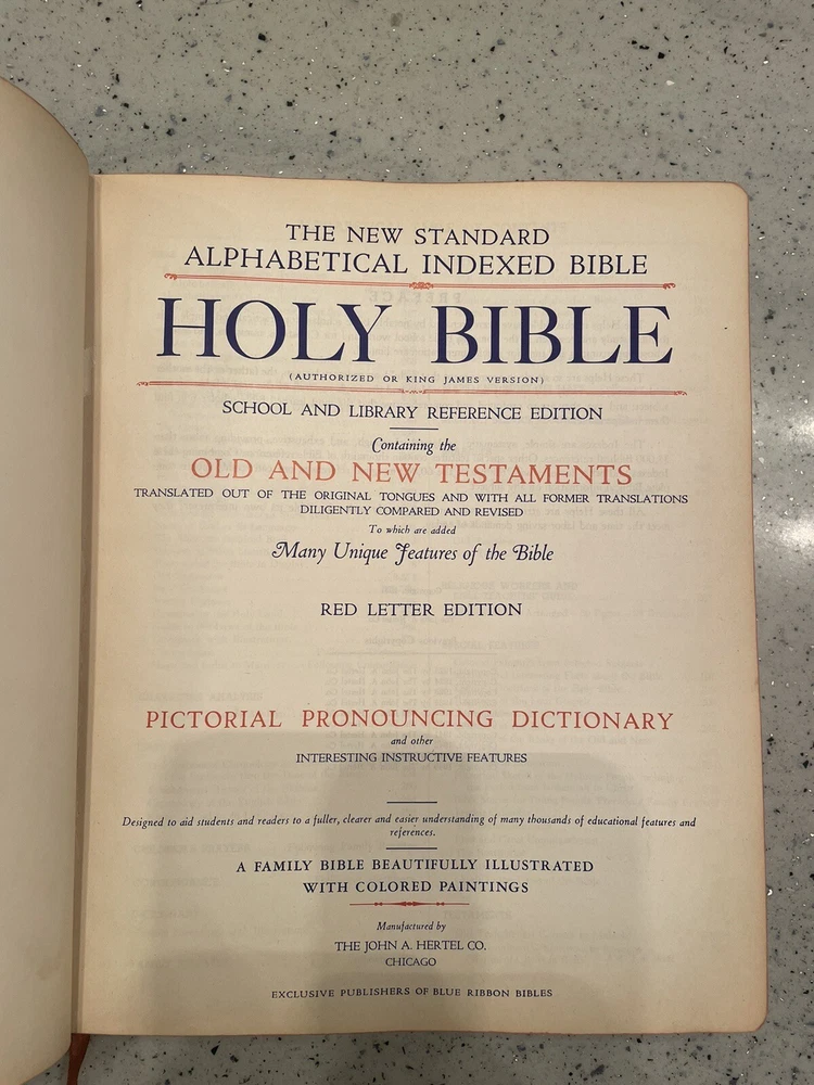 NEW STANDARD REFERENCE Holy BIBLE Blue Ribbon Edition 1951 HERTEL Red Letter Bible is in very good shape. Has very minimal wear. The first few blank pages are starting to separate at the spine (see pictures). However, the rest of the book is intact.