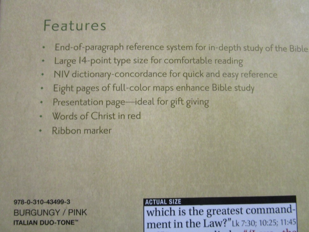 ** NIV REFERENCE BIBLE ** ** NIV GIANT PRINT ** ** NIV 2011 TEXT ** **************************** Zondervan 2011 NIV 2011 Updated Text REFERENCE BIBLE Burgundy/Pink Leathersoft Imitation Leather GIANT PRINT 14pt RED Letter Words of Christ in RED 9780310434993 ribbon marker Brand NEW!! Retail $64.99 ************************** Standard Size 6.5 x 9.5 Weighs 3lbs Ships Fast (usually same day) Media Rate (5-10days) Ships with Tracking # ***USPS o rder early! *************************** Small Family Biz I have a FT job THANK YOU!!! God Bless Y'all