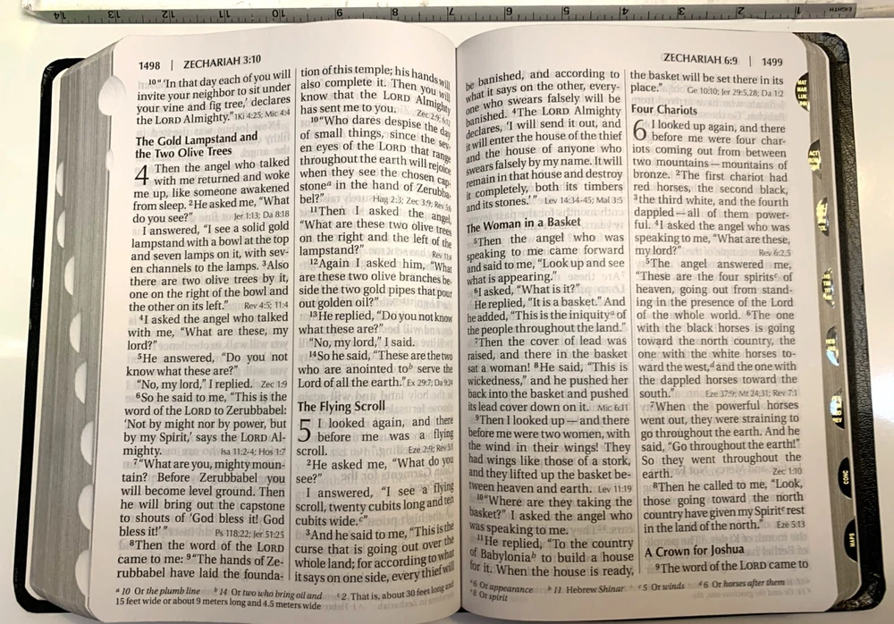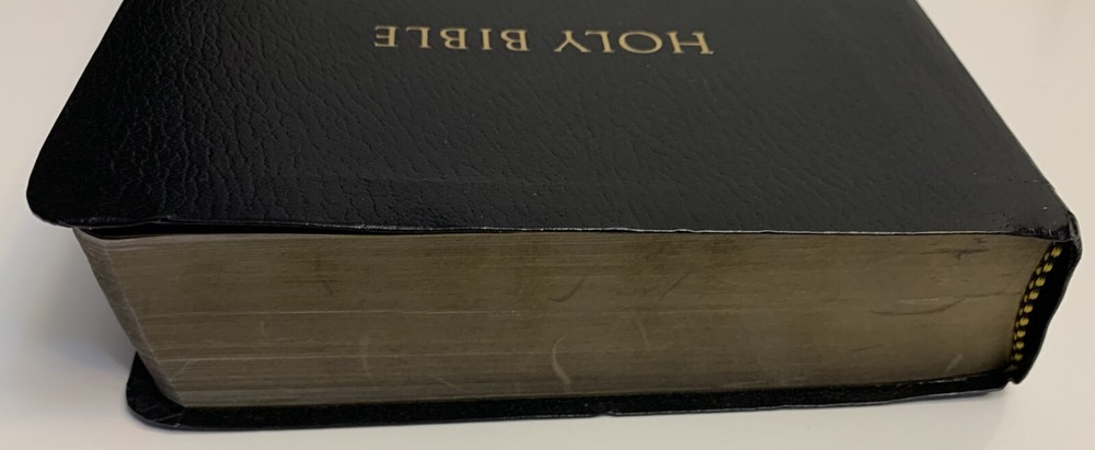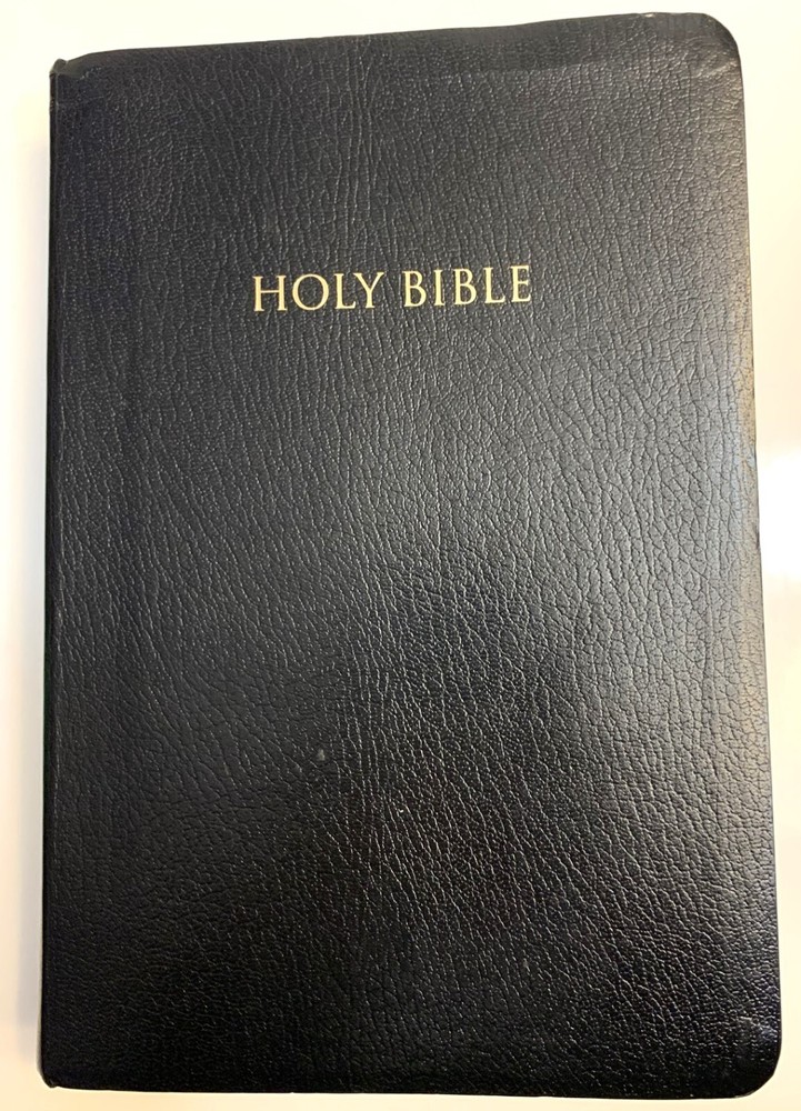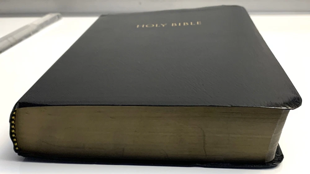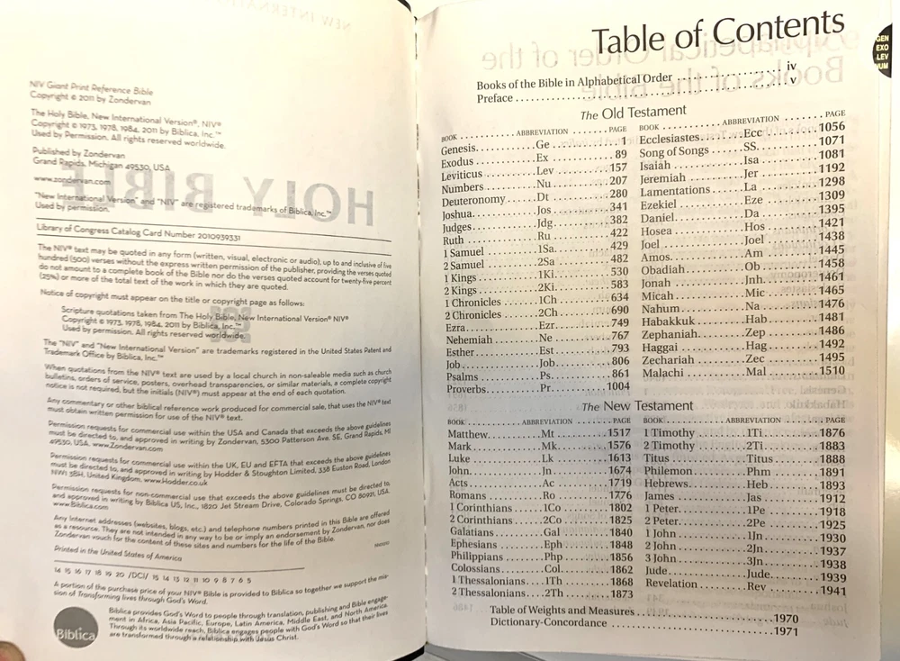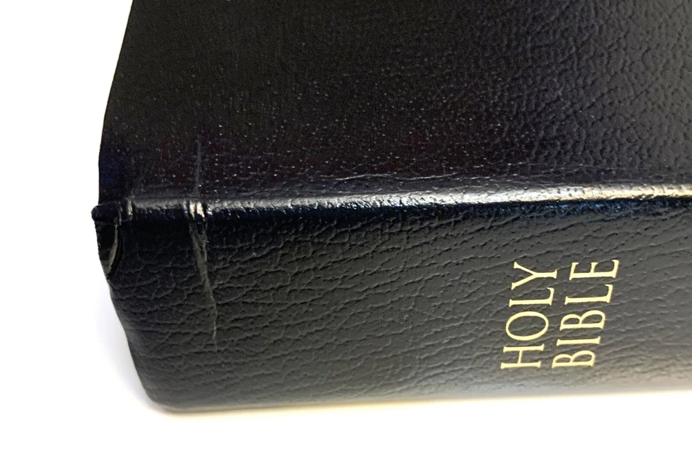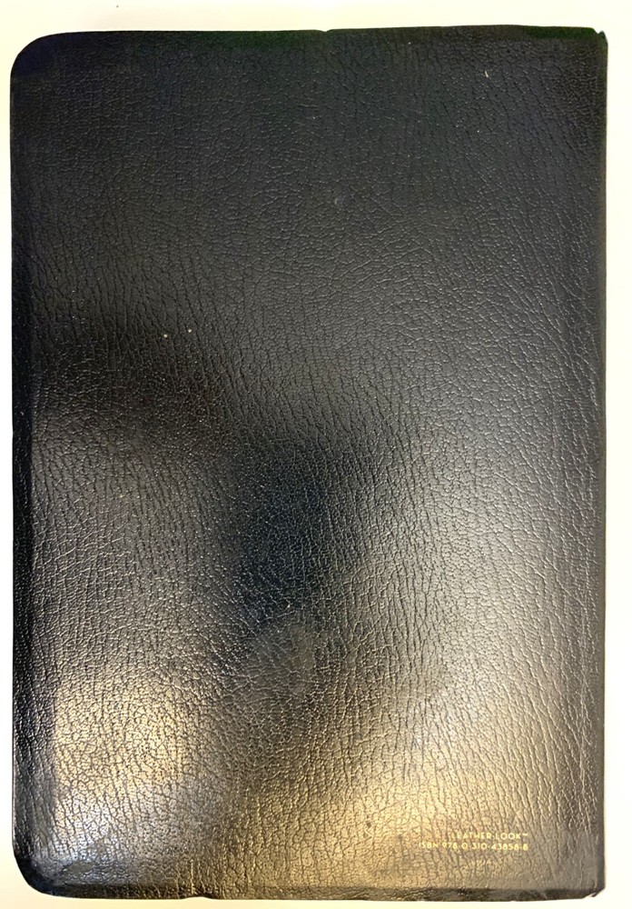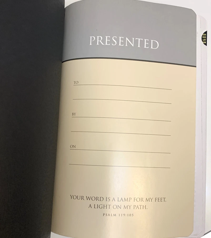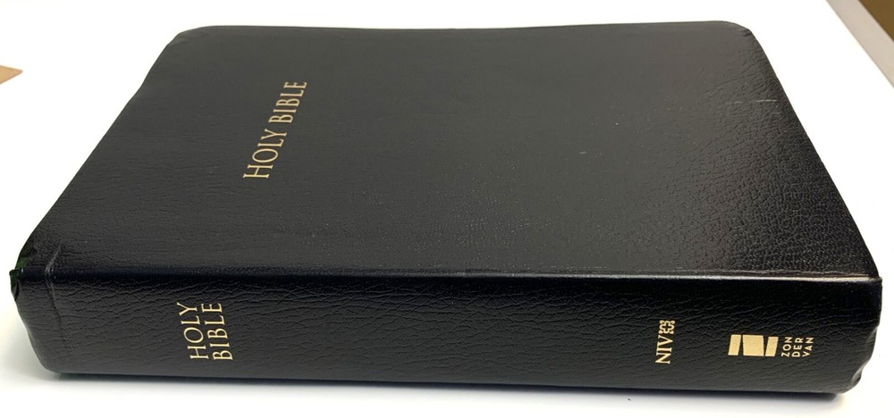 NIV Giant Print Reference Bible Black Imitation Leather with Thumb Index Zondervan Zondervan, 2011 copyright, 2014 printing Very Good Condition: Black "leather-look" flexible binding, 2014 printing, GIANT PRINT edition with thumb index tabs. Does NOT include original box / sleeve. No markings (presentation page never filled in), light scratches on gilded page edges, depression in leather near upper edge of spine. Ships by USPS mail.