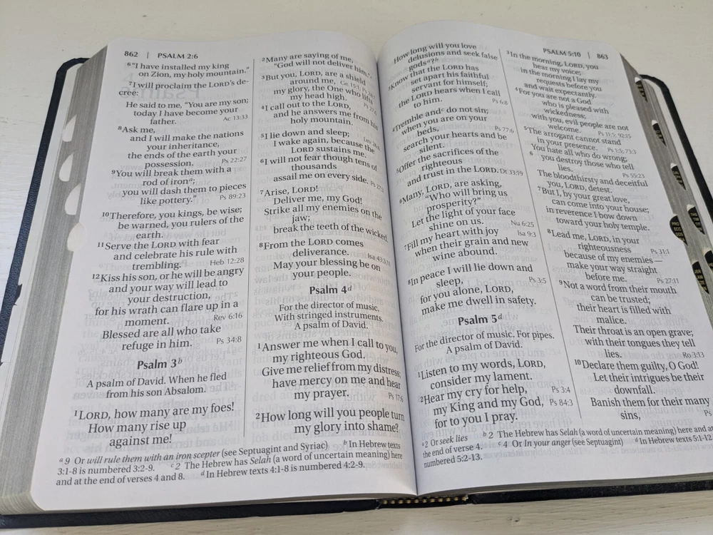 Bible measures 6 and 1/2 in x 9 and 1/2 in. Red letter edition. Thumb index. Bible is in excellent condition with no marks inside