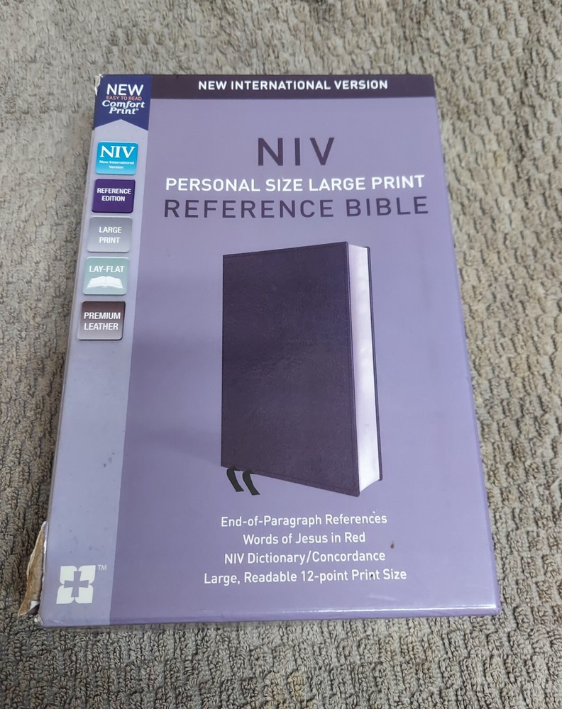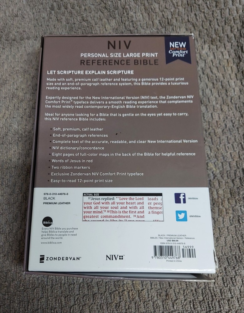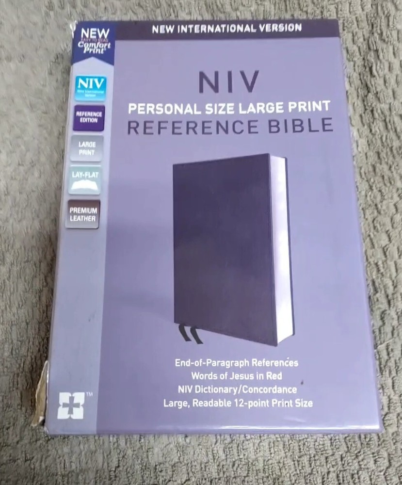 The product is the "NIV Large Print Reference Bible" in Leathersoft Black Leather. It is a Historical book series in Nonfiction narrative type, published by Zondervan. This Large Print Edition features the New International Version (NIV) with a Red Letter Edition. The Bible is intended for Young Adults and Adults, and is in English with 2016 pages. It is an Imitation Leather format with Large Print and Wholesale Bible features.