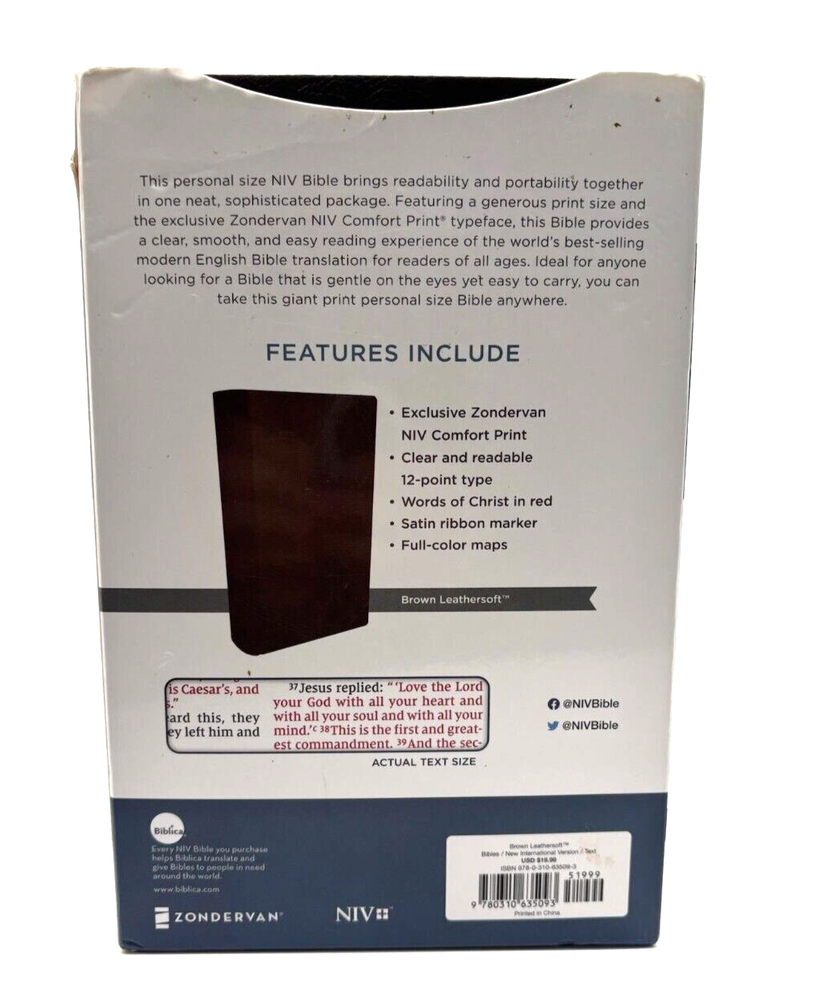 The NIV: Personal Size Giant Print Bible offered by Zondervan is a comprehensive and beautifully crafted book designed for young adults and adults alike. With its exclusive brown leather cover and large print size, this Bible is perfect for readers looking to engage with the text in a more comfortable and accessible format. The renowned Zondervan publisher ensures high-quality content and a durable construction, making it a valuable addition to any personal or family library. The Bible features 1856 pages filled with essential teachings and stories from the Christian scriptures, making it a must-have resource for those seeking spiritual guidance and enlightenment. We Usually Ship The Same Day Or The Next Day