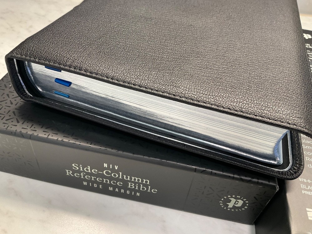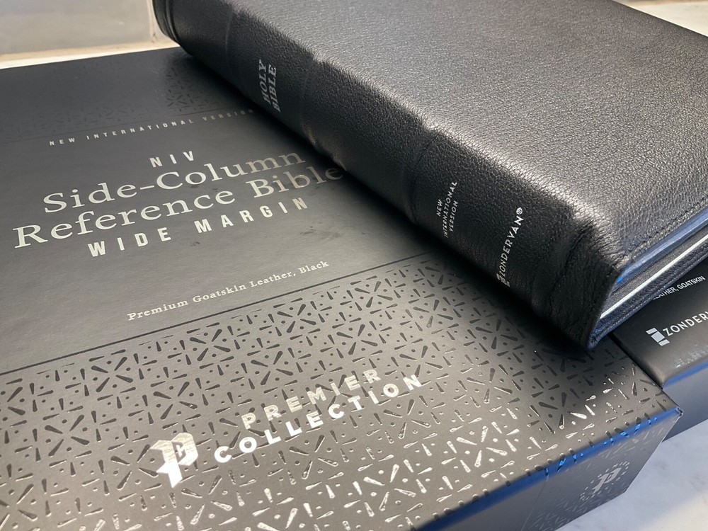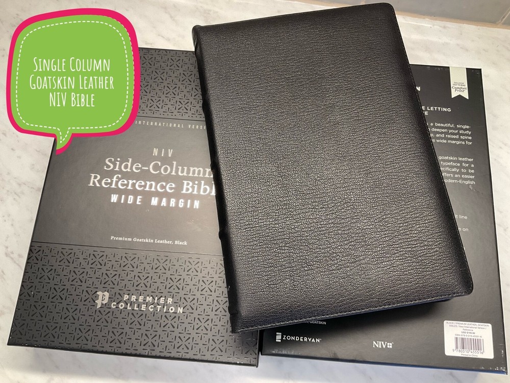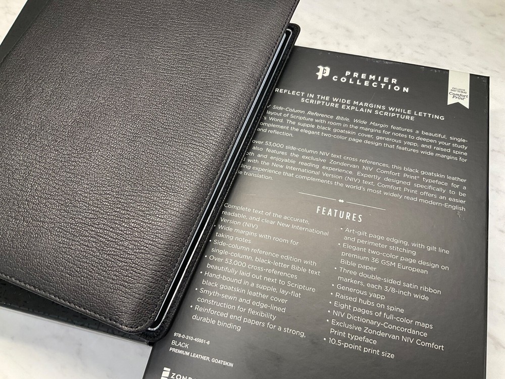 NIV Side Column Reference Bible Wide Margin and Single Column Premium Black Goatskin Leather Black Letter & Sewn Binding Zondervan Bibles - Premier Collection Premium European Paper 36 GSM Clear 10.5 Point Text Cover Dimensions: 10.0 X 7.00 X 1.00 (inches) New International Version - 2011 Text Brand New Condition - Retail $199.99 Black Letter Edition (not Red Letter) 3 Ribbon Markers & Sewn Binding Experience an exquisite NIV Bible with wide margins and side-column cross references The NIV Side-Column Wide-Margin Reference Bible is presented in a hand-bound goatskin leather cover that beautifully encases God's Word. Smyth-sewn and edge-lined for maximum durability, this Bible not only delivers on a respectfully cover but also highlights a rugged portability. When opened, the premium goatskin leather cover will lay flat and enable you to read Scripture in a single-column layout. While not designed as a journal Bible, this reference Bible features wide and spacious margins that are intended to prompt studious notes as the Spirit leads you through verses that capture your heart and mind. With over 53,000 side-column NIV text cross references, the NIV Side-Column Wide-Margin Reference Bible also features the exclusive Zondervan NIV Comfort Print typeface for a smooth and enjoyable reading experience. Expertly designed specifically to be used with the New International Version (NIV) text, Comfort Print offers an easier reading experience that complements the world's most widely read modern-English Bible translation. Features: Complete text of the accurate, readable, and clear New International Version (NIV) Wide margins with room for taking notes Side-column reference edition with single-column, black-letter Bible text Over 53,000 cross-references beautifully laid out next to Scripture Hand-bound in a premium supple goatskin leather cover that lays flat when open Smyth-sewn and edge-lined construction for flexibility Reinforced end papers for a strong, durable binding Art-gilt page edging, with gilt line and perimeter stitching Elegant two-color page design on premium 36 GSM European Bible paper Three double-sided satin ribbon markers, each 3/8-inch wide Generous yapp Raised hubs on spine Eight pages of full-color maps NIV Dictionary-Concordance Exclusive Zondervan NIV Comfort Print typeface 10.5-point print size PLEASE double click on lots of the photos for a closer look!