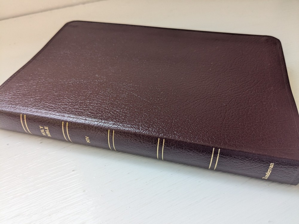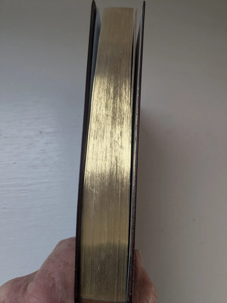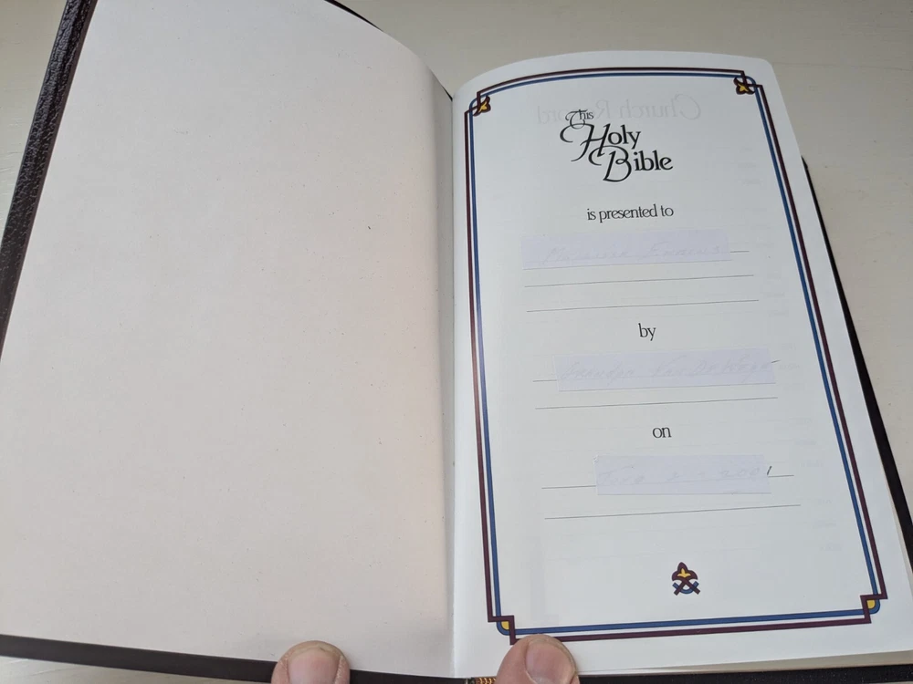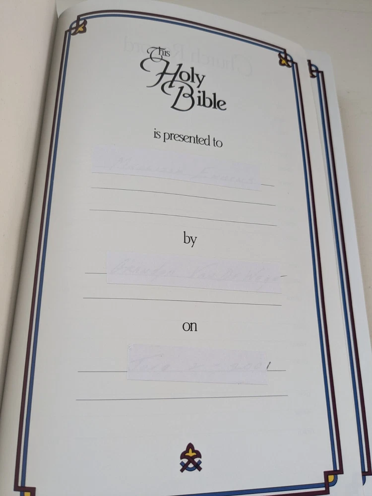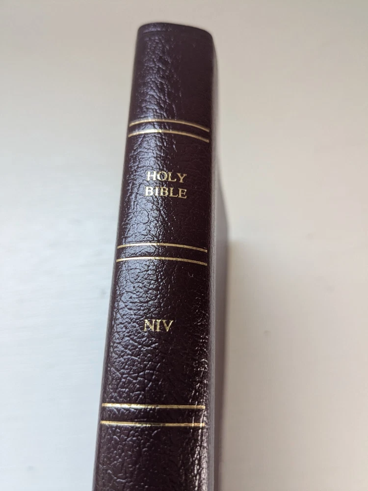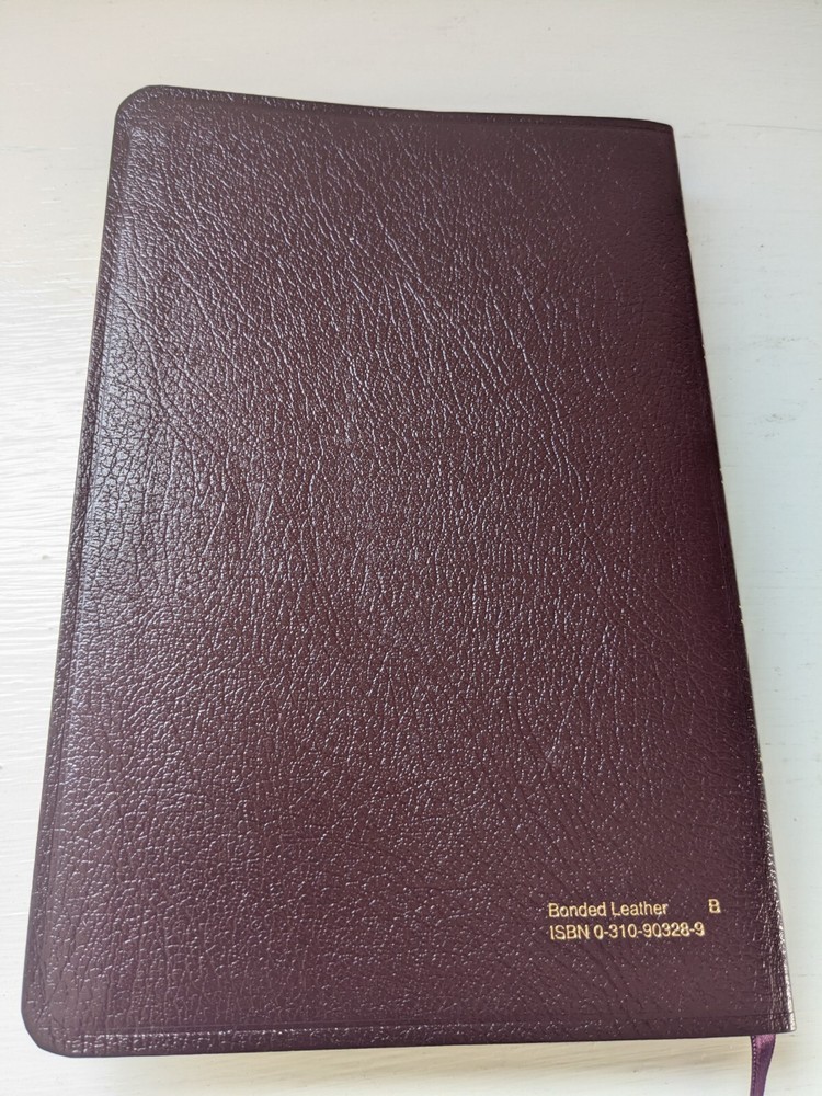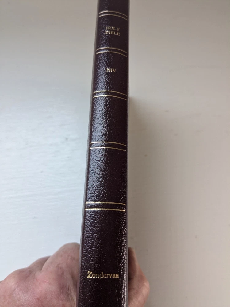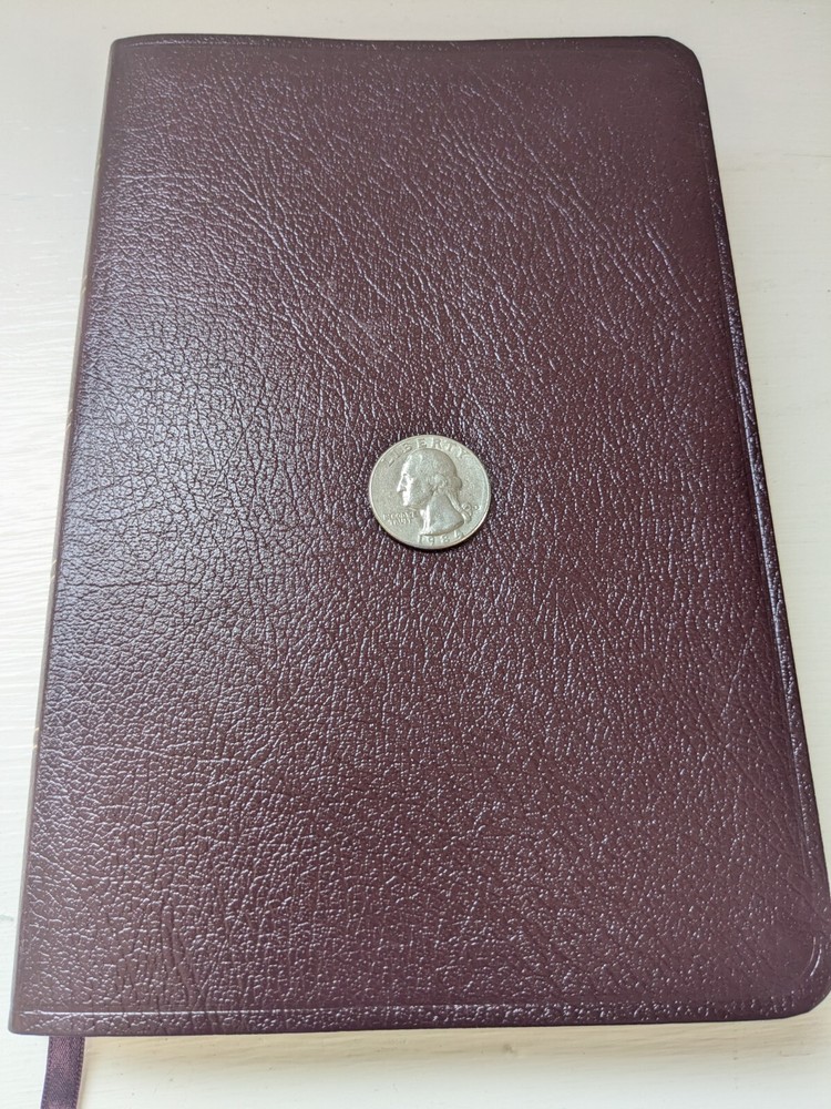 Bible measures 5 and 1/2 in x 8 and 1/4 in x 1 in. Binding is strong. Red letter edition . Previous owner's name on presentation page covered over with white sticker. No marks in text. Beautiful burgundy bonded leather covers. Except for name in front Bible is in like new condition