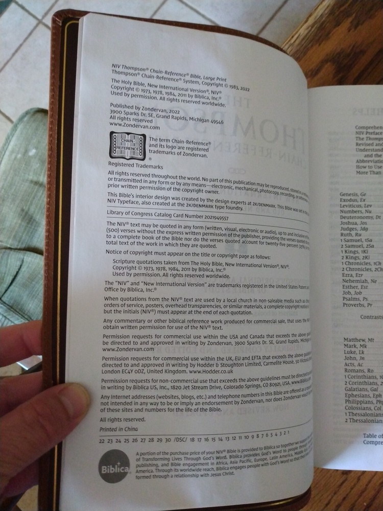 An easy-to-learn, easy-to-use tool for topical Bible study With over 100,000 references listed in the Bible's margins, covering over 8,000 topics, the Thompson® Chain-Reference® Bible is an ideal tool for comprehensive topical study. The chain-reference system enables you to search the breadth of Scripture's teachings on thousands of topics and allows you to follow those topics throughout the entire Bible. Beloved and acclaimed for more than five generations, this unique reference Bible is unparalleled in its ability to enrich personal devotions, topical study, and sermon preparation. The Thompson Chain-Reference Bible also offers a library of additional study resources, including biographical sketches, illustrated studies, maps, and charts. The alphabetical and numerical indexes make it easy to find any topic you wish to study, explore, or speak about. These tools together allow readers to interpret the Bible using related scripture passages rather than consulting a commentary. The NIV Thompson Chain-Reference Bible, Large Print is printed in Zondervan's exclusive NIV Comfort Print® typeface for easy reading. Expertly designed specifically to be used for the New International Version (NIV) text, Comfort Print offers an easier reading experience that complements the most widely read modern-English Bible translation. It also features a fresh, two-color design that preserves the original look of the chain-reference system, while making each page cleaner and easier to read. Features: Complete text of the accurate, readable, and clear New International Version (NIV) Easy-to-understand chain-reference system with over 100,000 topical references Alphabetical and numerical indexes highlight study materials for over 8,000 topics, each with its own topic number, for exhaustive topical study An extensive study resource section includes biographical sketches, illustrated studies of the Bible, a concordance, Bible harmonies, and many other helpful study tools Fresh, two-color page design 66 book introductions 16-page full-color map section with map index Words of Jesus in red Presentation page for gift-giving Raised spine hubs Two double-sided 3/8-inch wide satin ribbon markers Genuine leather cover lies flat when open Exclusive Zondervan NIV Comfort Print typeface 10.5-point print size In 1890, creator of the Thompson Chain-Reference system, Dr. Frank Charles Thompson, began working on the "chain-links" that became the foundation of the unique Thompson referencing system. The Kirkbride Bible Company, Inc., published the first complete Thompson Chain-Reference Bible in 1908 and continued that legacy for over 100 years, adding visual, maps, archeological insights, and over 100,000 references. Now, Zondervan Bibles is excited to take the Thompson Chain-Reference Bible forward, and to continue to steward this important brand with new revised and expanded editions., An easy-to-learn, easy-to-use tool for topical Bible study With over 100,000 references listed in the Bible's margins, covering over 8,000 topics, the Thompson(R) Chain-Reference(R) Bible is an ideal tool for comprehensive topical study. The chain-reference system enables you to search the breadth of Scripture's teachings on thousands of topics and allows you to follow those topics throughout the entire Bible. Beloved and acclaimed for more than five generations, this unique reference Bible is unparalleled in its ability to enrich personal devotions, topical study, and sermon preparation. The Thompson Chain-Reference Bible also offers a library of additional study resources, including biographical sketches, illustrated studies, maps, and charts. The alphabetical and numerical indexes make it easy to find any topic you wish to study, explore, or speak about. These tools together allow readers to interpret the Bible using related scripture passages rather than consulting a commentary. The NIV Thompson Chain-Reference Bible, Large Print is printed in Zondervan's exclusive NIV Comfort Print(R) typeface for easy reading. Expertly designed specifically to be used for the New International Version (NIV) text, Comfort Print offers an easier reading experience that complements the most widely read modern-English Bible translation. It also features a fresh, two-color design that preserves the original look of the chain-reference system, while making each page cleaner and easier to read. Features: Complete text of the accurate, readable, and clear New International Version (NIV) Easy-to-understand chain-reference system with over 100,000 topical references Alphabetical and numerical indexes highlight study materials for over 8,000 topics, each with its own topic number, for exhaustive topical study An extensive study resource section includes biographical sketches, illustrated studies of the Bible, a concordance, Bible harmonies, and many other helpful study tools Fresh, two-color page design 66 book introductions 16-page full-color map section with map index Words of Jesus in red Presentation page for gift-giving Raised spine hubs Two double-sided 3/8-inch wide satin ribbon markers Genuine leather cover lies flat when open Exclusive Zondervan NIV Comfort Print typeface 10.5-point print size In 1890, creator of the Thompson Chain-Reference system, Dr. Frank Charles Thompson, began working on the "chain-links" that became the foundation of the unique Thompson referencing system. The Kirkbride Bible Company, Inc., published the first complete Thompson Chain-Reference Bible in 1908 and continued that legacy for over 100 years, adding visual, maps, archeological insights, and over 100,000 references. Now, Zondervan Bibles is excited to take the Thompson Chain-Reference Bible forward, and to continue to steward this important brand with new revised and expanded editions., Featuring an easy-to-learn and easy-to-use reference system acclaimed for more than five generations, the Thompson Chain-Reference Bible enables you to search the breadth of Scripture's
