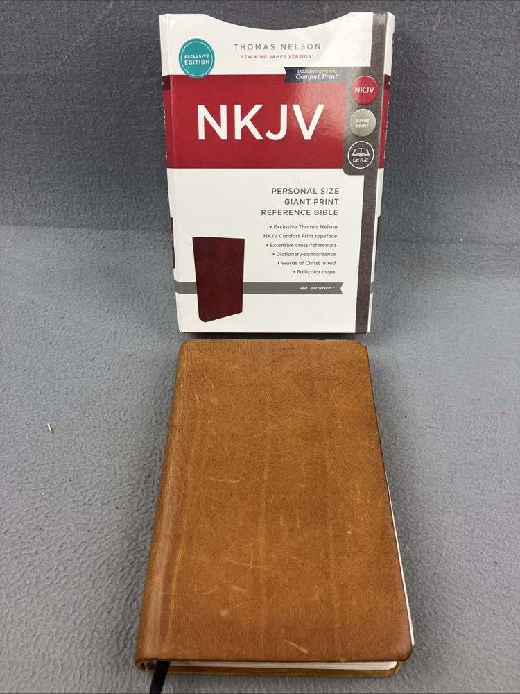 NKJV Bible: New King James Version Red Leather Soft, GIANT PRINT Rough Leather GOOD CONDITION -- CLEAN COPY/NO MARKINGS ON THE INSIDE (see pics) *Item will be protected well for shipping and comes with a tracking number for confirmation.* I ship out items every day so expect a quick delivery!