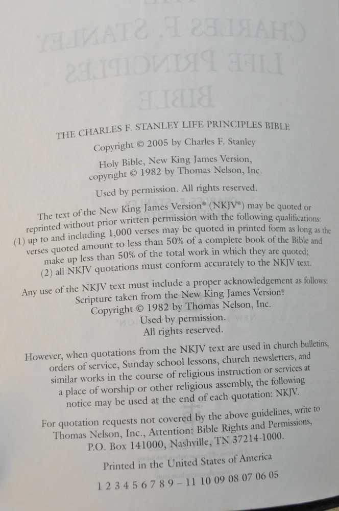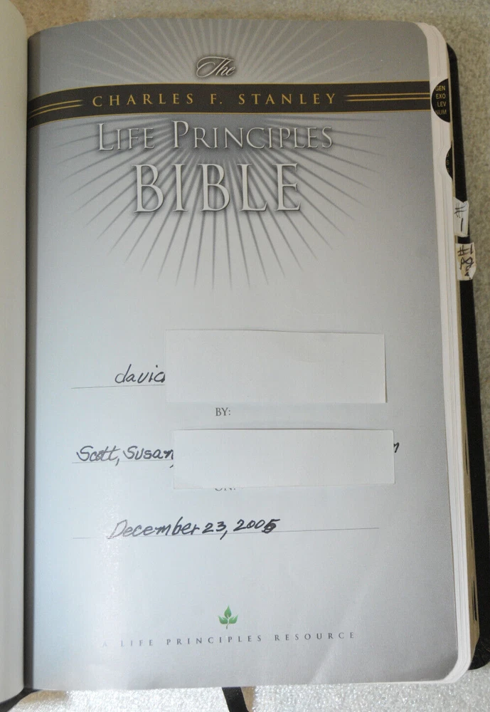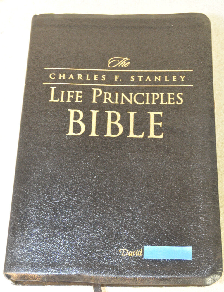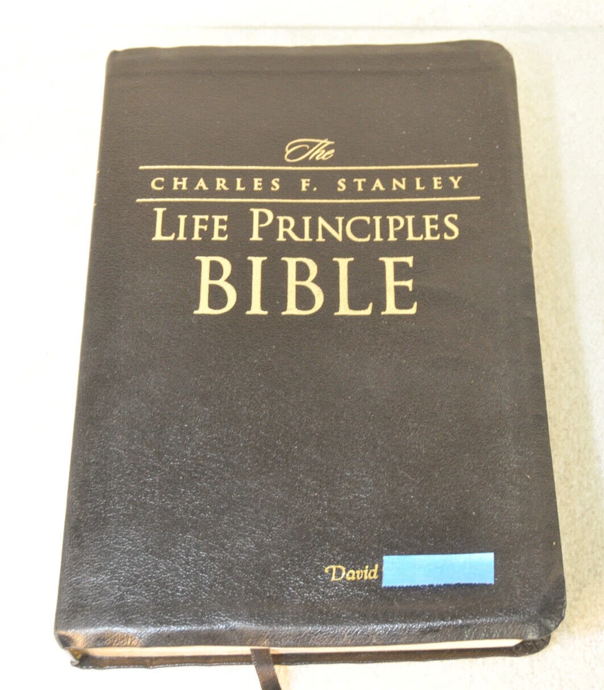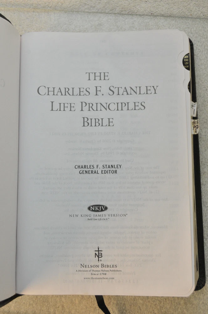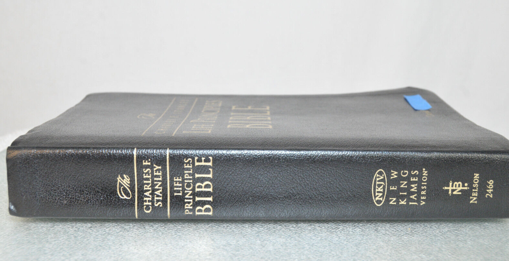 The Charles F. Stanley Life Principles Bible NKJV Signed First Edition First Printing 2005 Bound in Black Genuine Leathe r Nelson Bibles 2466. Printed in USA. Thumb Indexed. This First Edition New g James Version was inscribed and signed by Charles F Stanley dated December 2005. The Presentation Page was completed by the original owner's family and dated December 23, 2005. Very good pre-owned condition. Inscribed and Signed by Charles F Stanley on front end page to the original owner. Original owner's name imprinted on front cover in gold. Presentation page completed in permanent ink to original owner from his family December 2005. Red inked notes and yellow highlighting and some dogeared pages throughout this Bible. Please see all photos for details and condition. The recipient of this Inscribed Bible was also a minister until his passing. It is interesting to see the hand written notes as well as the highlighted passages and notes made by this late pastor in the Life Principle sections. The hand written notes and highlighting will be a bonus or plus for some people, while other people might prefer to start with a Bible free of handwritting and high lighting. If you fall into the second category, this Bible is not for you.