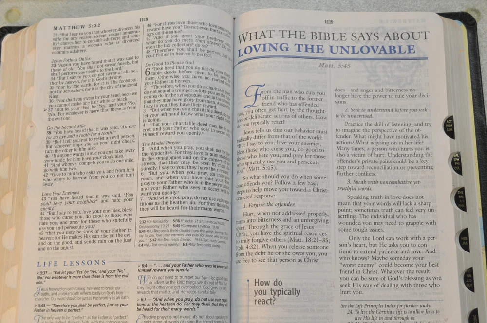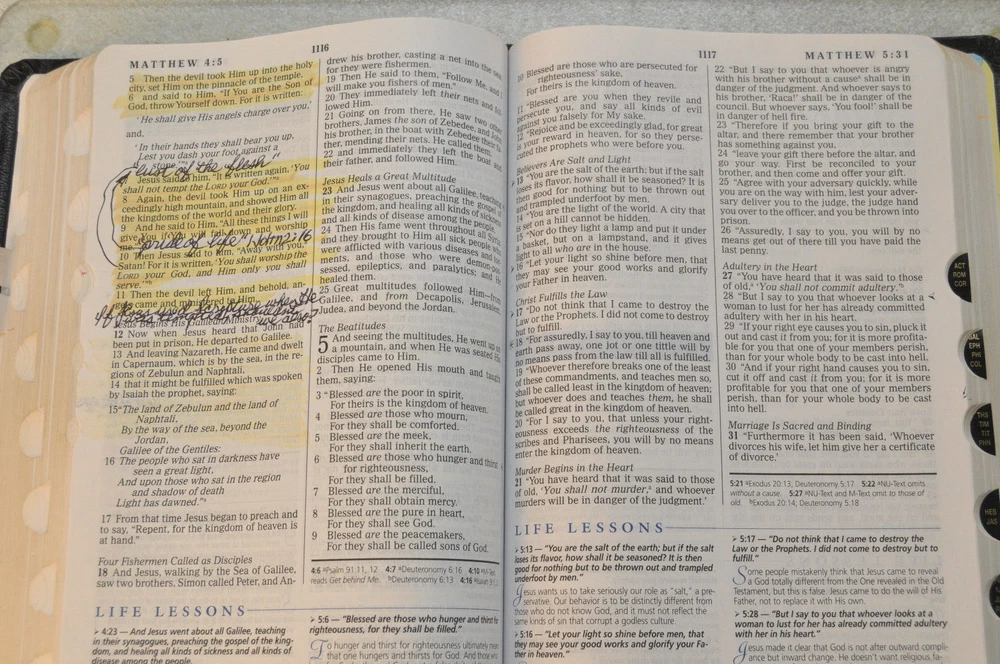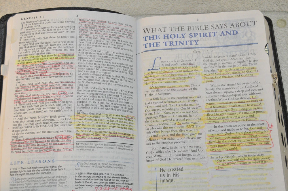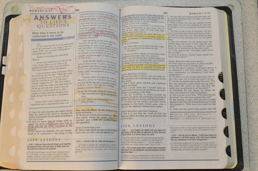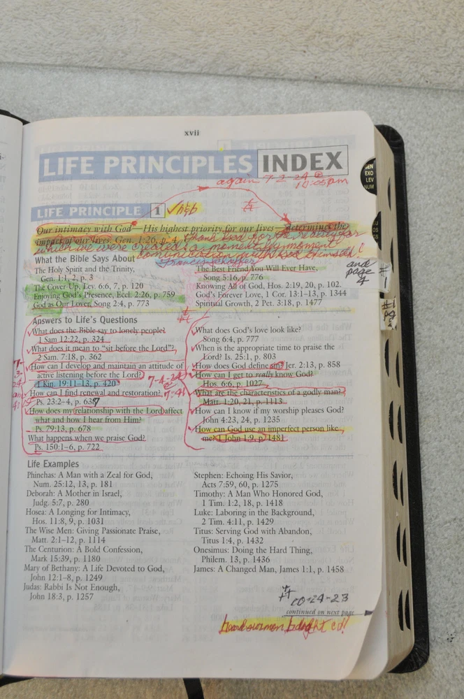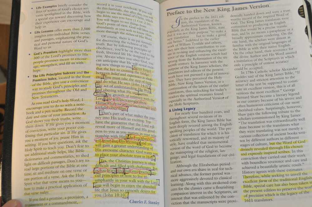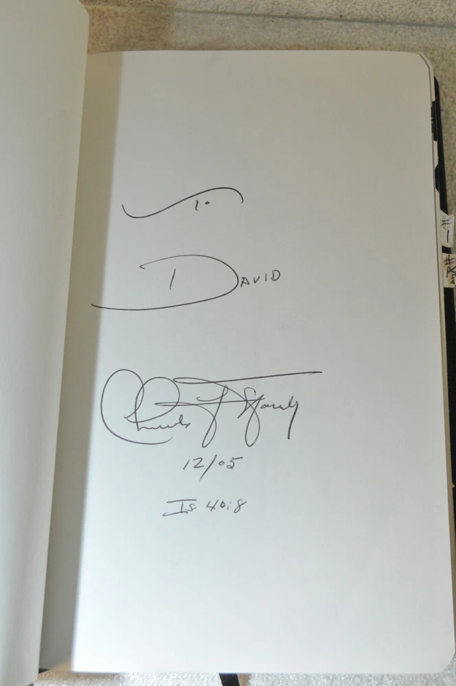 The Charles F. Stanley Life Principles Bible NKJV Signed First Edition First Printing 2005 Bound in Black Genuine Leathe r Nelson Bibles 2466. Printed in USA. Thumb Indexed. This First Edition New g James Version was inscribed and signed by Charles F Stanley dated December 2005. The Presentation Page was completed by the original owner's family and dated December 23, 2005. Very good pre-owned condition. Inscribed and Signed by Charles F Stanley on front end page to the original owner. Original owner's name imprinted on front cover in gold. Presentation page completed in permanent ink to original owner from his family December 2005. Red inked notes and yellow highlighting and some dogeared pages throughout this Bible. Please see all photos for details and condition. The recipient of this Inscribed Bible was also a minister until his passing. It is interesting to see the hand written notes as well as the highlighted passages and notes made by this late pastor in the Life Principle sections. The hand written notes and highlighting will be a bonus or plus for some people, while other people might prefer to start with a Bible free of handwritting and high lighting. If you fall into the second category, this Bible is not for you.