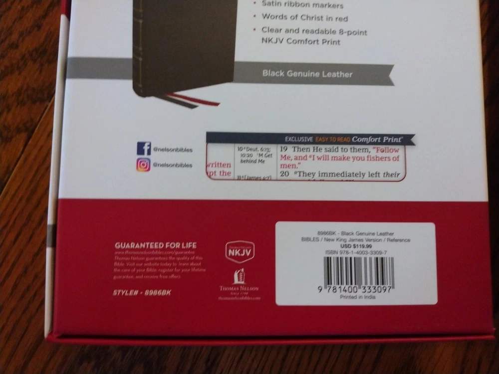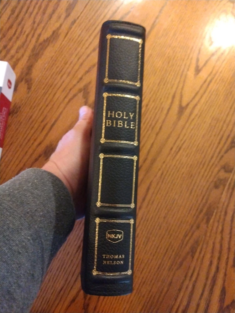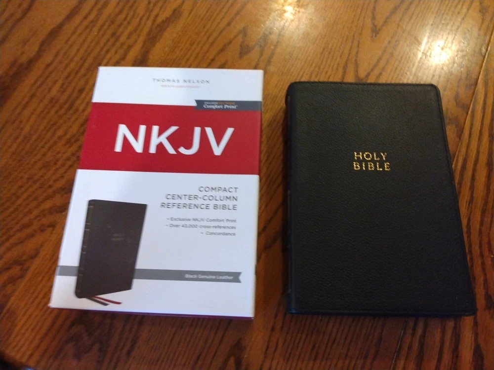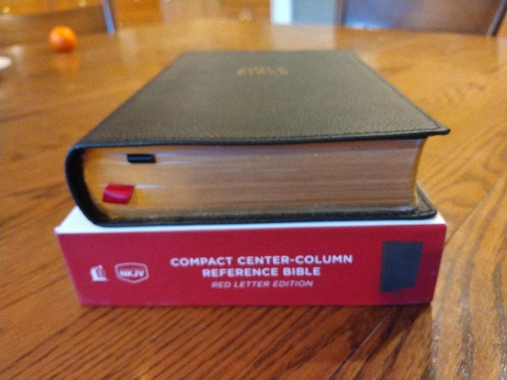 NKJV Compact Center-Column Reference Bible, Comfort Print--genuine leather, black Font/Text size is 8 point Dimensions: 7.5 X 5 (inches) Red letter for Christ's words Indexed Feel free to ask questions. I try to return and answer your questions in a timely manner and as soon as I am able. NO RETURNS. Please buy responsibly. Visit my eBay store at aboundingjoy66