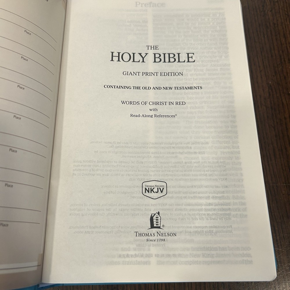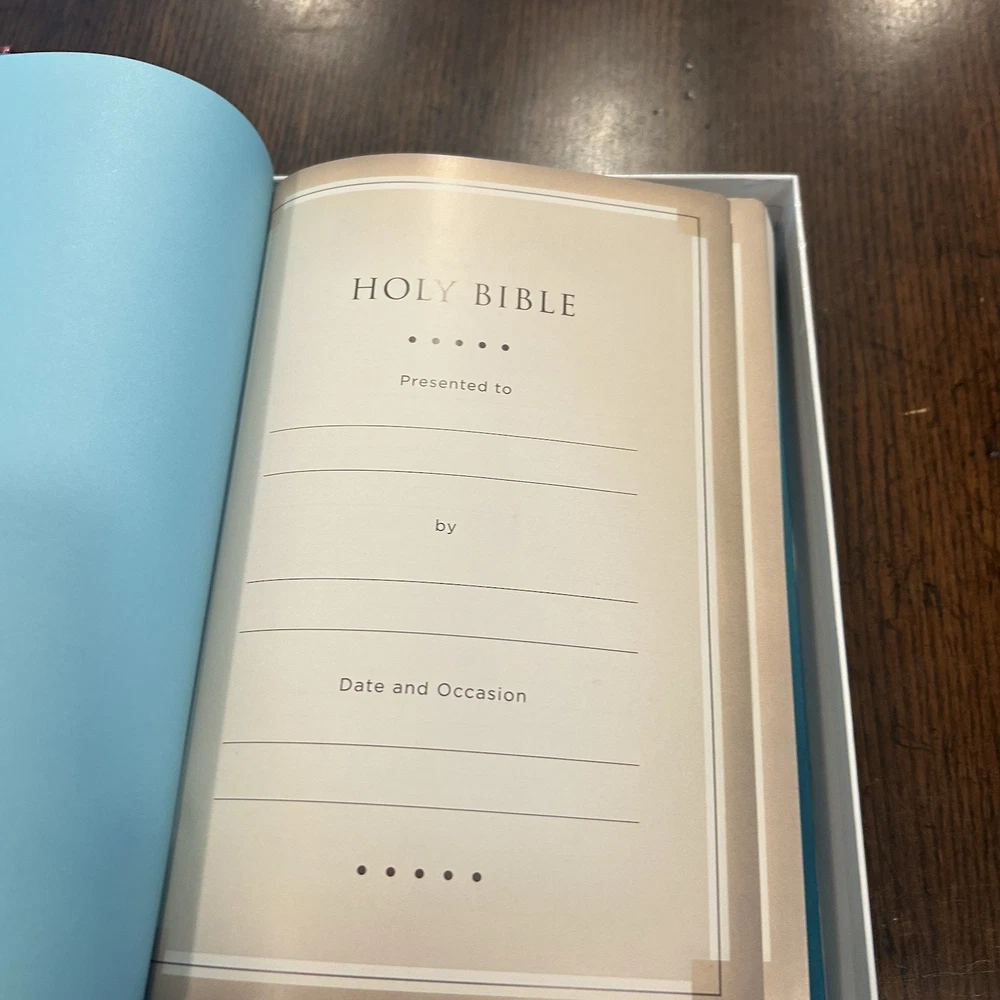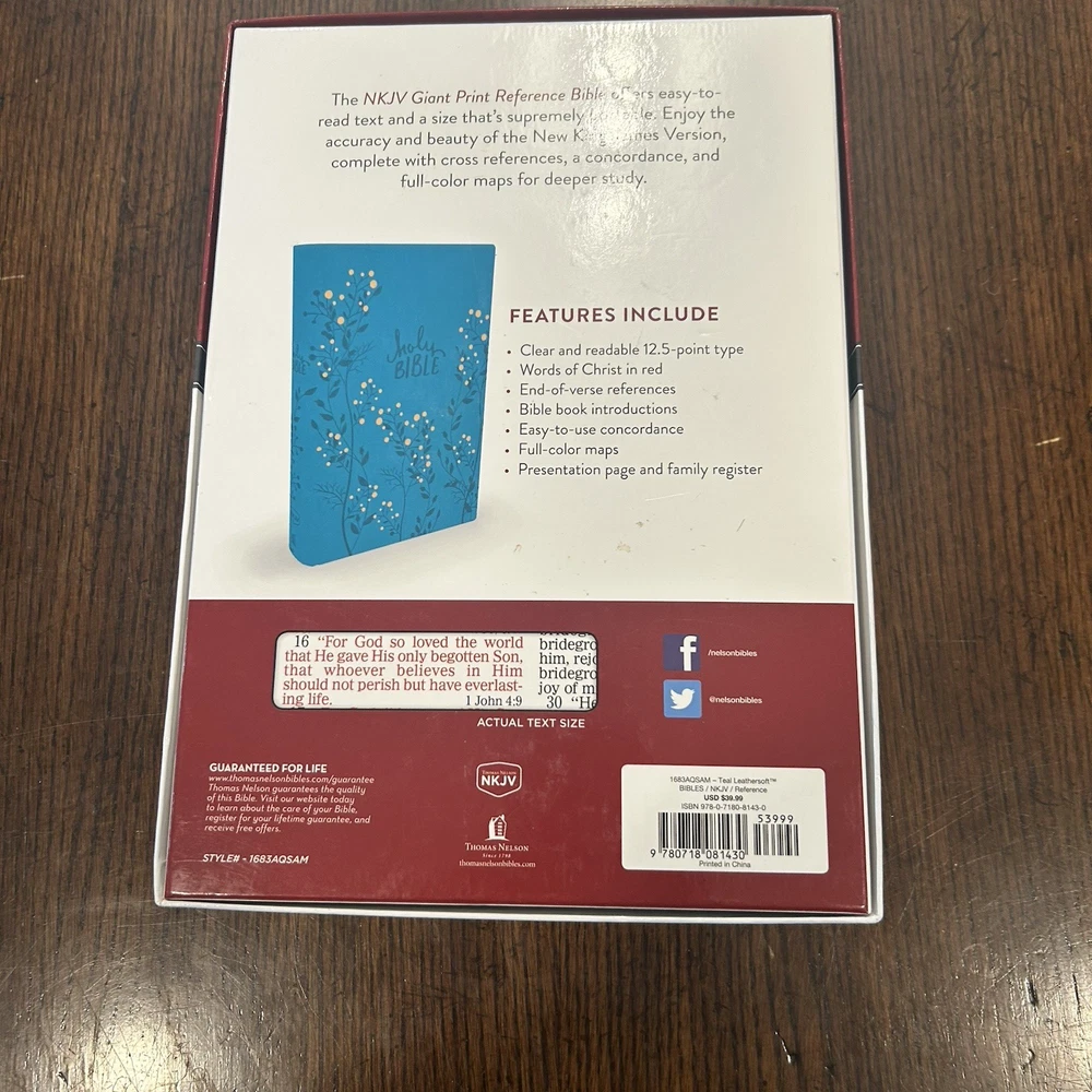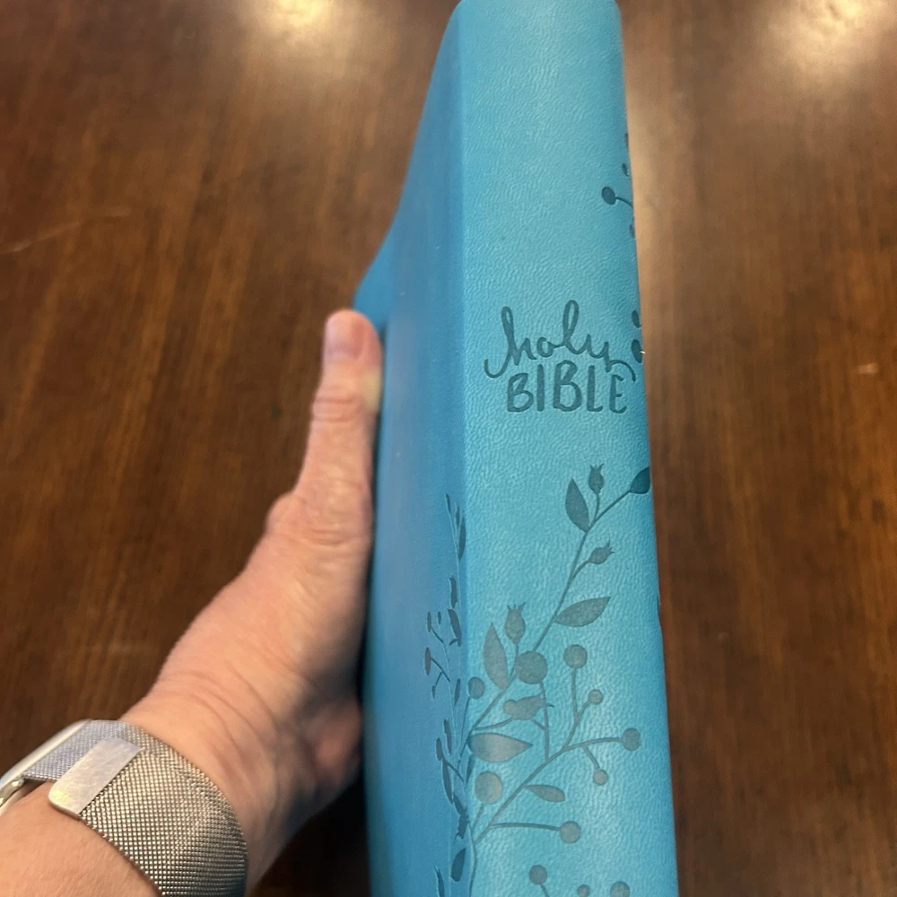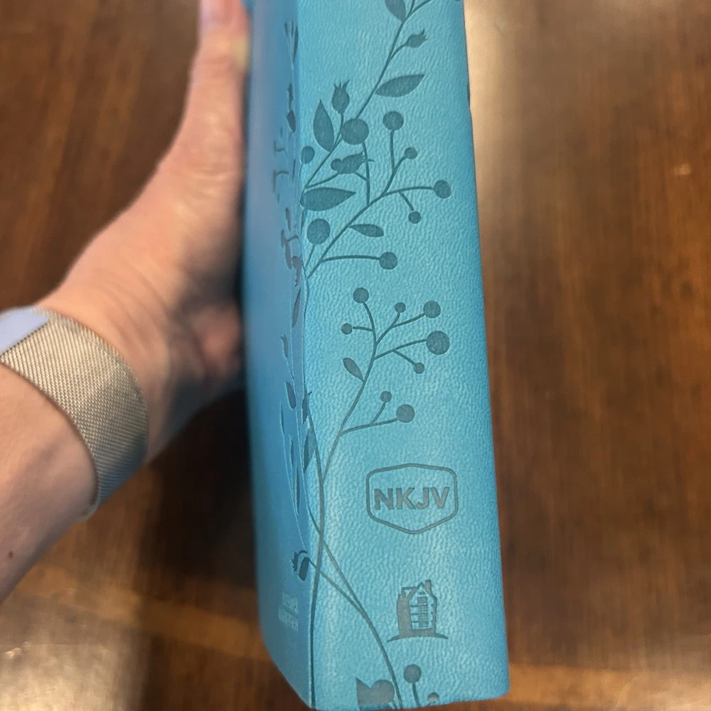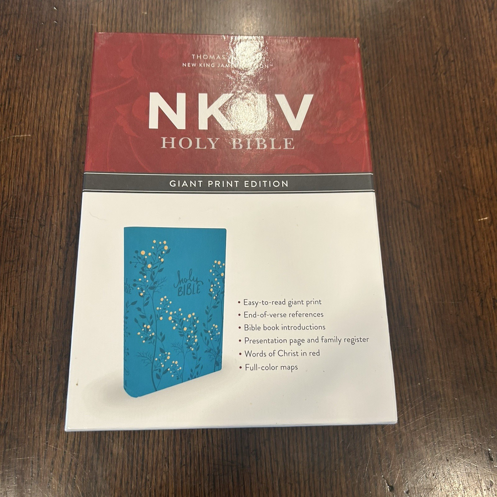 NKJV Giant Print Holy Bible Aqua Teal Embossed Imitation Leather EXCELLENT Excellent condition, the bible appears to be unread. Small signs of wear on box. Photos are part of my description, please use Zoom feature to inspect pics. Please use your Zoom feature to inspect the pictures. I do my best to highlight flaws if I see them. Reach out if you have questions or would like additional photos. Happy buyers are important to me. I appreciate your taking a look!