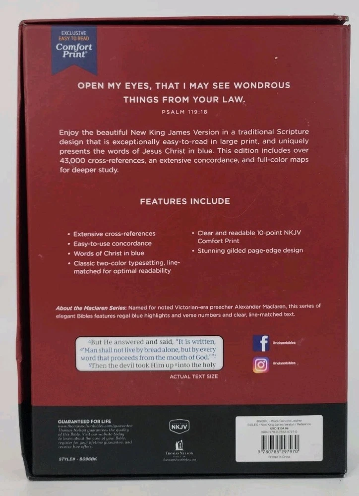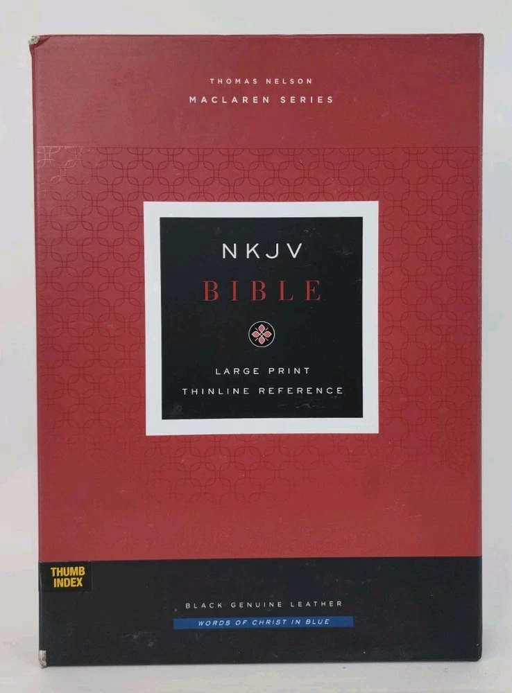 | Book Title | NKJV, Large Print Thinline Reference Bible, Blue Letter, Maclaren Series, Genuine Leather, Black, Thumb Indexed, Comfort Print : Holy Bible, New King James Version |