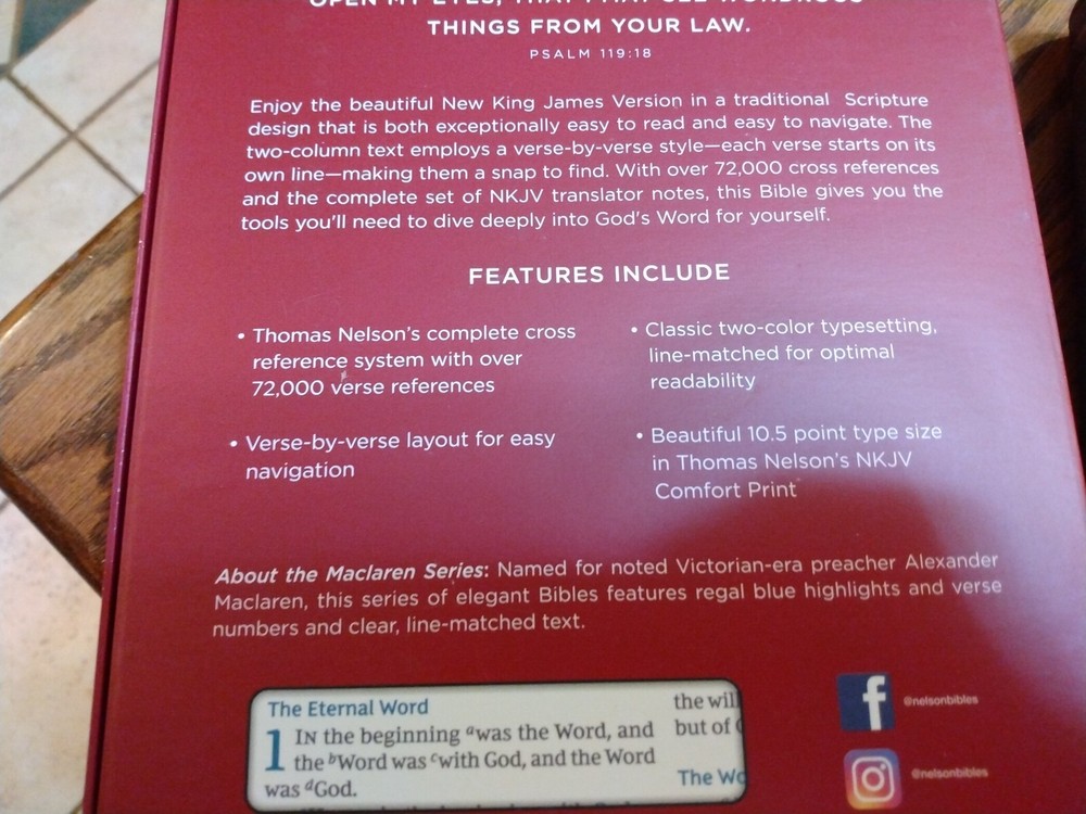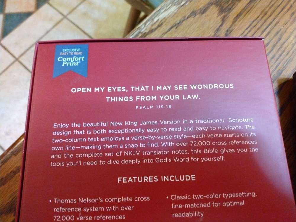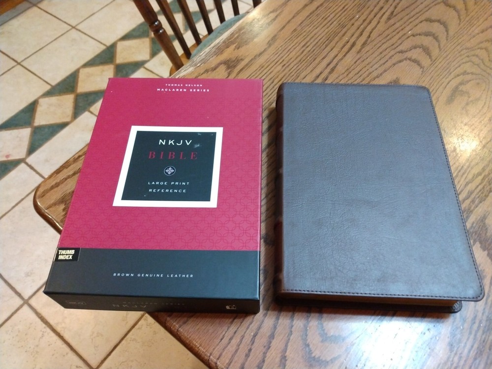 Retails for $109.99 Dimensions: 9.50 X 6.50 X 1.50 (inches) Font size/text size: 10.5 point Add To Cart Product Description NKJV tradition combined with enhanced features The NKJV Large-Print Verse-by-Verse Reference Bible has the classic features you'd expect for a NKJV Bible- a sewn binding that allows the cover and pages to lay flat, wide satin ribbons for keeping your place, and Scripture presented in a two column text. Printed on premium high-contrast paper with Thomas Nelson's exclusive Comfort Print typeface, the font has been designed to prolong your reading experience by minimizing eyestrain through a carefully researched style of design. The layout of the text is in a verse-by-verse format, allowing you to absorb and digest biblical passages that strike you without getting lost in a paragraph or section. The readability is enhanced by the large 10.5 point type and, with over 72,000 cross references available in the NKJV Large-Print Verse-by-Verse Reference Bible , you'll find yourself staying longer in God's Word. Features: Verse-by-verse layout for easy navigation Premium high-contrast Bible paper Ultra-flexible lay-flat sewn binding Wide double-faced satin ribbons Clear and readable 10.5-point NKJV Comfort Print Product Information Title: NKJV Large-Print Verse-by-Verse Reference Bible, Maclaren Series, Comfort Print--genuine leather, brown Format: Genuine Leather Number of Pages: 1584 Vendor: Thomas Nelson Bibles Publication Date: 2021 Dimensions: 9.50 X 6.50 X 1.50 (inches) Weight: 3 pounds ISBN: 078524218X ISBN-13: 9780785242185 References: Cross References Text Layout: Double Column Text Size: 10.5 Point Stock No: WW242185 Feel free to ask questions. I try to return and answer your questions in a timely manner and as soon as I am able. Visit my eBay store at aboundingjoy66 NO RETURNS ACCEPTED.