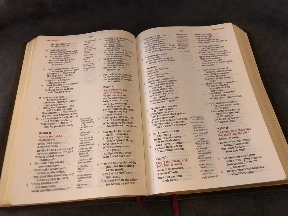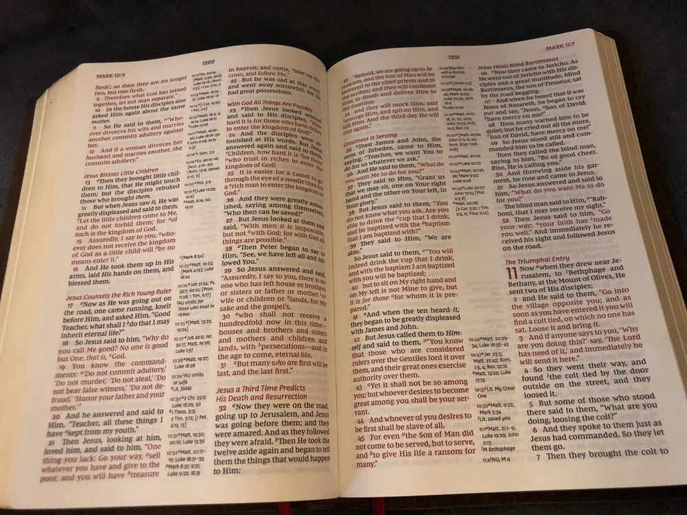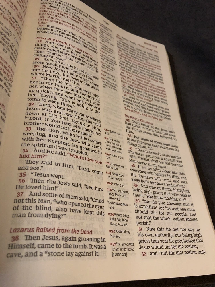 Item was as described, no marks or highlights in the txt which is what I wanted. He does great quality work on rebinding the Bible. I was searching for a NASB 95 life application Bible, but they are no longer in print and not many out there that doesn’t have mark free txt. Seller is up front regarding shipping. Bible was neatly packed. For what I was looking for this was a great value. Keep doing the Lords work!