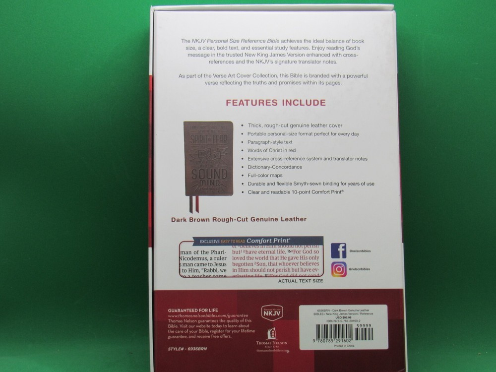 Explore the depths of faith with the NKJV Personal Size Reference Bible, featuring the Verse Art Cover Collection and presented in a stylish genuine leather format. This Bible, published by Thomas Nelson in 2022, offers a comfortable reading experience with its red letter text and easy-to-read Comfort Print. With its comprehensive 1568 pages, the text is laid out in a reader-friendly format, measuring 9.6 inches in length, 6.3 inches in width, and 1.6 inches in height, making it a portable and convenient companion for your spiritual journey. Delve into the Scriptures with the confidence that this Bible, weighing 35.5 ounces, is a valuable addition to your library. It is not only a tool for daily devotion and study but also a testament to your faith. The combination of its inspirational cover art and in-depth reference capabilities makes it an ideal choice for both personal use and scholarly pursuit, satisfying the needs of those seeking a Bible that is as visually appealing as it is spiritually enriching. FEATURES INCLUDE: Thick rough-cut genuine leather cover Portable personal-size format perfect for every day Paragraph-style text Extensive cross-reference system and translator notes Dictionary-Concordance Full-color maps Durable and flexible Smyth-sewn binding for years of use Clear and readable 10-point Comfort Print Two Ribbon markers Brand New - We ship FREE to any address in the United States