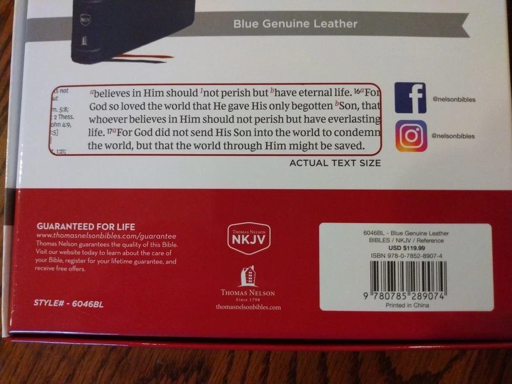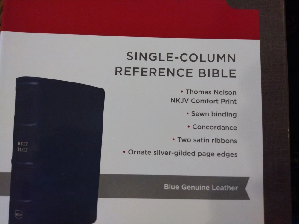 NKJV Single-Column Reference Bible Genuine Leather, Blue, Comfort Print Font/Text size is 10.5 point Dimensions: 8.75 X 5.75 X 1.75 (inches) Sewn Spine for durability Elegant single-column format Beautiful Thomas Nelson NKJV Comfort Print typeface More than 72,000 text cross-references Concordance Sewn lay-flat bindings Genuine leather cover Two satin ribbon markers 10.5-point print size Feel free to ask questions. I try to return and answer your questions in a timely manner and as soon as I am able. NO RETURNS. Please buy responsibly. Visit my eBay store at aboundingjoy66