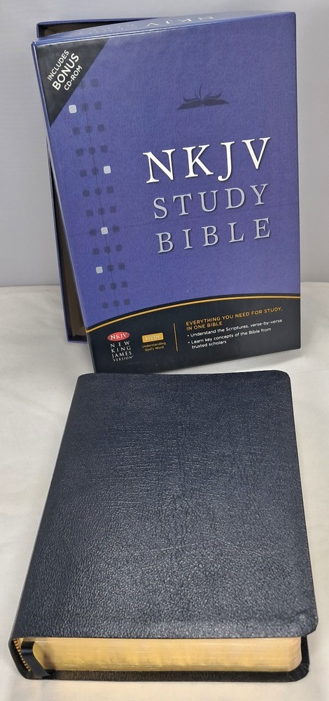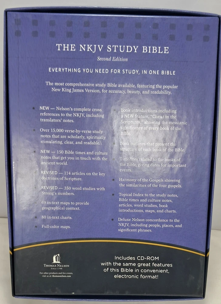 NKJV Study Bible 2nd Edition Thomas Nelson 2007 Leather Bound No Cd Rom With Box. This Bible is pre-owned. It is in very nice condition. It has no writing or highlights in it from use. It looks like it was really never used. It has the original box. It does NOT have the cd-rom. Original price on box was $69.99. It measures approximately 2 x 7 x 9 1/2". Pictures are part of the description. Thanks for looking!