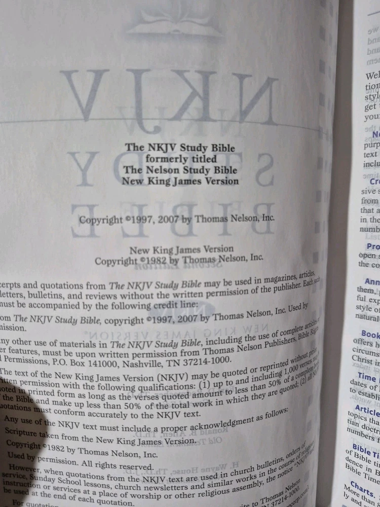 Excellent NEW condition. No writing. No tears. No creases. No warping. No visible imperfections. Gilded pages shine. *I am happy to take any additional photos that you may request. Free shipping within the USA The NKJV Study Bible Second Edition 2007 by Thomas Nelson is a luxurious leather-bound Bible featuring gilded page ends and an embossed spine. This study Bible, part of the Holy Bible series, is designed for young adults, ages 9-12, and adults, making it an ideal choice for personal or group study. With over 2300 pages, this Bible includes commentary, maps, and other educational features to aid in understanding the New King James Version of the scripture. Published in the 2007 by Thomas Nelson Publishing Staff, this Bible is a valuable addition to any religious library.