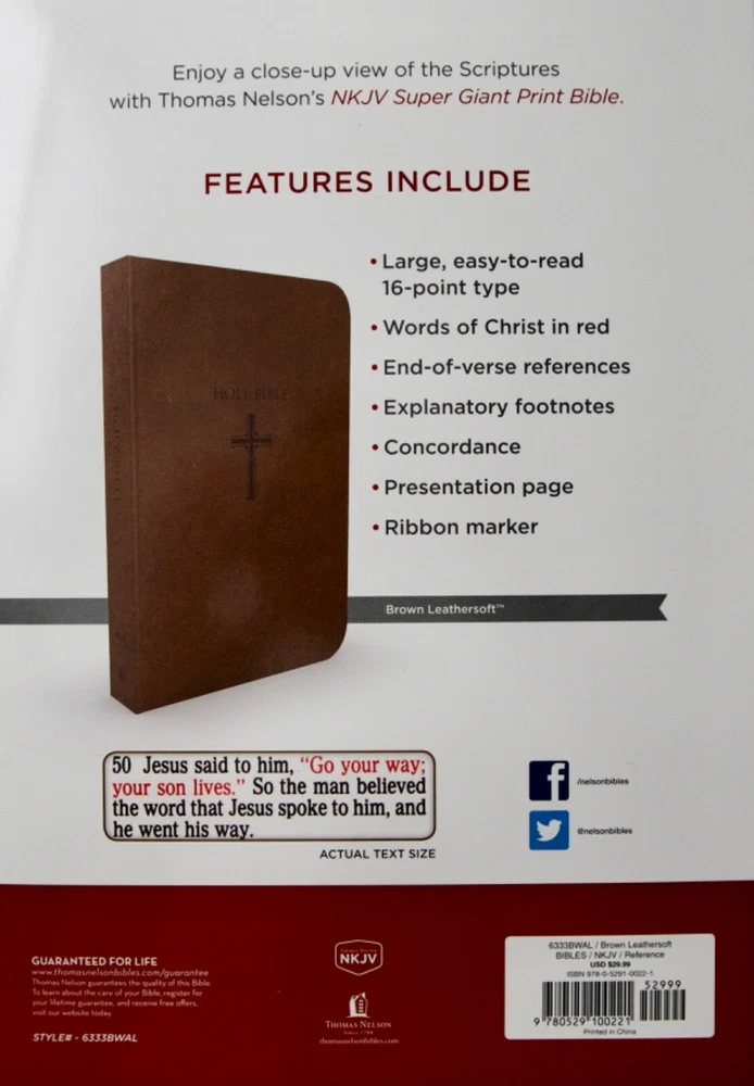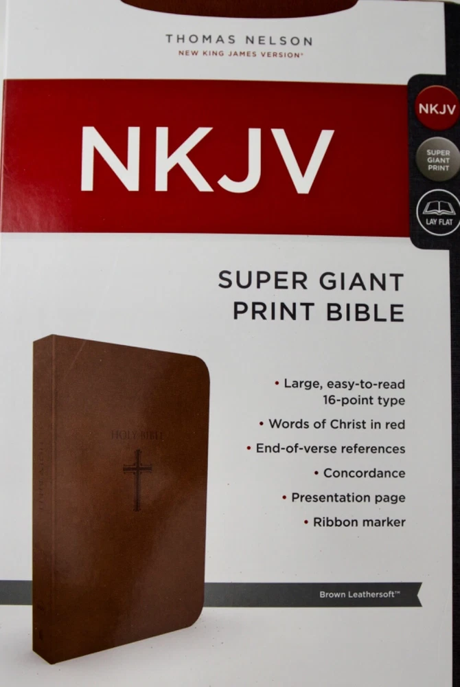 NKJV Super Giant Print Bible, Brown Leathersoft *Large, Easy-to-Read 16-Point Type. *Words of Christ in Red. *End-of-Verse References. *Ribbon Marker and Concordance. * Size : 10.5 x 7.25 x 1.25 Inches. For more details, please see HD photos. Please check our eBay store for more products you LOVE! All items come from a clean, pet-free and smoke-free environment.