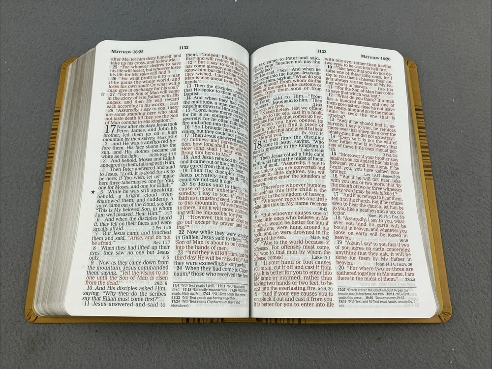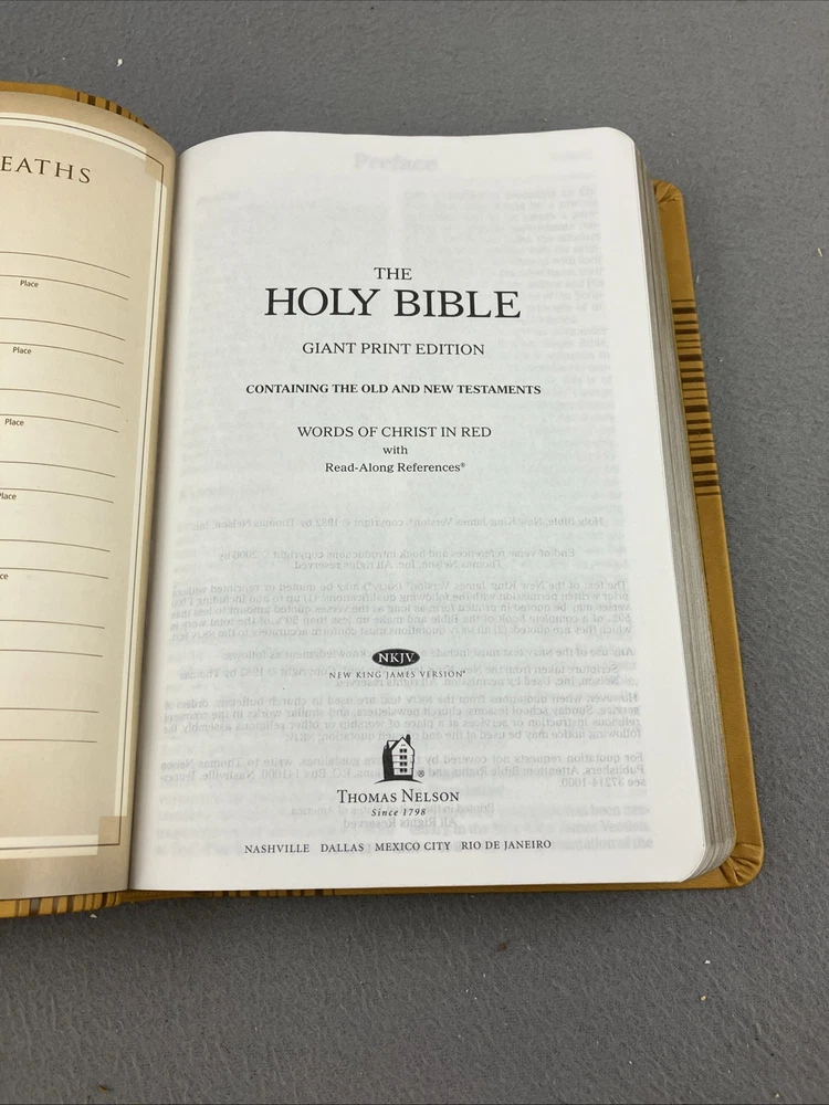 NKJV Toffee leathersoft Bible Giant Print Edition Red Letter Nelson W Box GOOD CONDITION -- CLEAN COPY/NO MARKINGS ON THE INSIDE (see pics) *Item will be protected well for shipping and comes with a tracking number for confirmation.* I ship out items every day so expect a quick delivery!