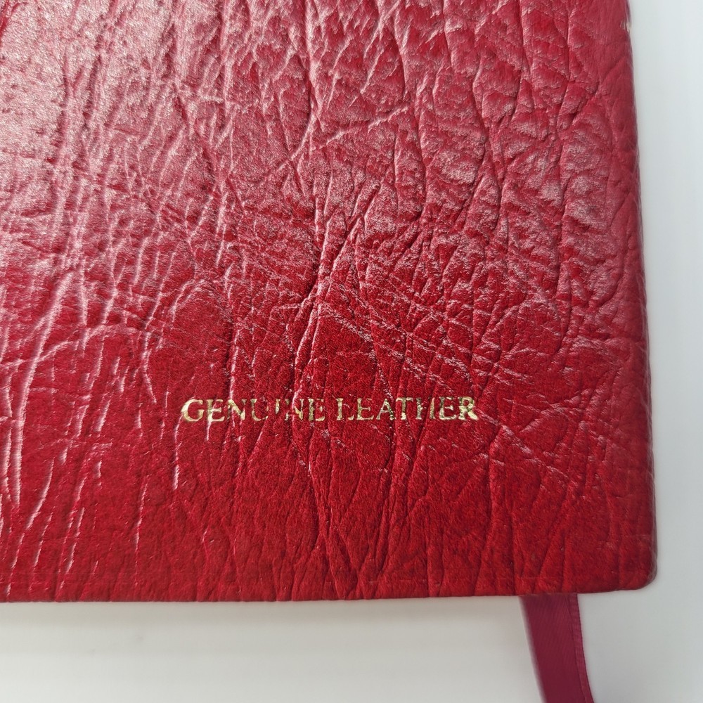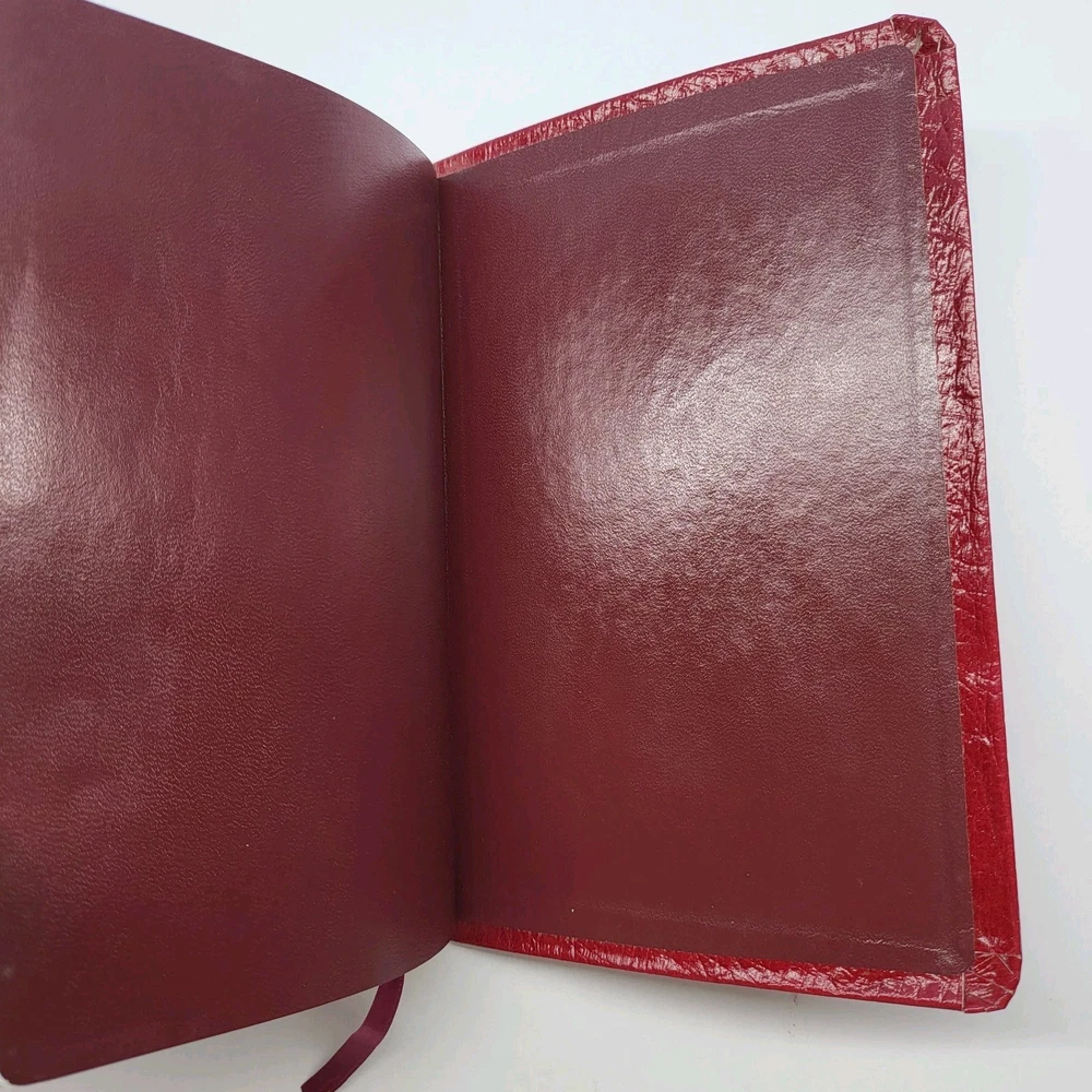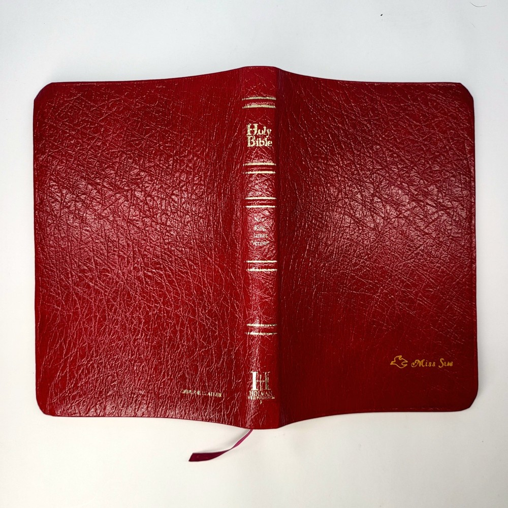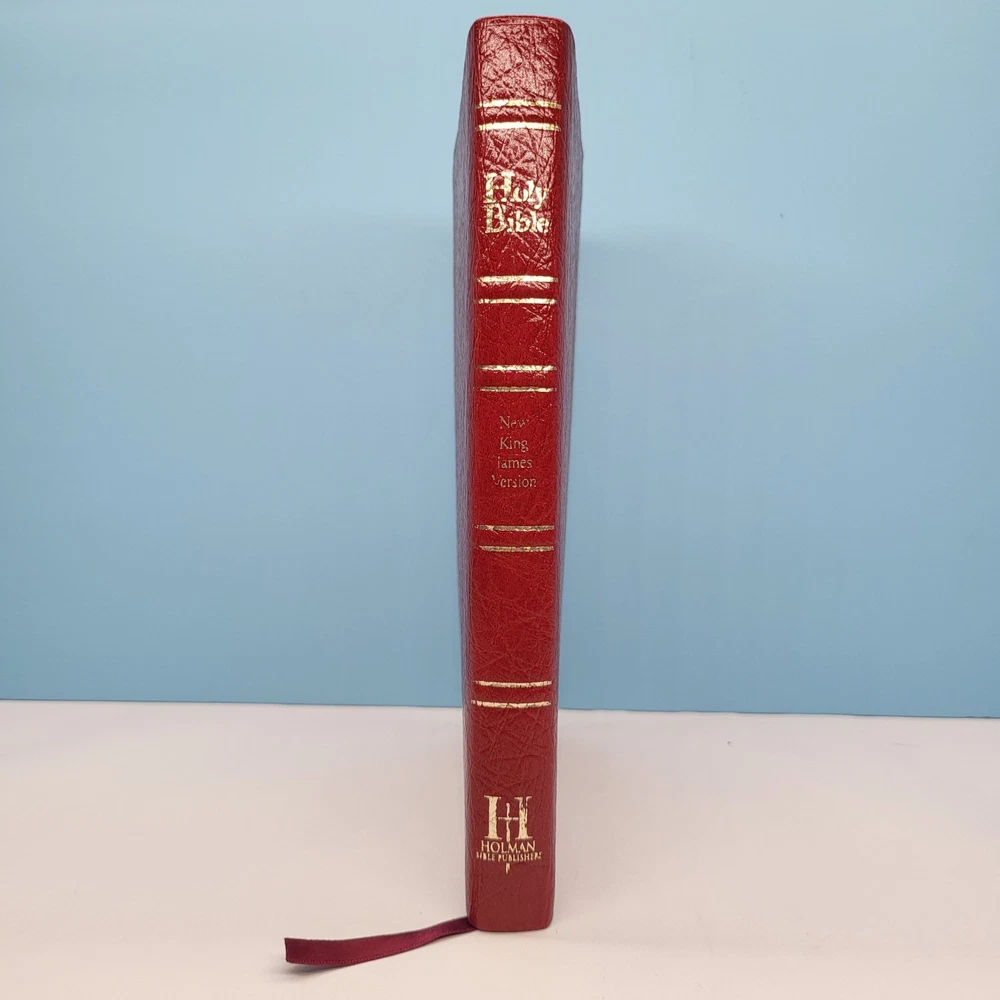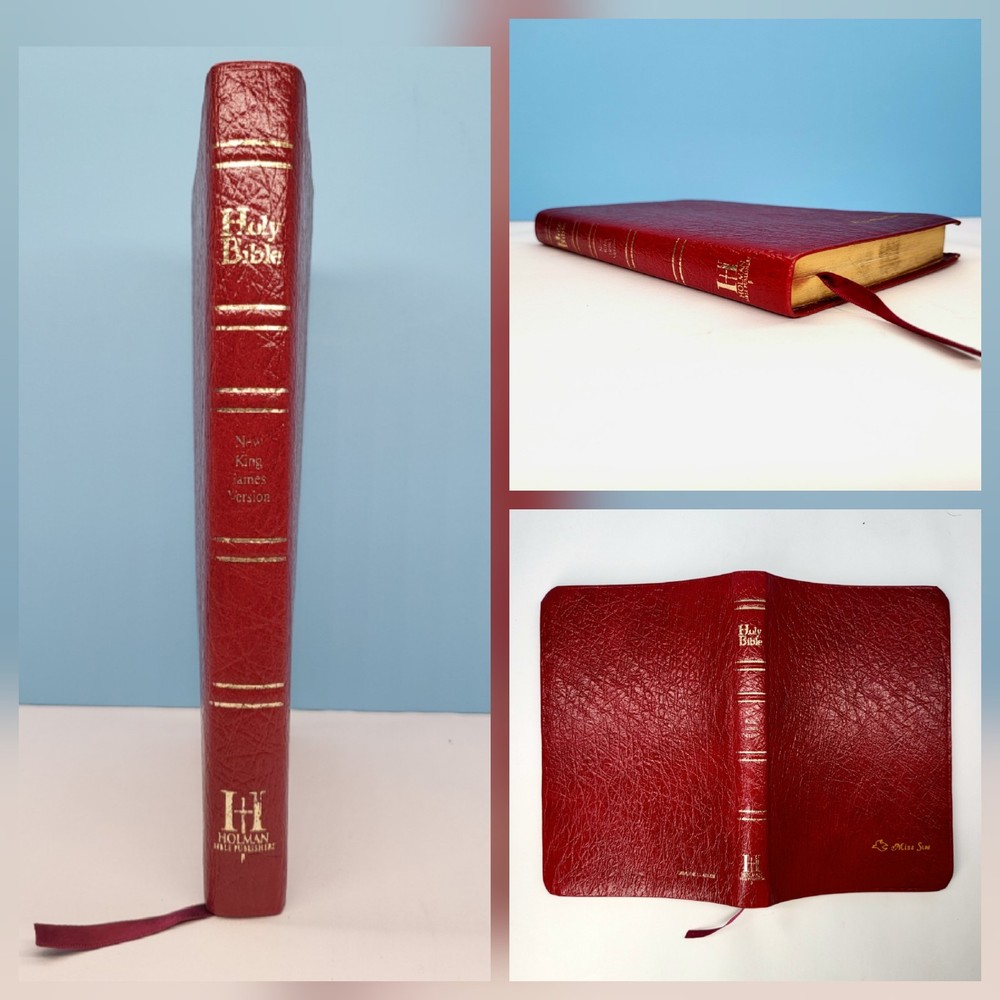 This is a burgundy, genuine leather, slim line, soft cover New King James version bible. Red letter edition. There is a personalized name on the front cover & and on the "presented to" page. There is minimal underlining. Please see pictures. No highlighting that I could find. There is one piece of writing on the back page. There is a matching ribbon bookmark. The pages are gold rimmed.