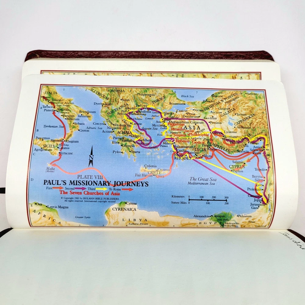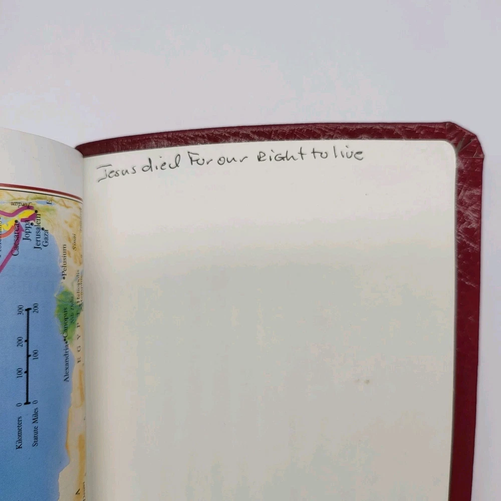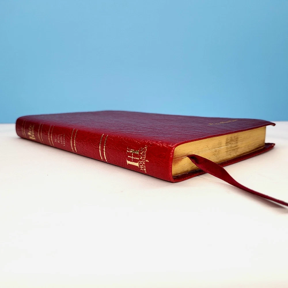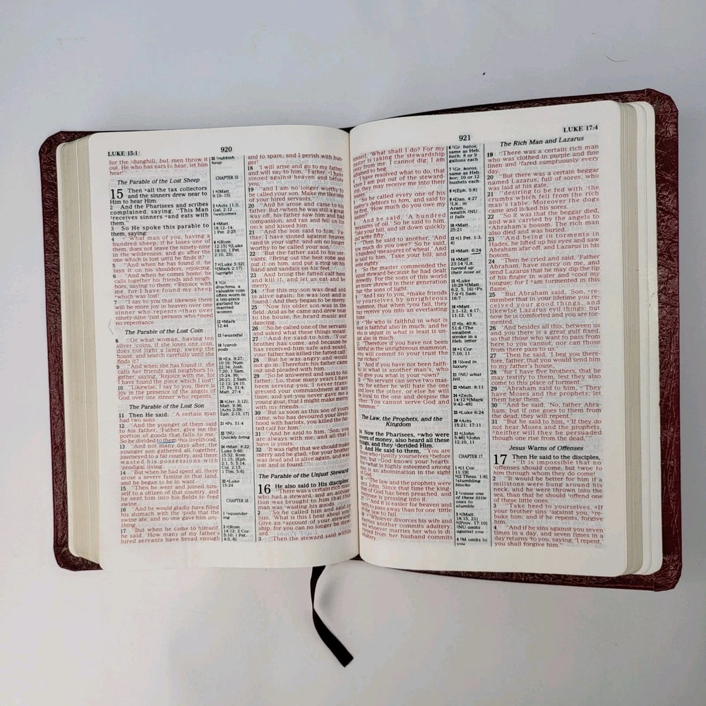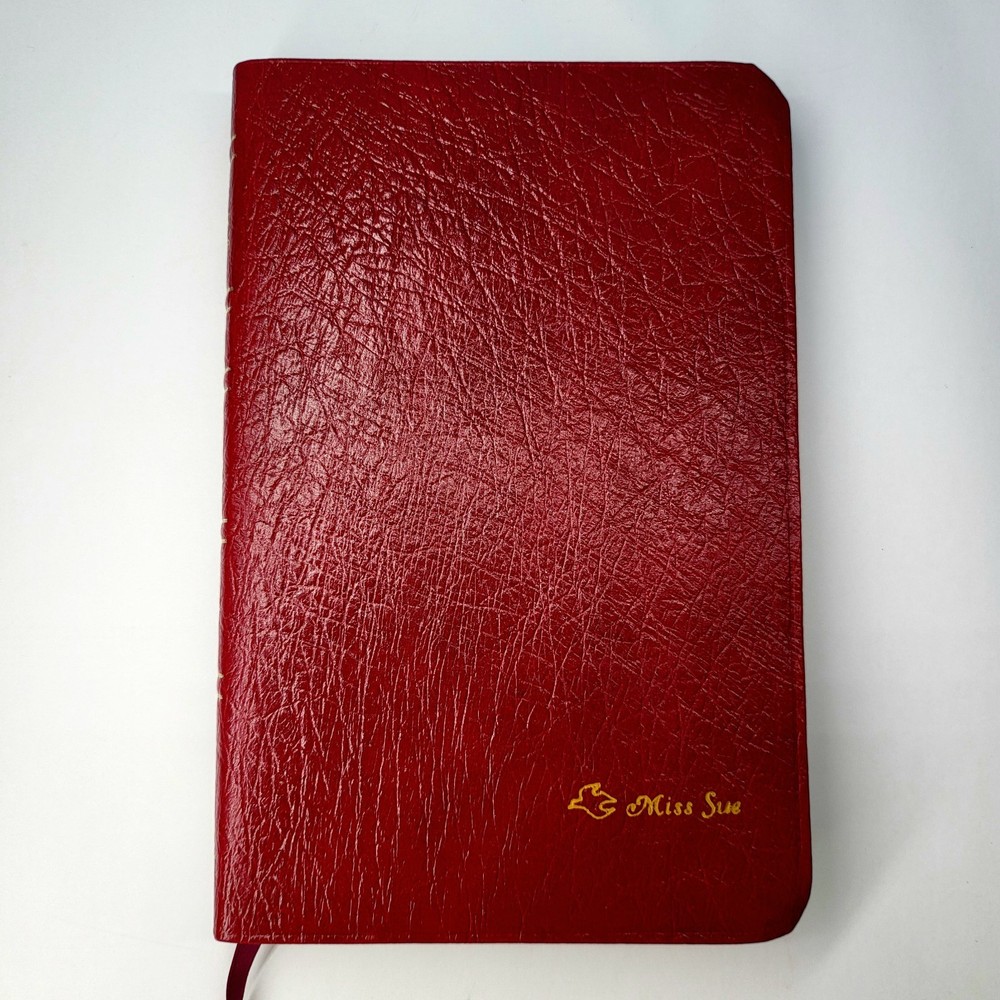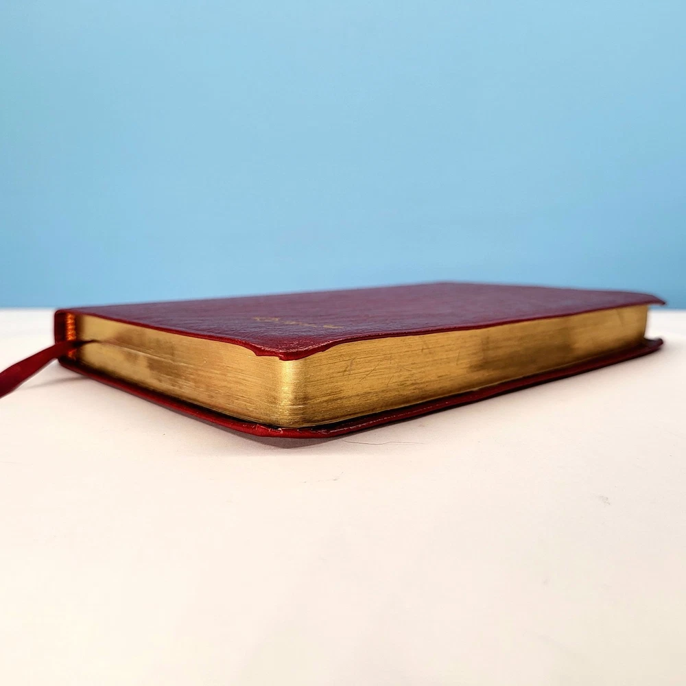 This is a burgundy, genuine leather, slim line, soft cover New King James version bible. Red letter edition. There is a personalized name on the front cover & and on the "presented to" page. There is minimal underlining. Please see pictures. No highlighting that I could find. There is one piece of writing on the back page. There is a matching ribbon bookmark. The pages are gold rimmed.