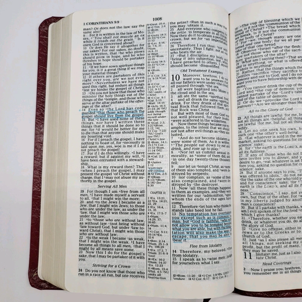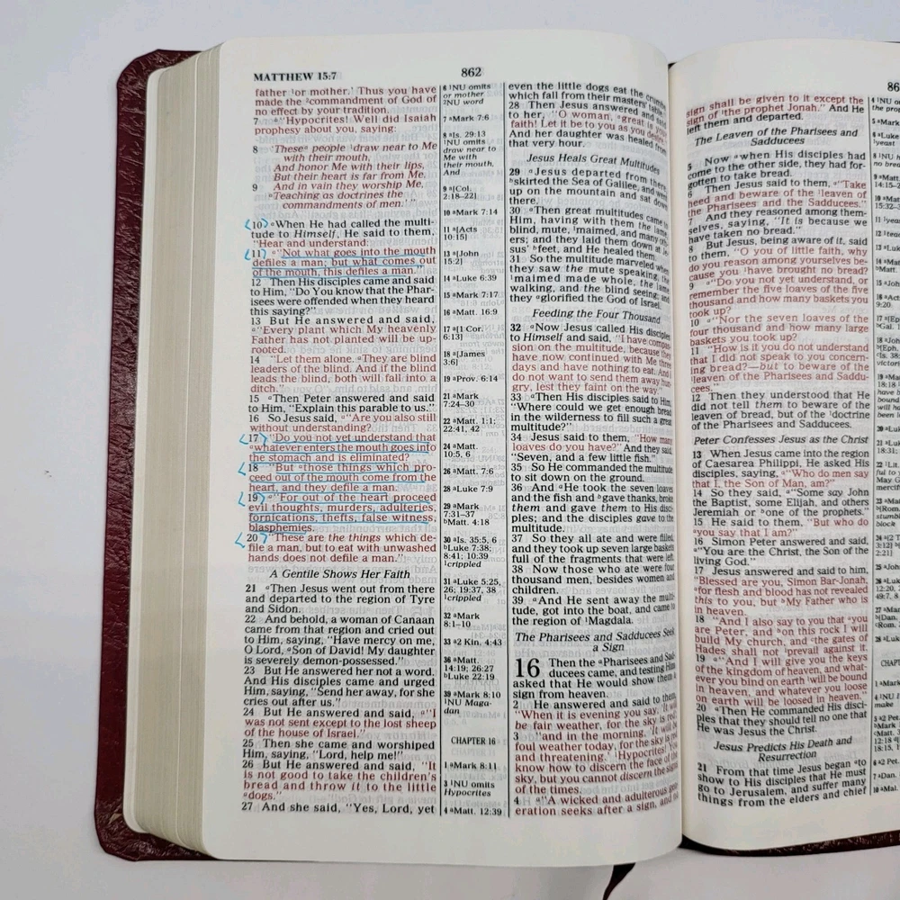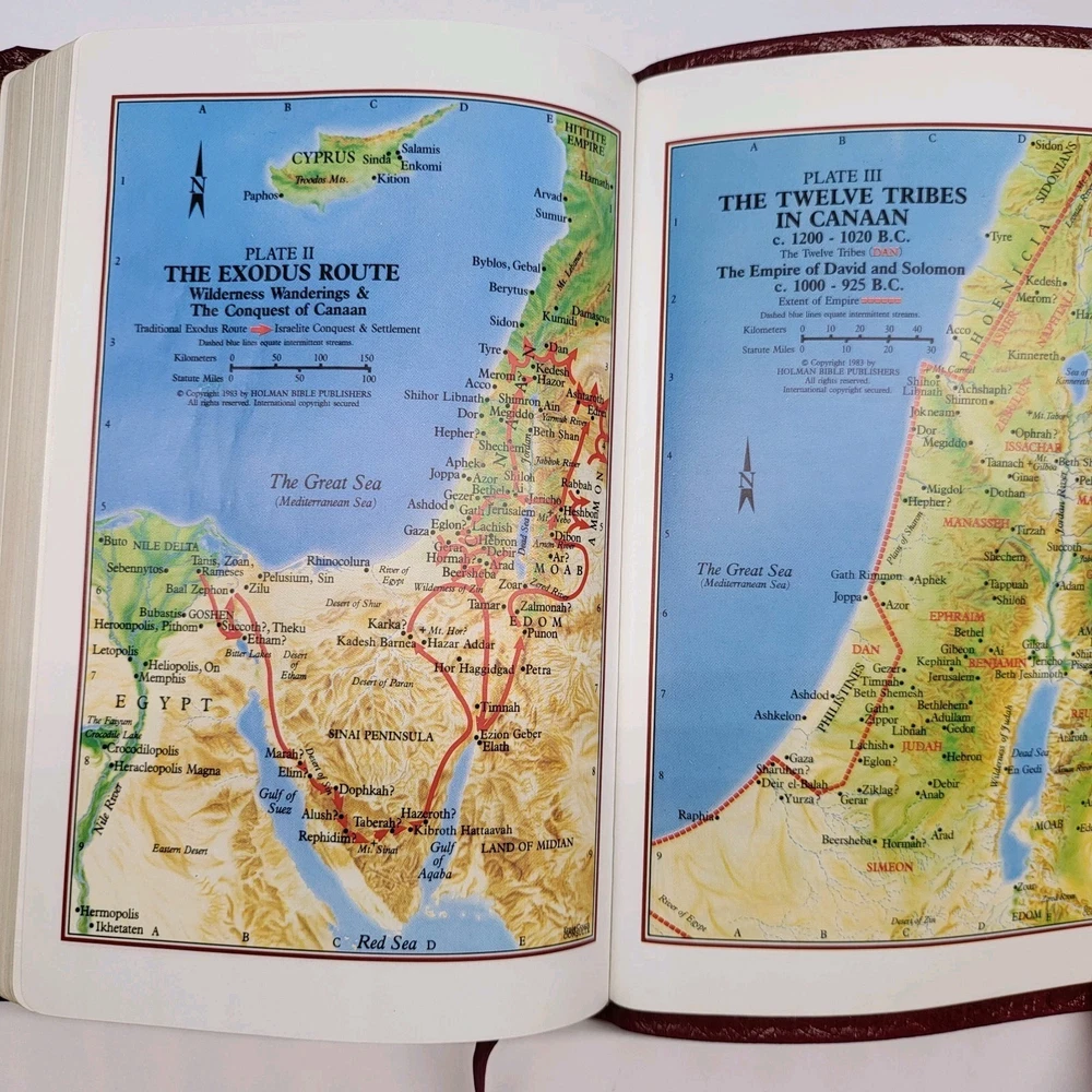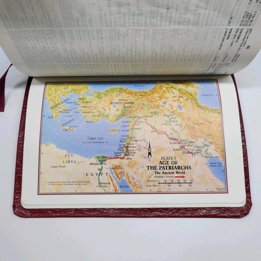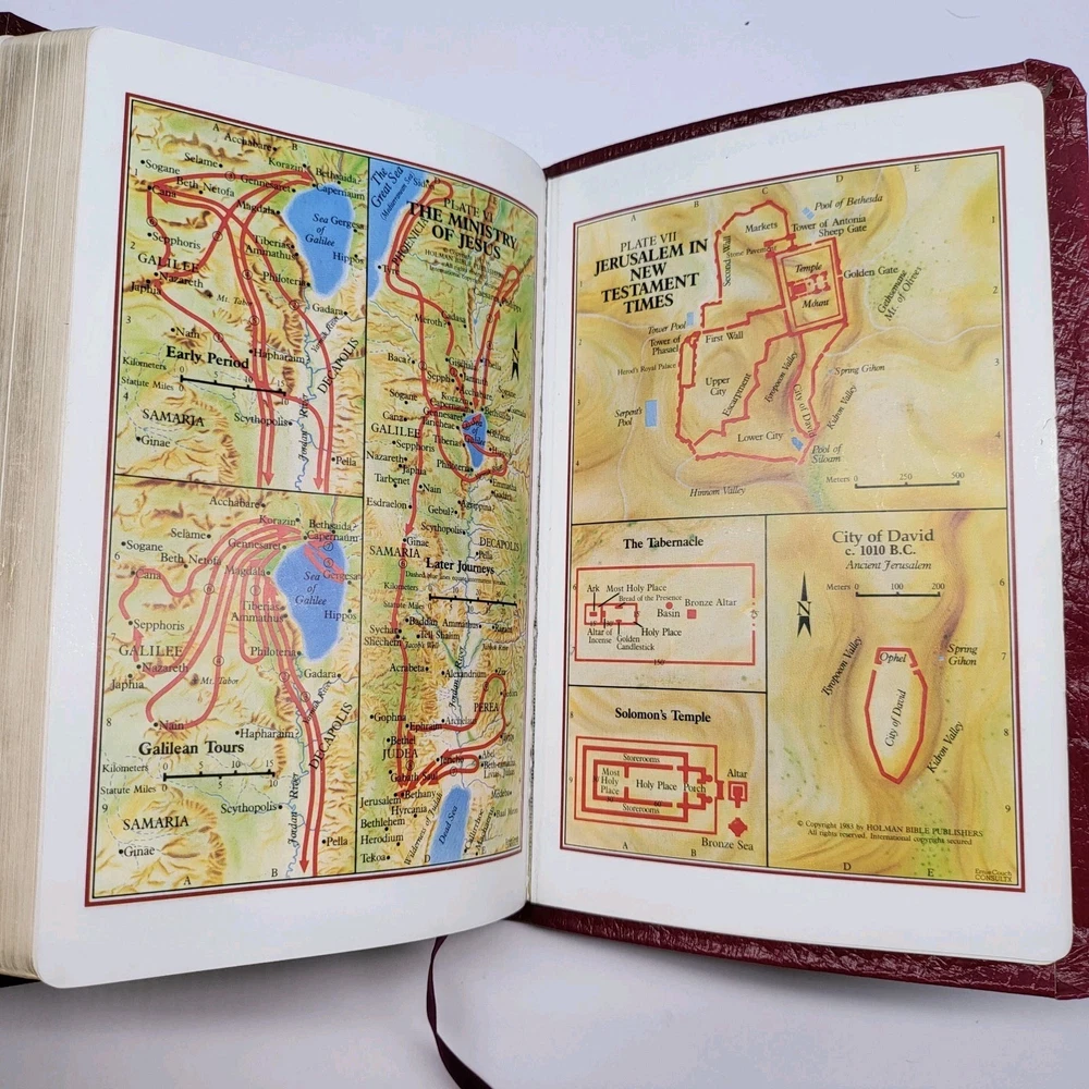 This is a burgundy, genuine leather, slim line, soft cover New King James version bible. Red letter edition. There is a personalized name on the front cover & and on the "presented to" page. There is minimal underlining. Please see pictures. No highlighting that I could find. There is one piece of writing on the back page. There is a matching ribbon bookmark. The pages are gold rimmed.