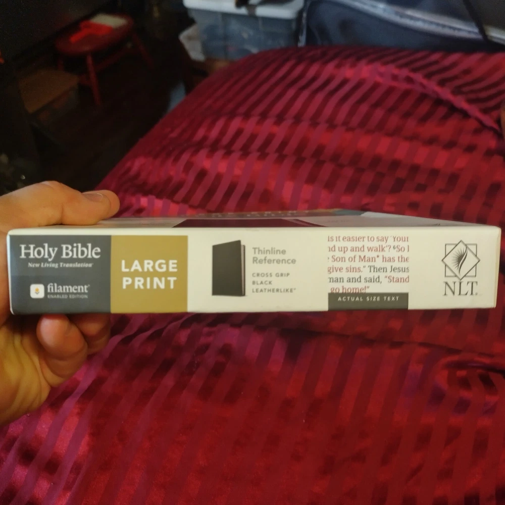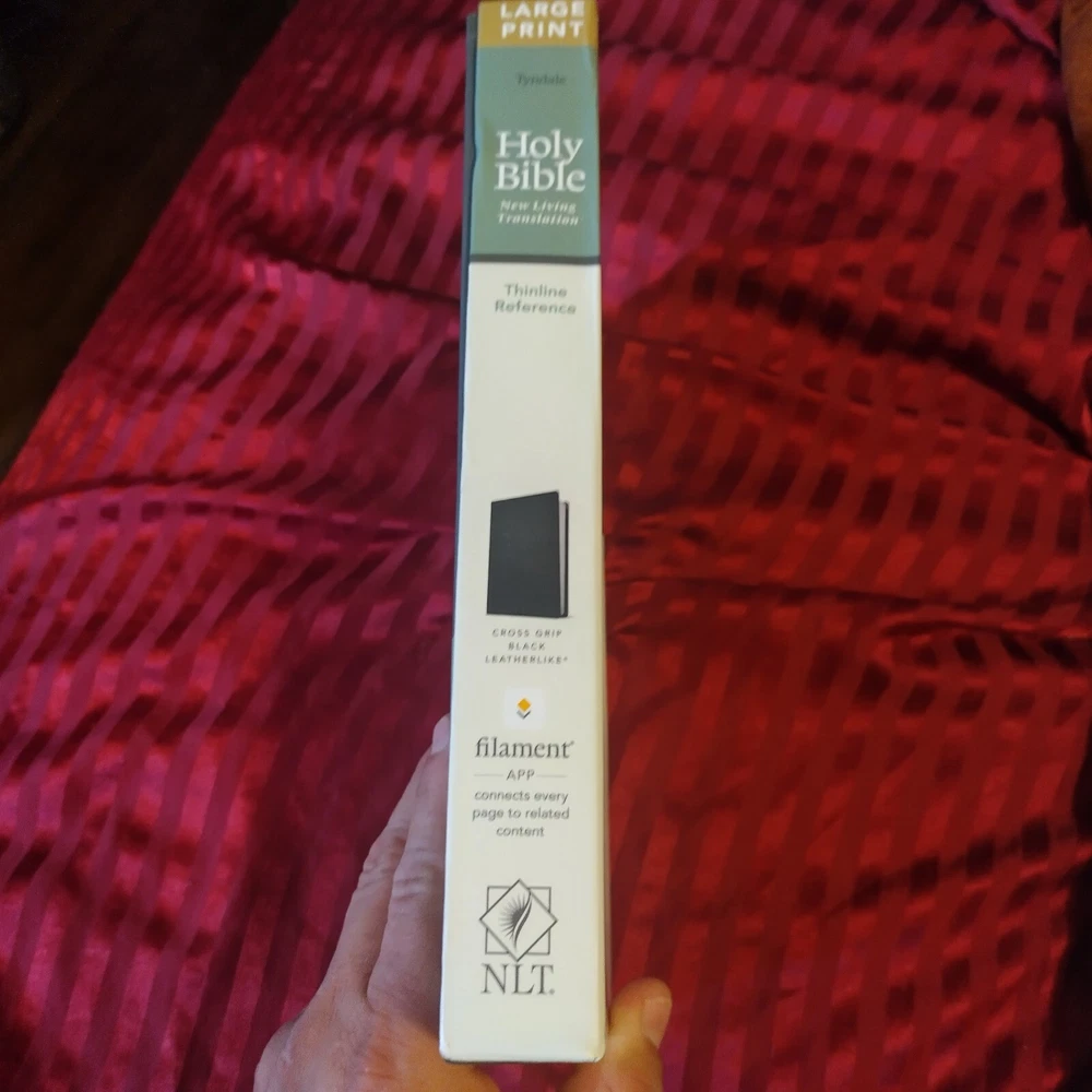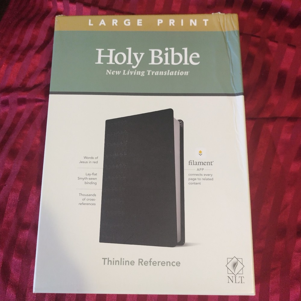 OUTSIDE COVER CRINKLED AT CORNER NLT Large Print Thinline Reference Bible, Filament Enabled Edition (Red Letter, Leatherlike, Black) - (Leather Bound) The Bible Reading Experience: Reimagined The new Tyndale classic NLT Large Print Thinline Reference Bible, Filament-Enabled Edition has readable text, an attractive layout, and cross-references in a thin, easy-to-carry size. And while it has the same low price as basic text-only Bibles, the NLT Large Print Thinline Reference offers much more. It not only features a bold new design and the trusted and much-loved New Living Translation (NLT) but also includes the groundbreaking Filament Bible app. This app enables you to use your mobile phone or tablet to connect every page to a vast array of related content, including study notes, devotionals, interactive maps, informative videos, and worship music. The Filament Bible app turns this Bible into a powerful study and devotional experience, offering more to expand your mind and touch your heart than you can possibly hold in your hand. And there is no additional cost for the Filament Bible app. No additional purchase. No additional size or weight. Of course, you can use this Bible without the app, but when you want to dig deeper, grab your phone or tablet and open the Filament Bible app. It's so easy to use. Features: New designs and Filament content for each page! Readable large print Handy thin size Words of Jesus in red Thousands of cross-references Quality lay-flat Smyth-sewn binding Tyndale Verse Finder Presentation page Ribbon marker Gilded page edges Filament Bible app with free access to: 25,000 study notes 350+ videos 40+ maps and infographics 400+ profiles and articles 1,500+ devotionals Library of worship music Specifications Dimensions (Overall): 10.3 Inches (H) x 7.3 Inches (W) x 1.2 Inches (D) Weight: 2.05 Pounds Suggested Age: 22 Years and Up Number of Pages: 1120 Genre: Religion Sub-Genre: New Living Translation Publisher: Tyndale House Publishers Format: Leather Bound Language: English Street Date: September 8, 2020 TCIN: 80984009 UPC: 9781496444905 Item Number (DPCI): 247-65-4420 Origin: Made in the USA or Imported