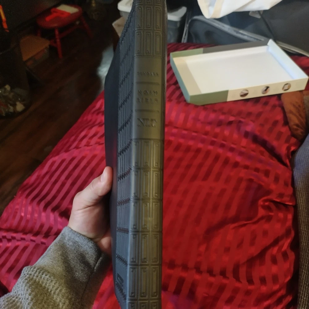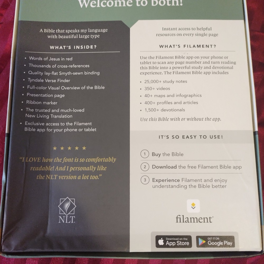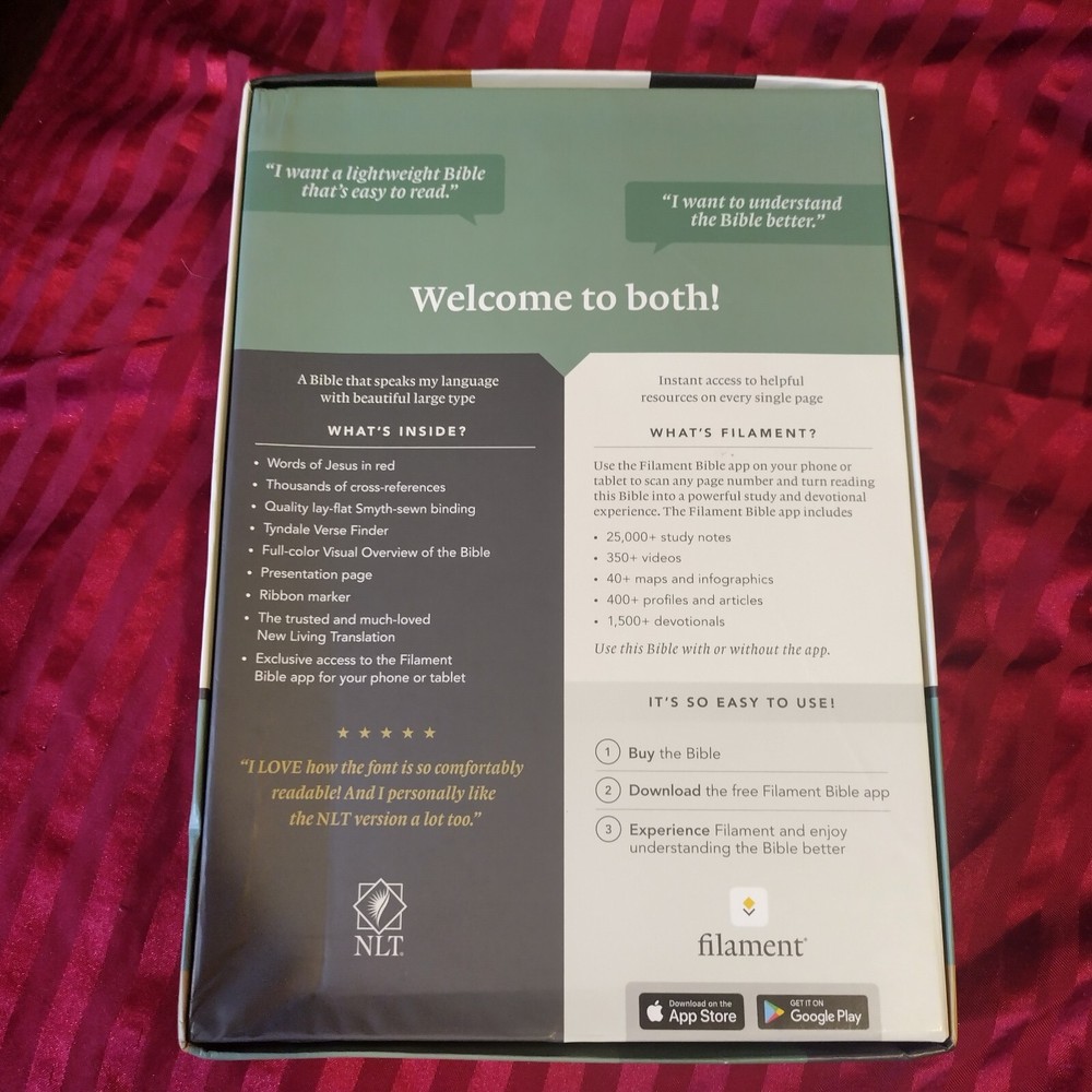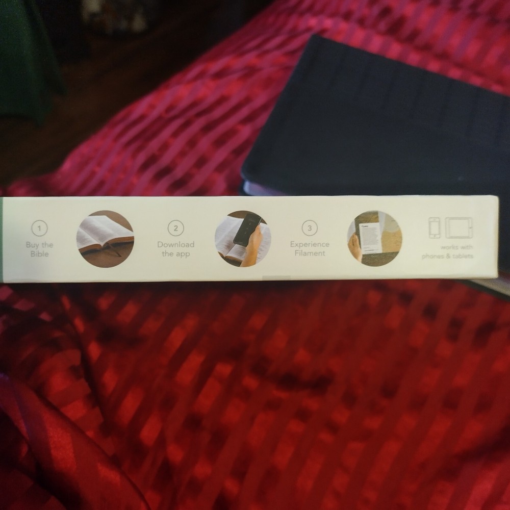 OUTSIDE COVER CRINKLED AT CORNER NLT Large Print Thinline Reference Bible, Filament Enabled Edition (Red Letter, Leatherlike, Black) - (Leather Bound) The Bible Reading Experience: Reimagined The new Tyndale classic NLT Large Print Thinline Reference Bible, Filament-Enabled Edition has readable text, an attractive layout, and cross-references in a thin, easy-to-carry size. And while it has the same low price as basic text-only Bibles, the NLT Large Print Thinline Reference offers much more. It not only features a bold new design and the trusted and much-loved New Living Translation (NLT) but also includes the groundbreaking Filament Bible app. This app enables you to use your mobile phone or tablet to connect every page to a vast array of related content, including study notes, devotionals, interactive maps, informative videos, and worship music. The Filament Bible app turns this Bible into a powerful study and devotional experience, offering more to expand your mind and touch your heart than you can possibly hold in your hand. And there is no additional cost for the Filament Bible app. No additional purchase. No additional size or weight. Of course, you can use this Bible without the app, but when you want to dig deeper, grab your phone or tablet and open the Filament Bible app. It's so easy to use. Features: New designs and Filament content for each page! Readable large print Handy thin size Words of Jesus in red Thousands of cross-references Quality lay-flat Smyth-sewn binding Tyndale Verse Finder Presentation page Ribbon marker Gilded page edges Filament Bible app with free access to: 25,000 study notes 350+ videos 40+ maps and infographics 400+ profiles and articles 1,500+ devotionals Library of worship music Specifications Dimensions (Overall): 10.3 Inches (H) x 7.3 Inches (W) x 1.2 Inches (D) Weight: 2.05 Pounds Suggested Age: 22 Years and Up Number of Pages: 1120 Genre: Religion Sub-Genre: New Living Translation Publisher: Tyndale House Publishers Format: Leather Bound Language: English Street Date: September 8, 2020 TCIN: 80984009 UPC: 9781496444905 Item Number (DPCI): 247-65-4420 Origin: Made in the USA or Imported