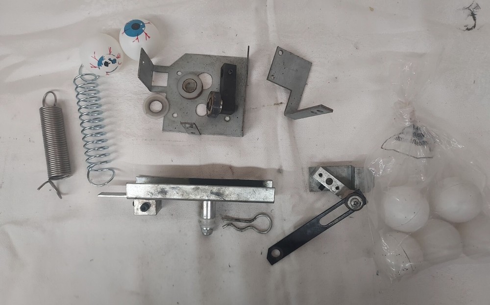 All parts are in good usable condition, you get all the parts pictured. The artwork on the balls is gone on the 5 balls in the bag. Pulled off a 1993 Godzilla Wars Jr. Arcade ticket redemption game by Namco. Please let me know if you have any questions and thanks for looking!