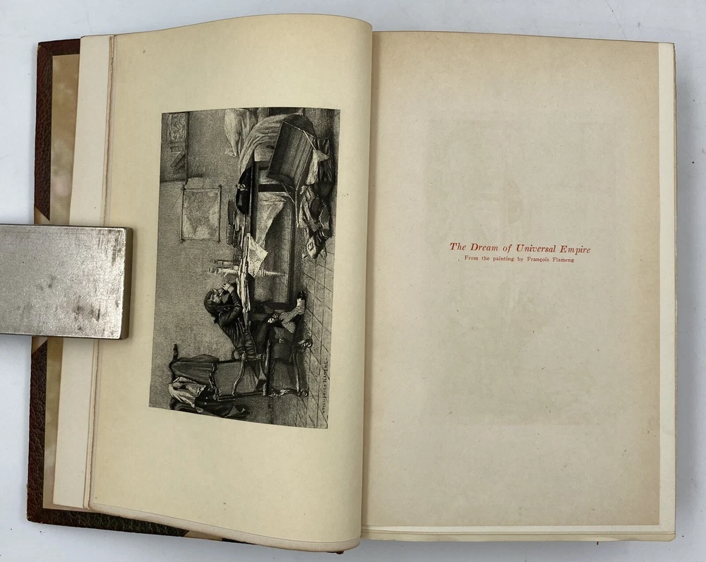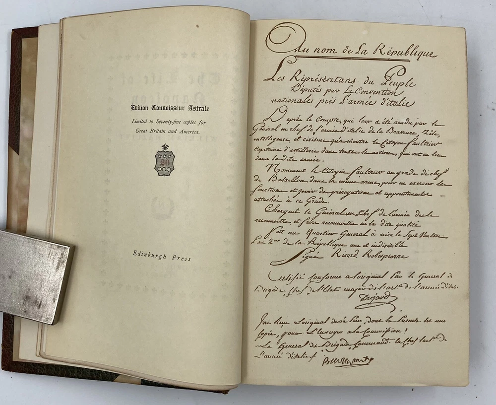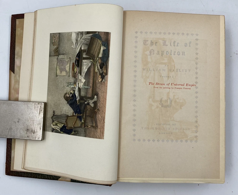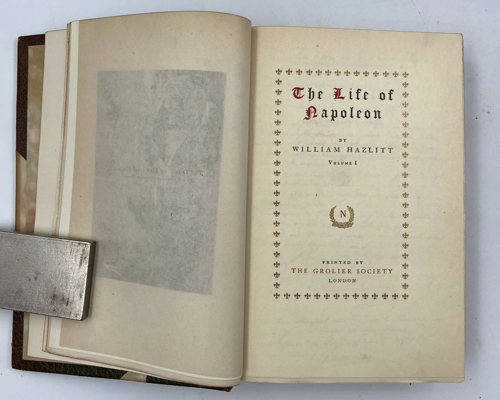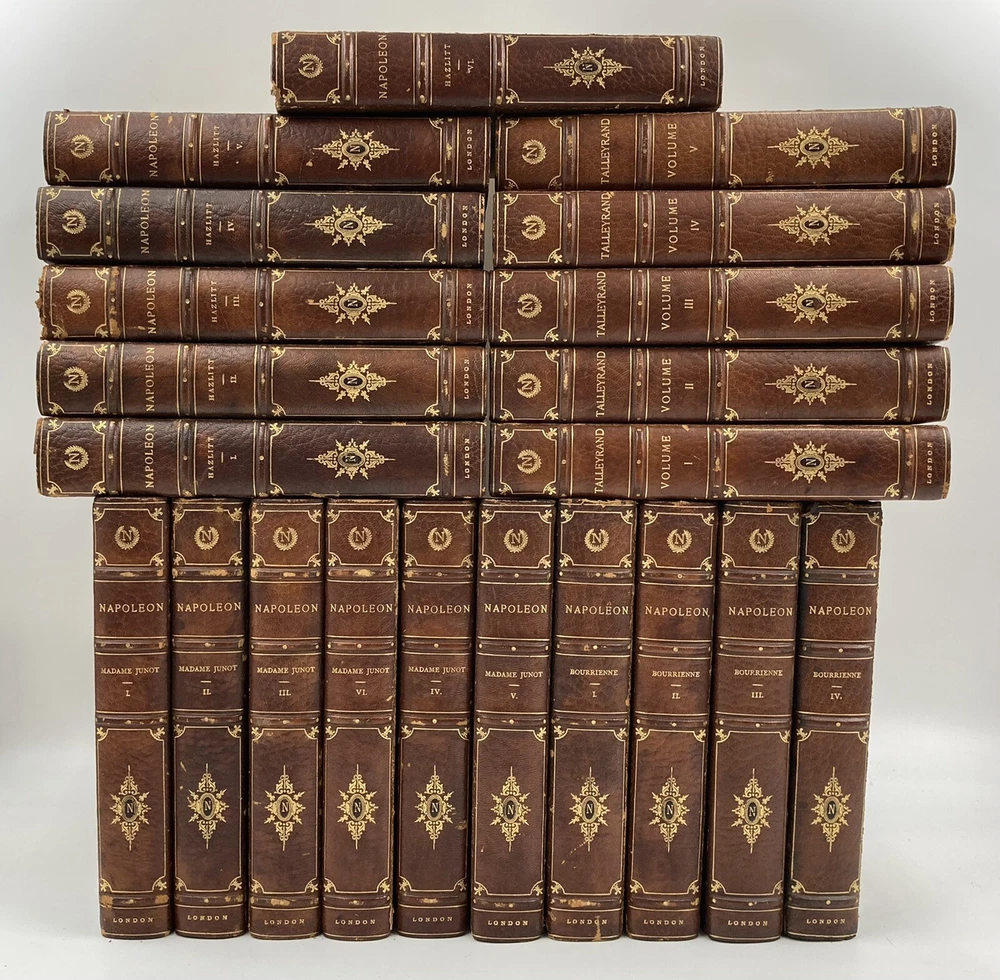 London: The Grolier Society, no date, circa 1900. Twenty-one volume matched set of the Edition Connoisseur Astrale. With a stated limitation of 75 copies printed for Great Britain and America, this is copy number 20. Bound in three-quarter crushed morocco, with gilt lettering and decoration, rubbing to edges, spines evenly toned to brown, pages clean and binding sound. Title-pages printed in red, gold and black, photoreproduction frontispieces and plates, portraits, facsimiles, etc., each in two states (colored and uncolored). Each plate accompanied by guard sheet with brief descriptive letterpress in red. Comprised of four subsets: The Life Of Napoleon Bonaparte , William Hazlitt; Vols. I-VI Memoirs of Napoleon , Louis Antoine Fauvelet De Bourrienne; Vols. I-IV Memoirs of Madame Juno t (Duchesse D'Abrantes); Vols. I-VI Memoirs of the Prince De Talleyrand, edited by The Duc De Broglie; Vols. I-V