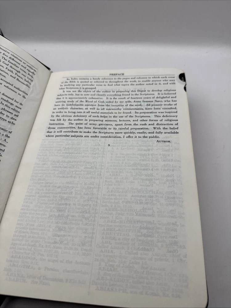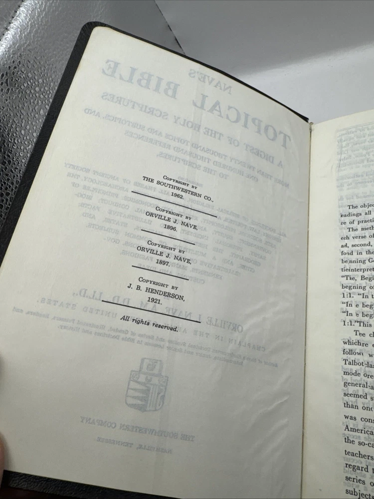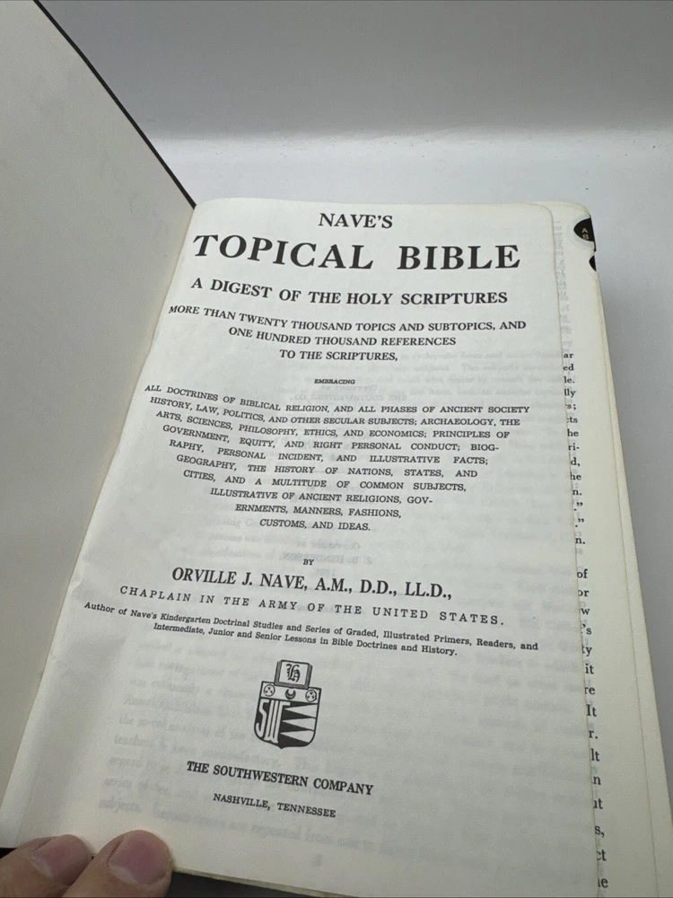 Nave's Topical Bible is an amazing reference for Bible study—deep, well-organized, and easy to use. The 1962 Southwestern edition has a classic faux leather cover and holds up nicely for its age. Perfect for all ages, whether searching scriptures or diving deep into topics. The indexed format makes it super handy for teaching or personal growth. A must-have for any Christian library!