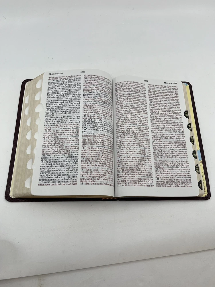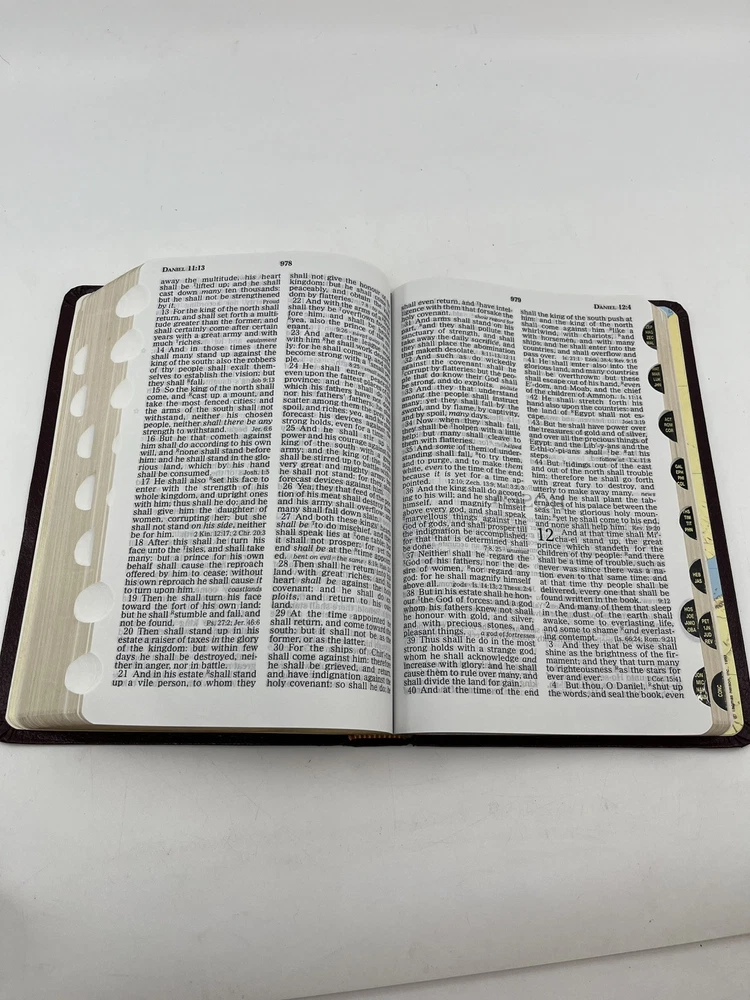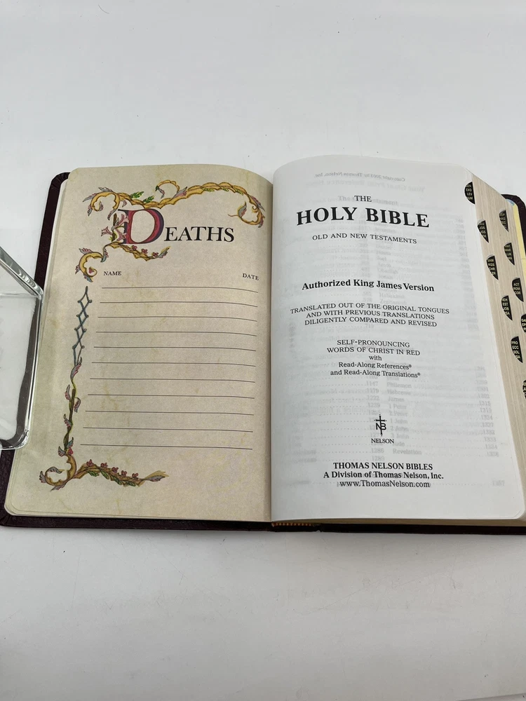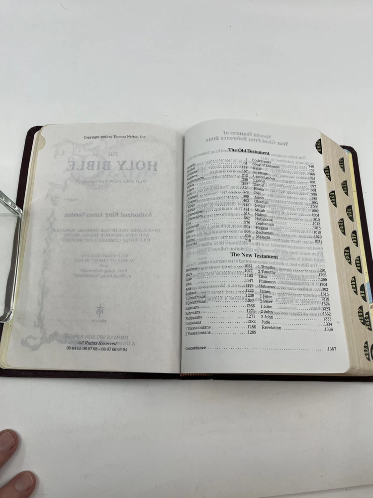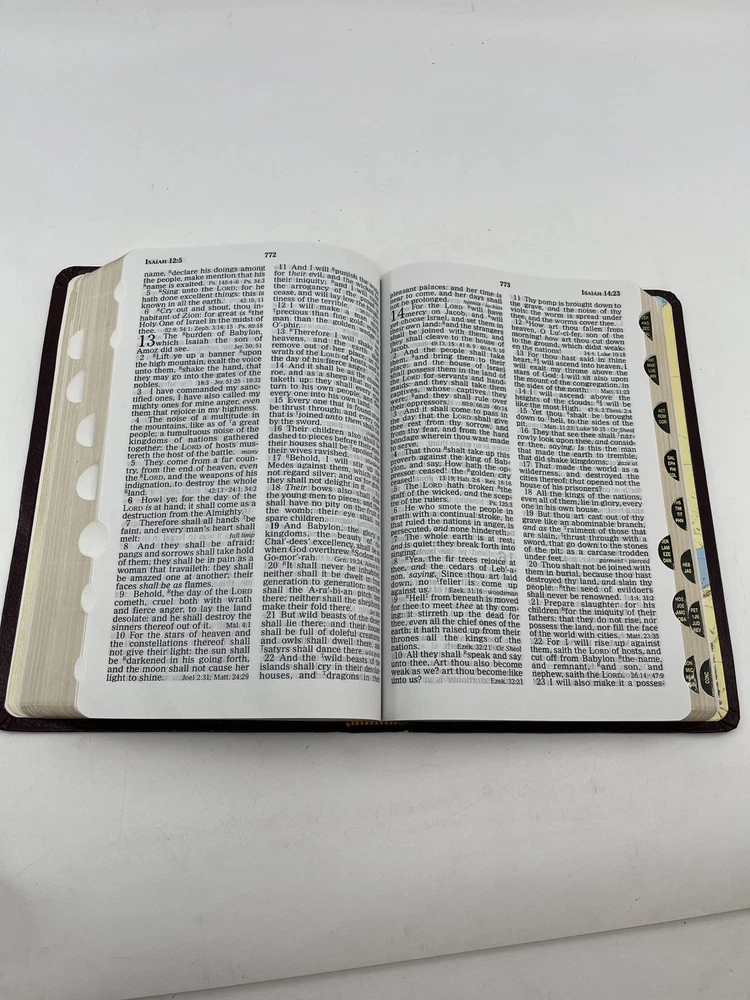 Bible is preowned but in very good condition. There are no marks, highlighting, notes or underlining on any of the pages. The front cover has a slight crease - see photo 24....