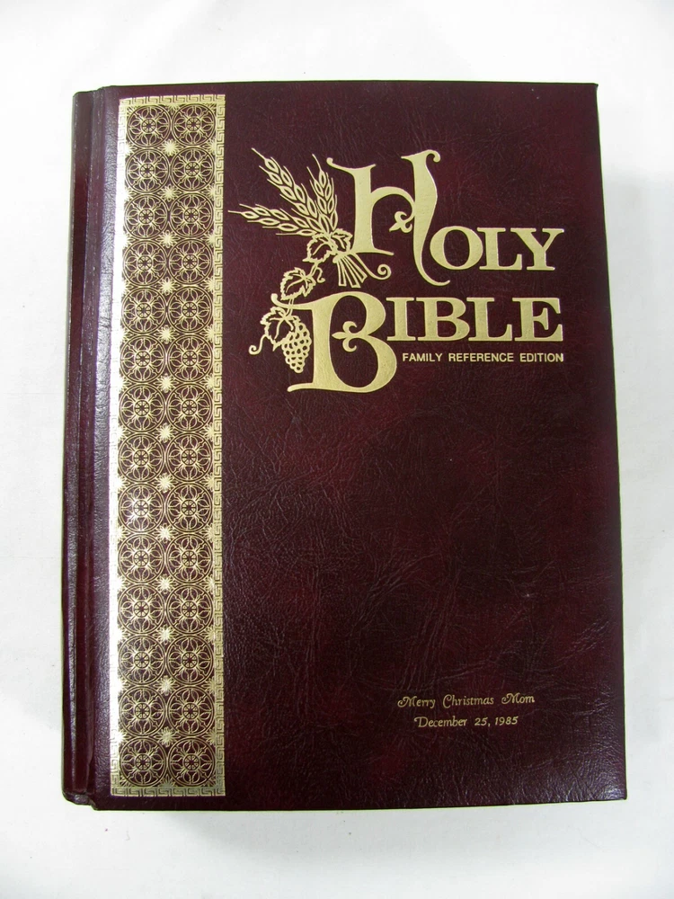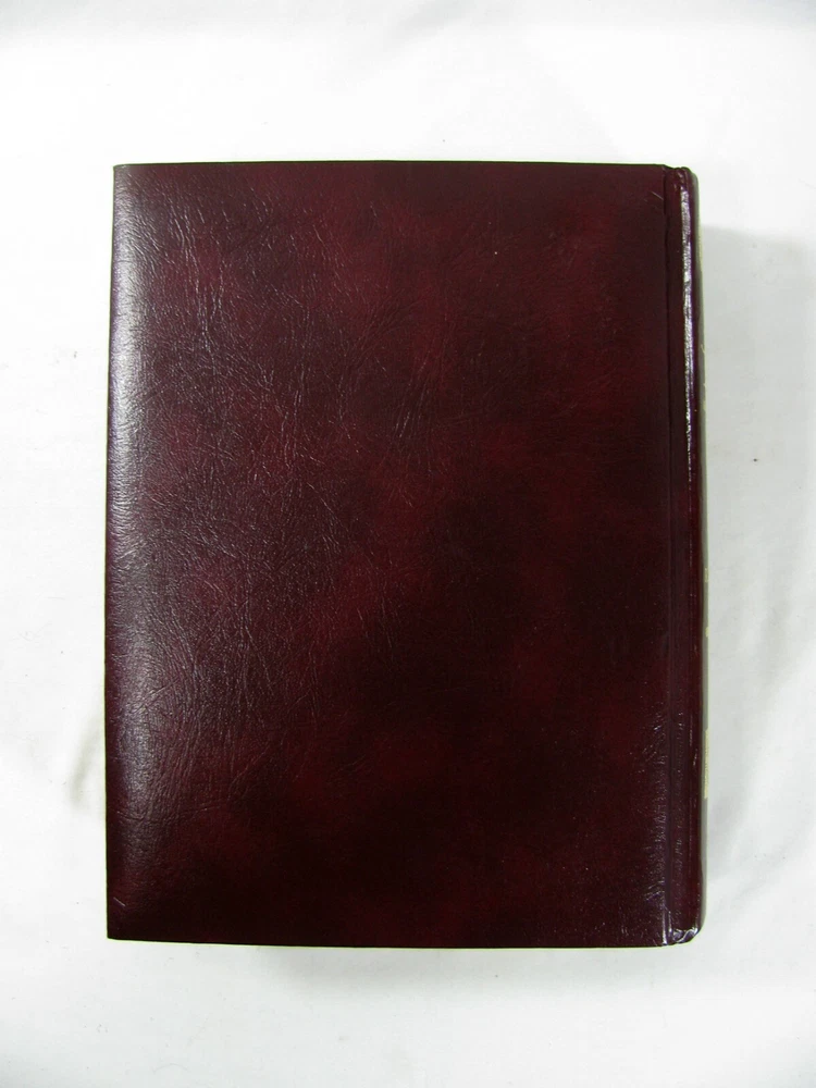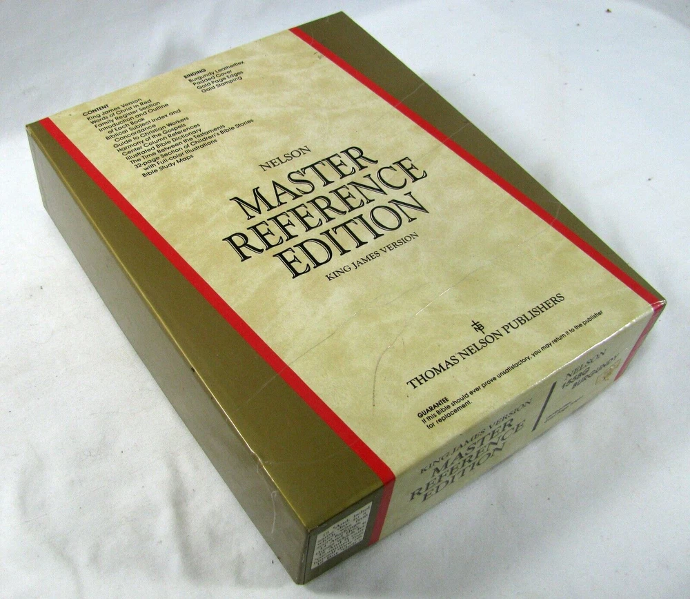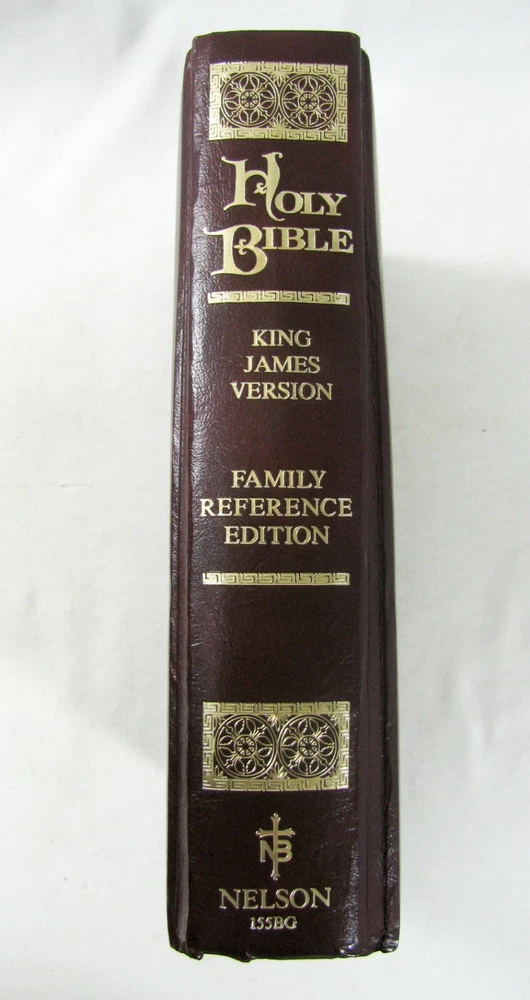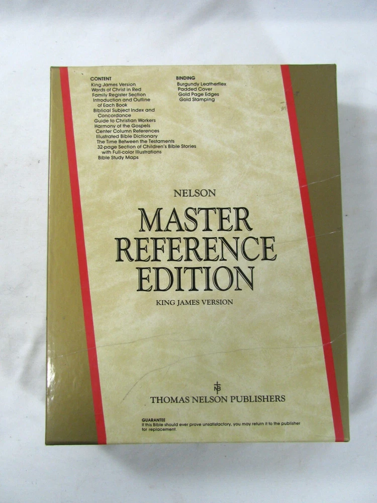 Nelson Bible Master Reference Edition King James Version Burgundy #155BG Burgundy Leatherflex Padded Cover Gold page edges Words of Christ in Red Box is 9.5 inches x 12 inches There are some recorded names and dates on the inside family record pages. Gold lettering inscribed on the right front corner of the cover. Good pre-owned condition. Please see all pictures. Please check the photos for the best description but if you have any questions, feel free to write us.