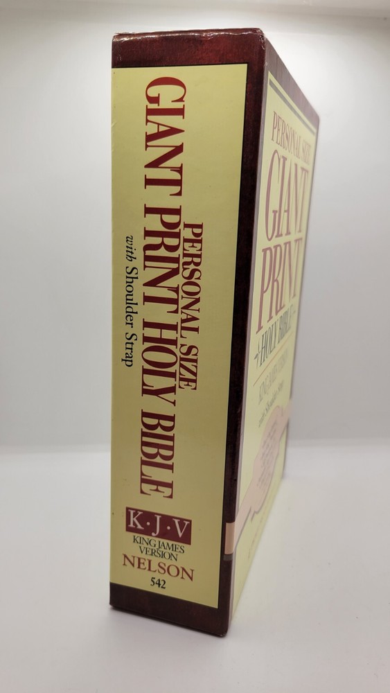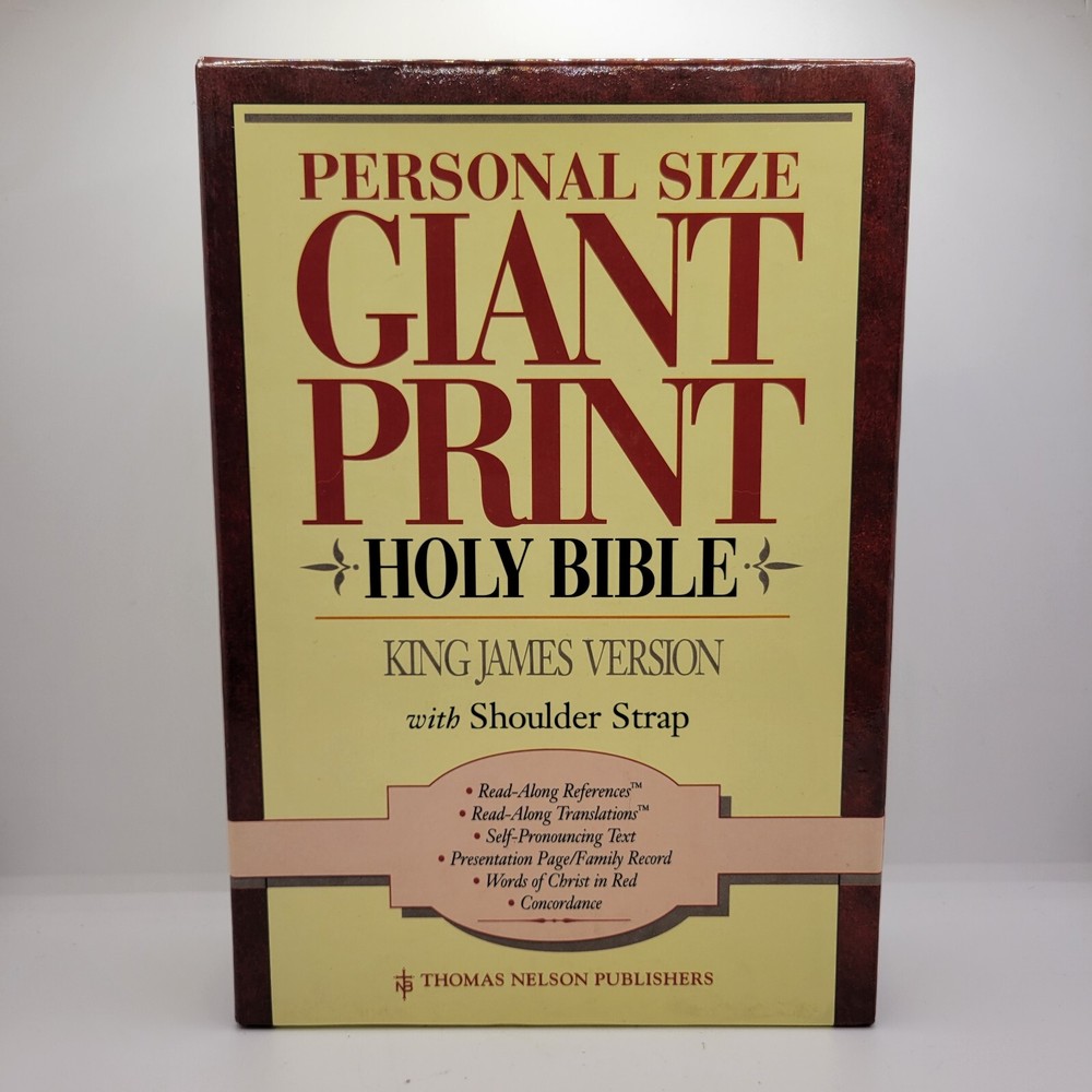 Nelson Bible Personal Size Giant Print Leather KJV Shoulder Strap 542 Red Letter Appears unused, in original box, with shoulder strap. So many features - Black leather bound, magnetic latch on protective cover, words of Christ in red, concordance, colored maps, giant print. Please see all pictures.
