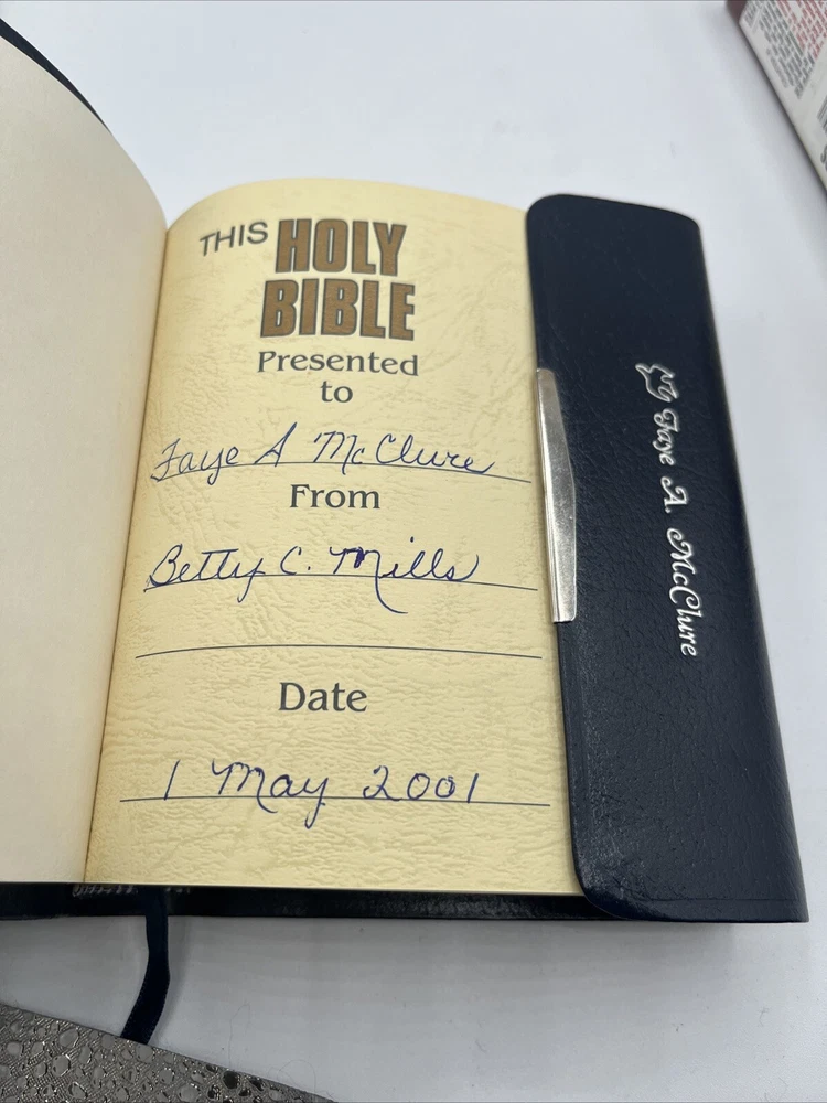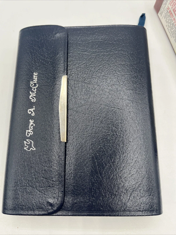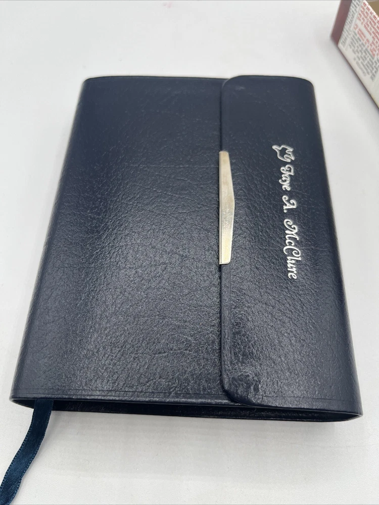 Good Pre-owned condition. With box. Does have personalization on the front and handwritten in. Blue Genuine bonded leather....