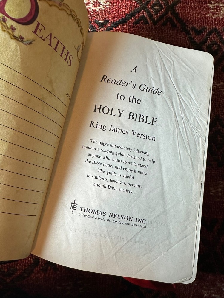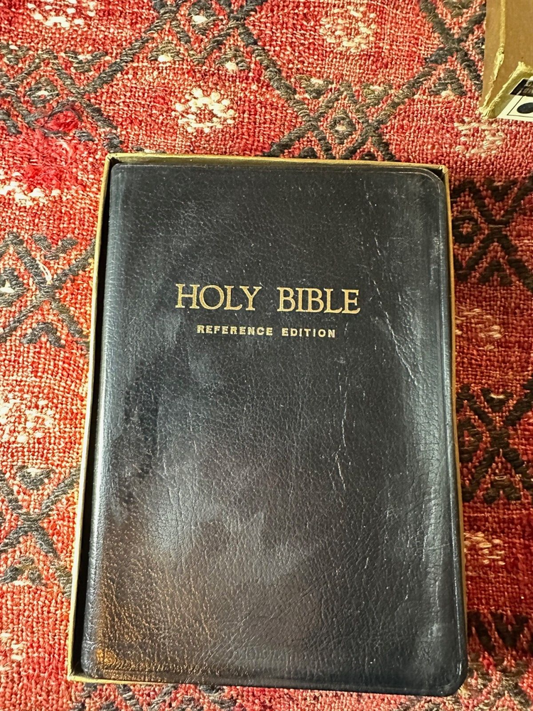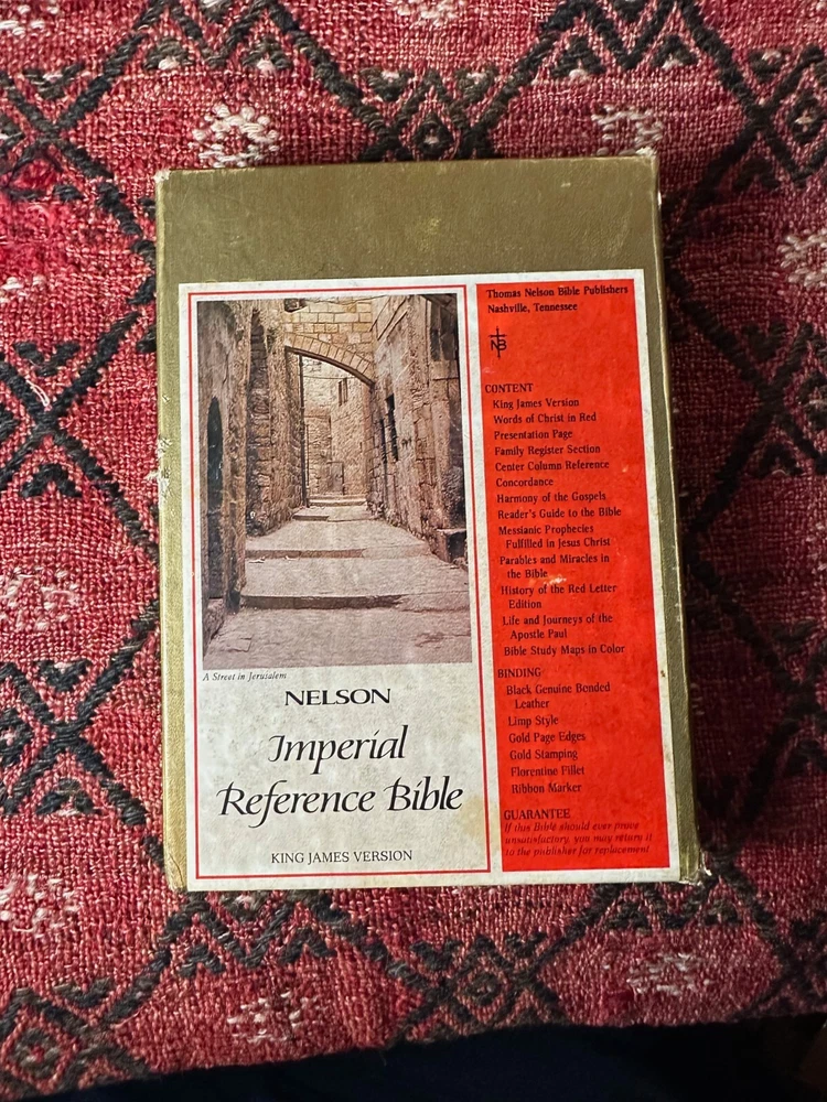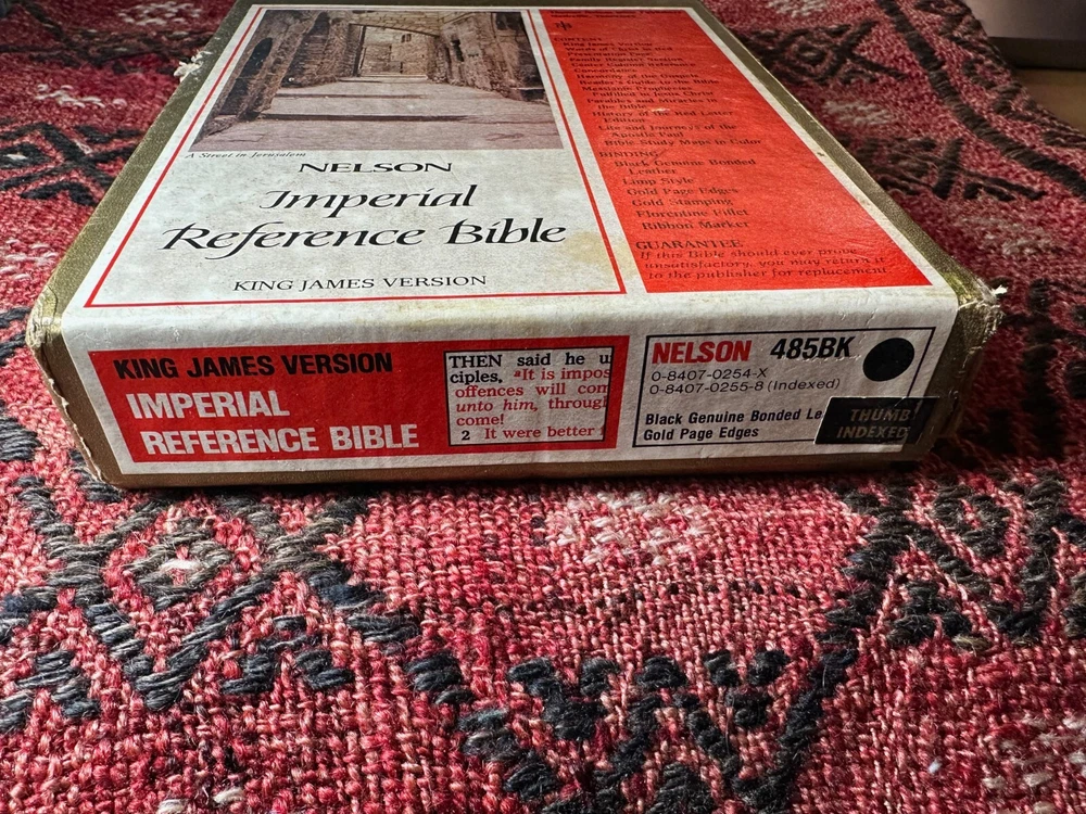 Nelson King James Version - Imperial Reference Bible Black 485BK Leather, Thumb indexed with orginal box Bible is in very good condition, some writing inside on the first page, a few wrinkled pages... normal wear for a book 50 years old -- box is functional, has two torn corners, see photos of actual item. CLEAN COPY/NO MARKINGS ON THE INSIDE